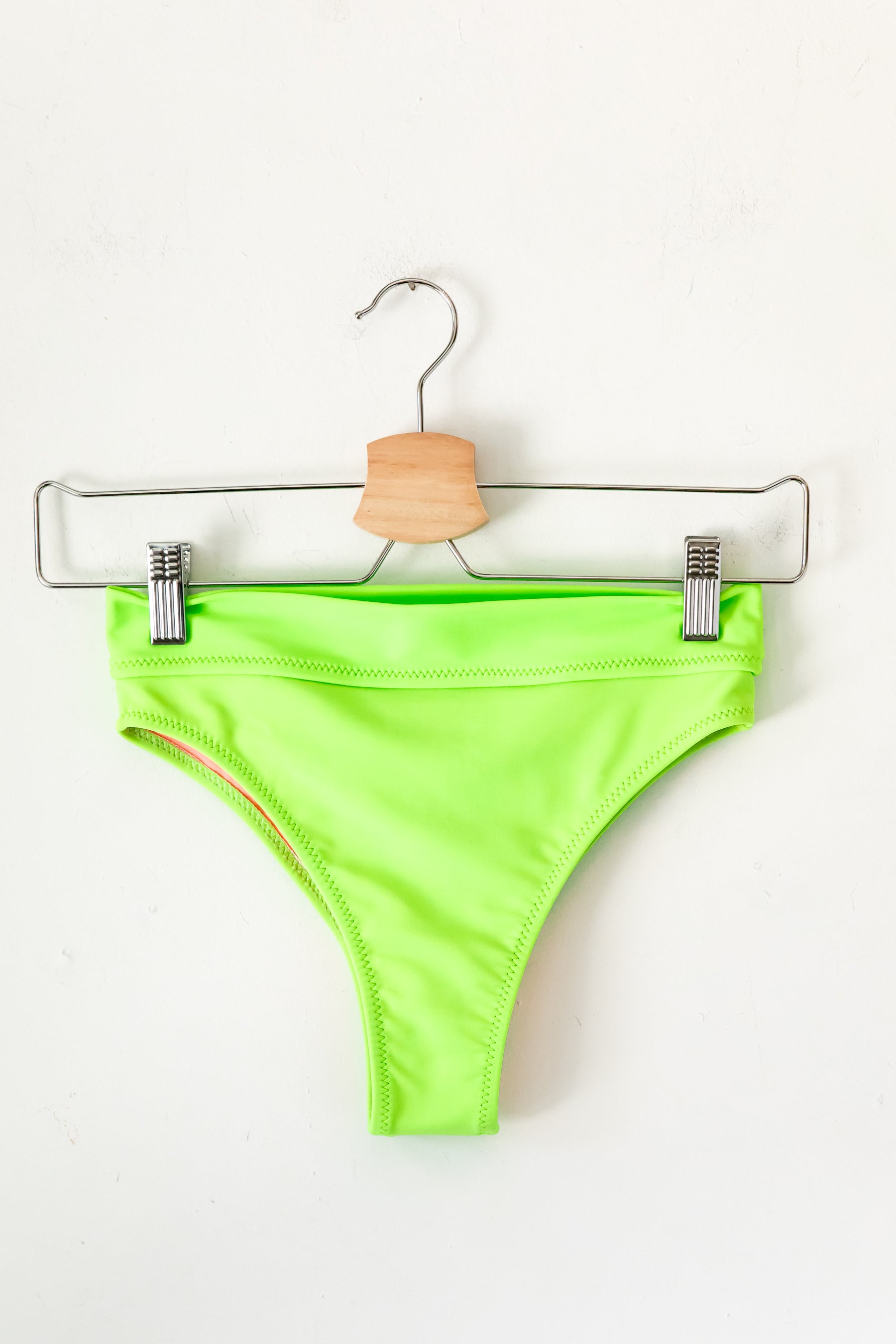 Classic high waisted bikini bottoms in a bright neon green with moderate coverage. Pair with the Zebra Luna top for the complete look.
