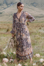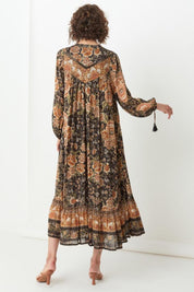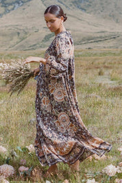 The swoon-worthy Mystic Gown with its radiant signature print, and the most hypnotic color palette, is a piece with presence. Featuring a shell button-down front, V-neckline and back yoke with trim insert and print placement, this glorious dress evokes a simple, stylish serenity.
