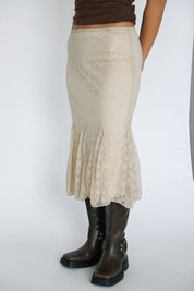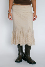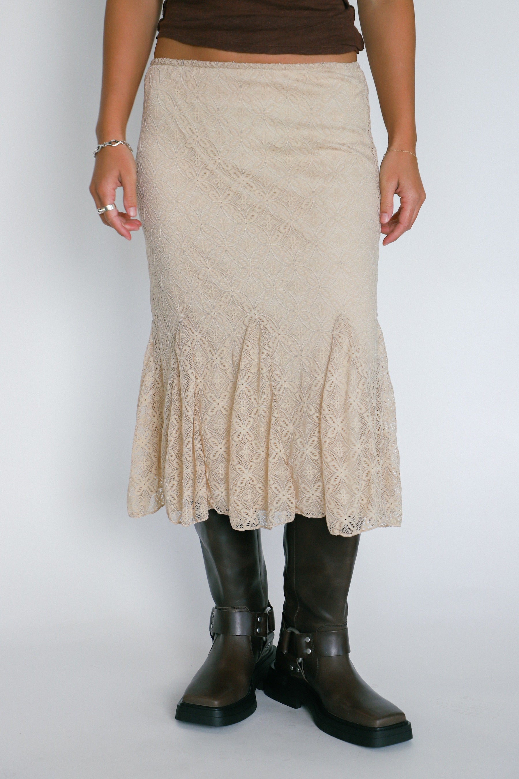 The Betharia skirt features a low rise elasticated waist with waterfall midi length hem in nude lace.