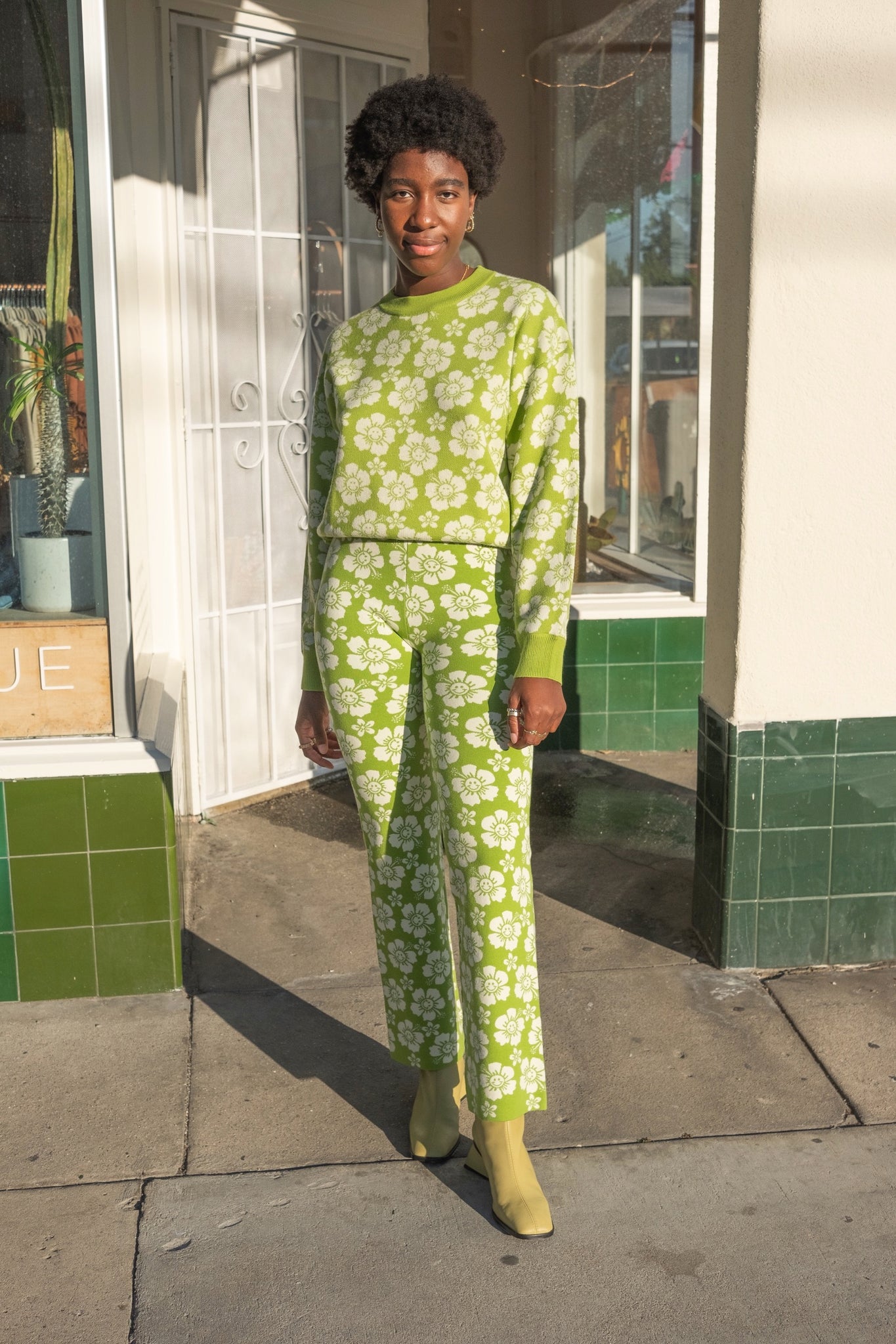 Classic sweater fit with contrast ribbing, featuring a signature Happy Hawaii print in olive. Pairs perfectly with the Olive Happy Hawaii Knit Pant.