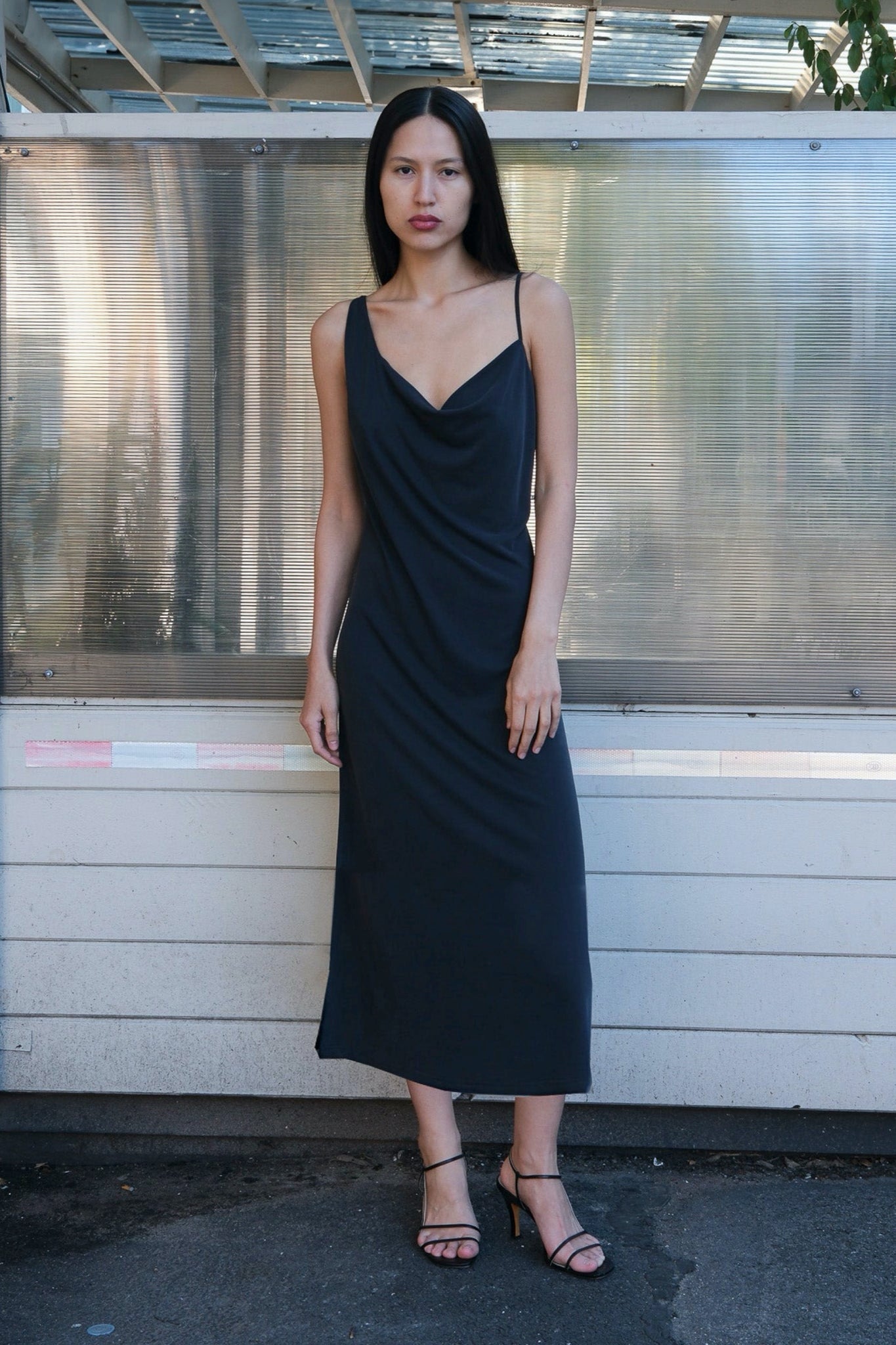 An asymmetric midi length dress with a side slit and an adjustable strap.