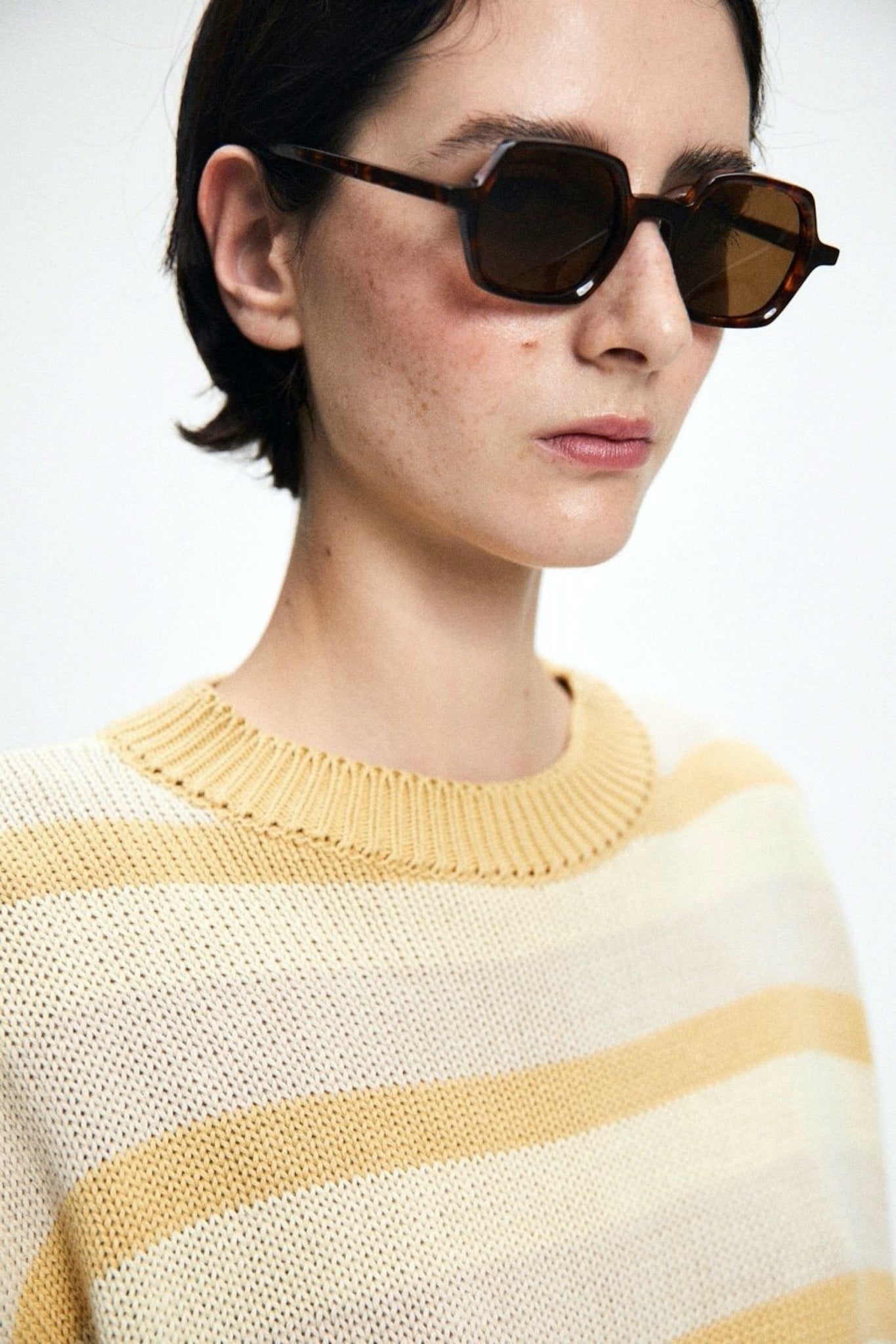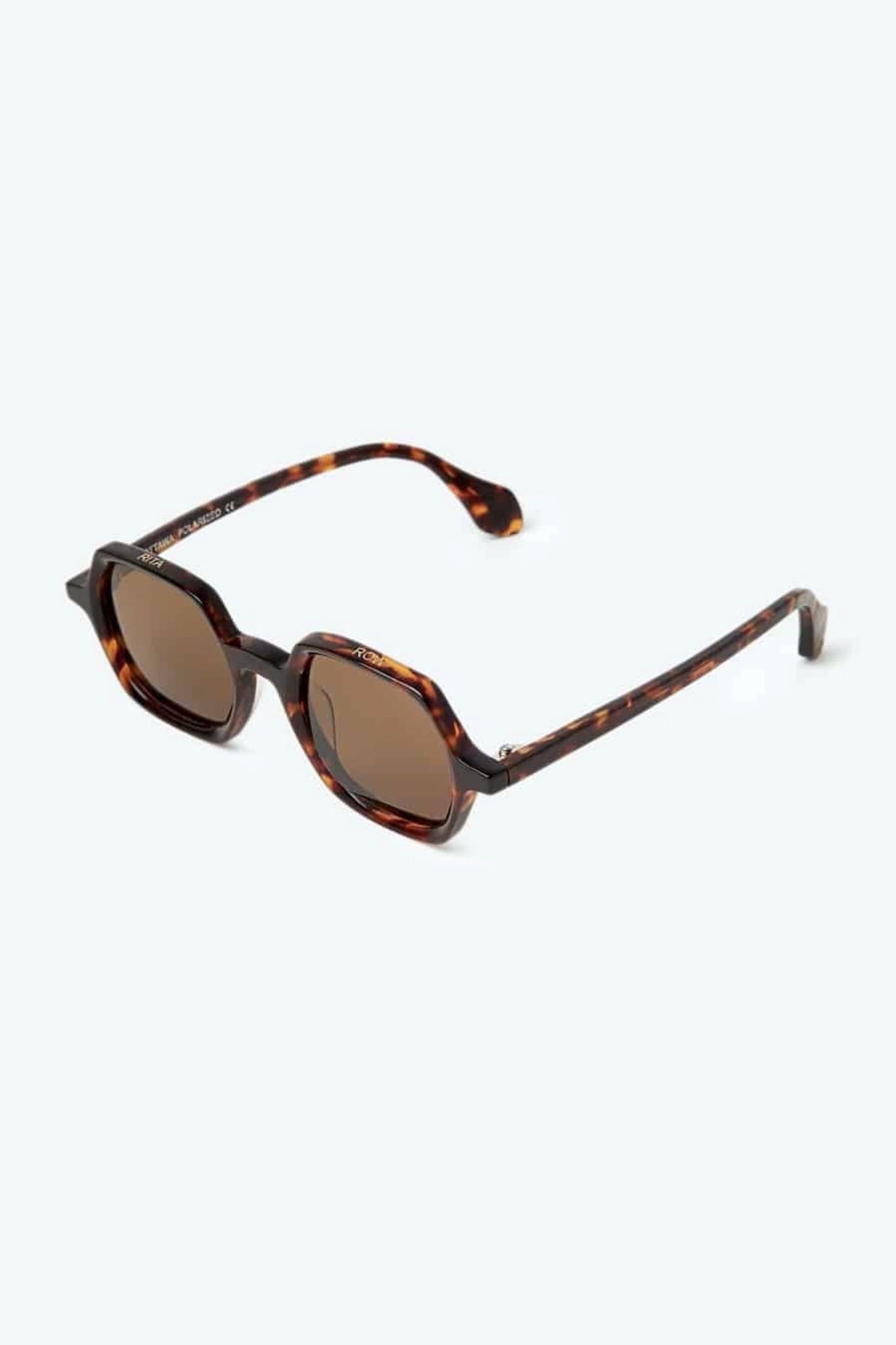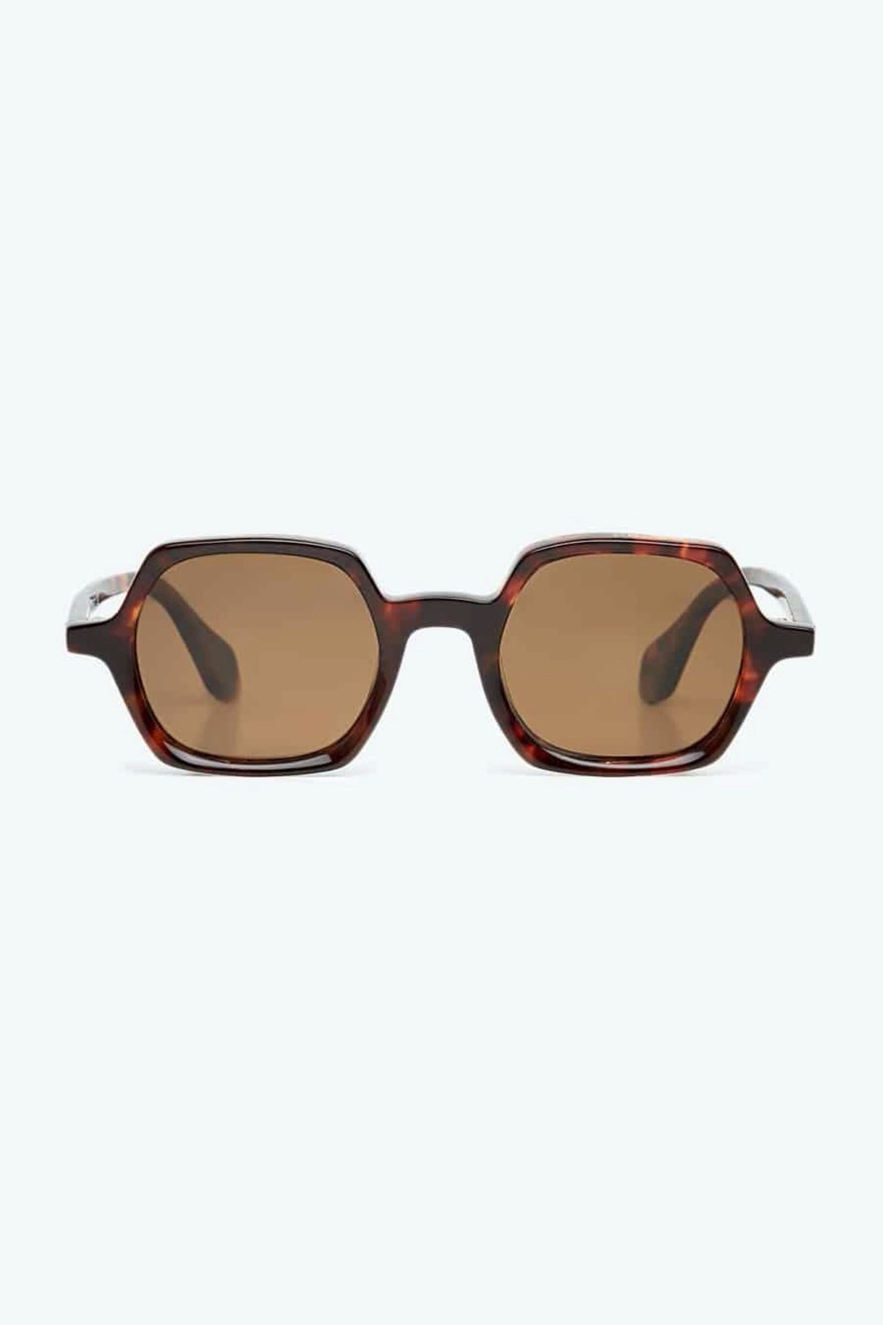 Pantos-shaped sunglasses with round bridge and flat eyebrow. Acetate front and temples. Exterior logos on the upper part of the front of the frame. Polarized lens with 100% UV protection. Category 3 lens.