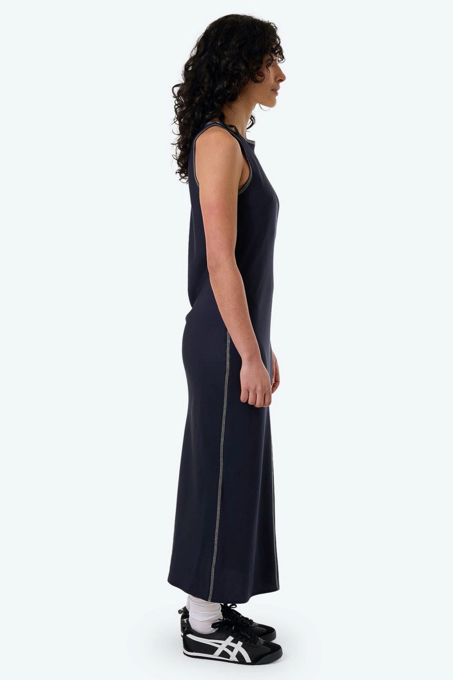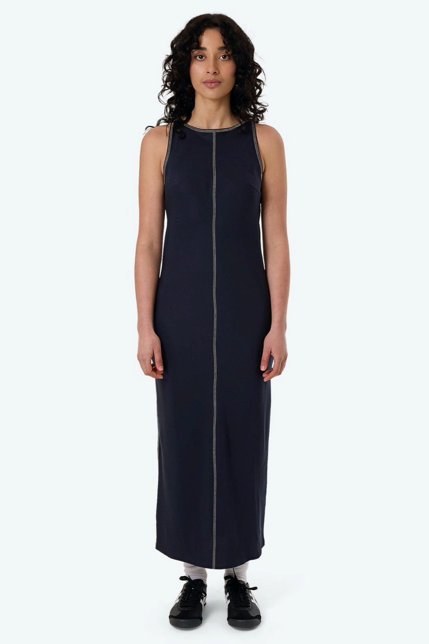 Embrace sleek minimalism with the Contour Slip Midi Dress in Peacoat. This full-length dress features a figure-skimming silhouette with contrast stitching for a subtle yet striking edge and an effortless tank-style cut.