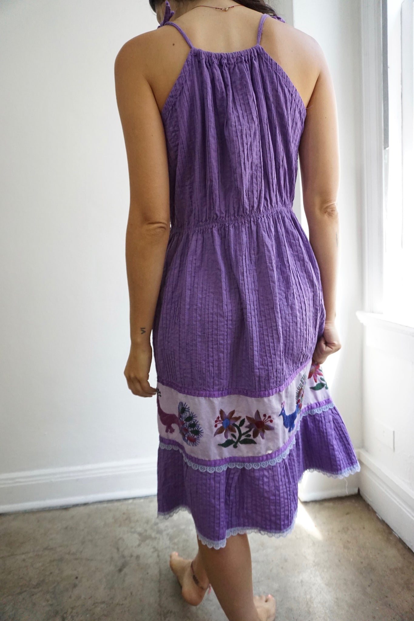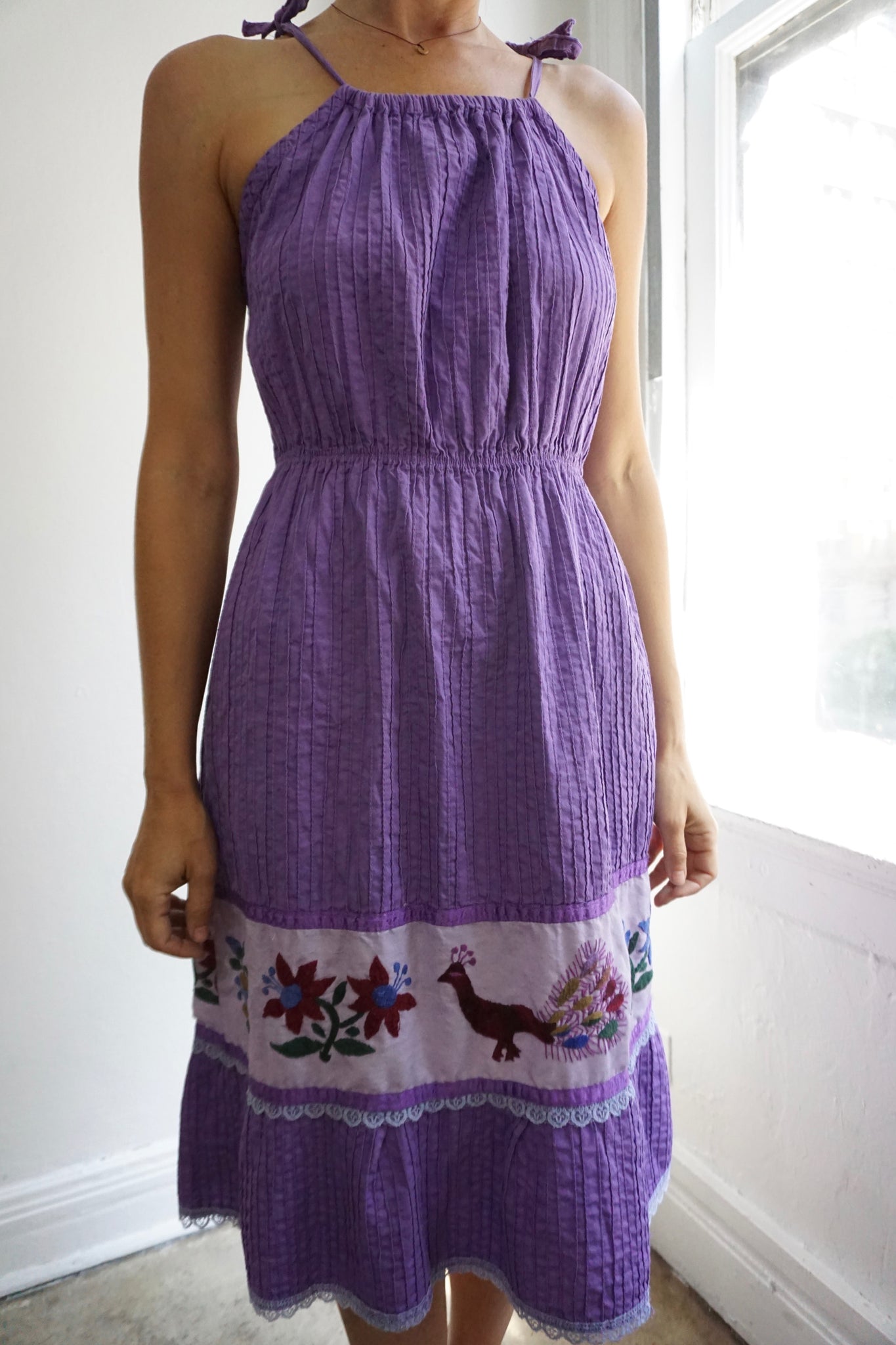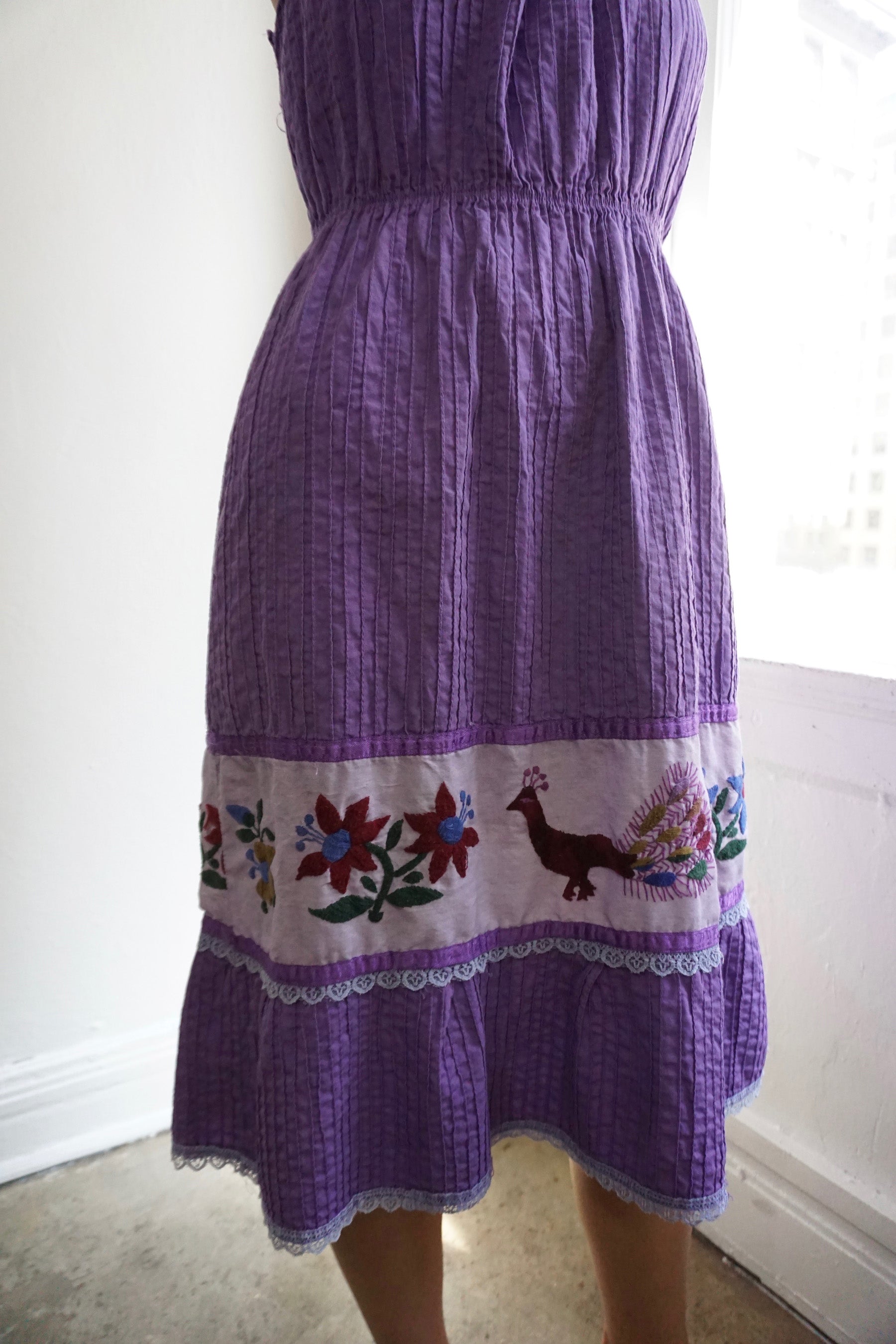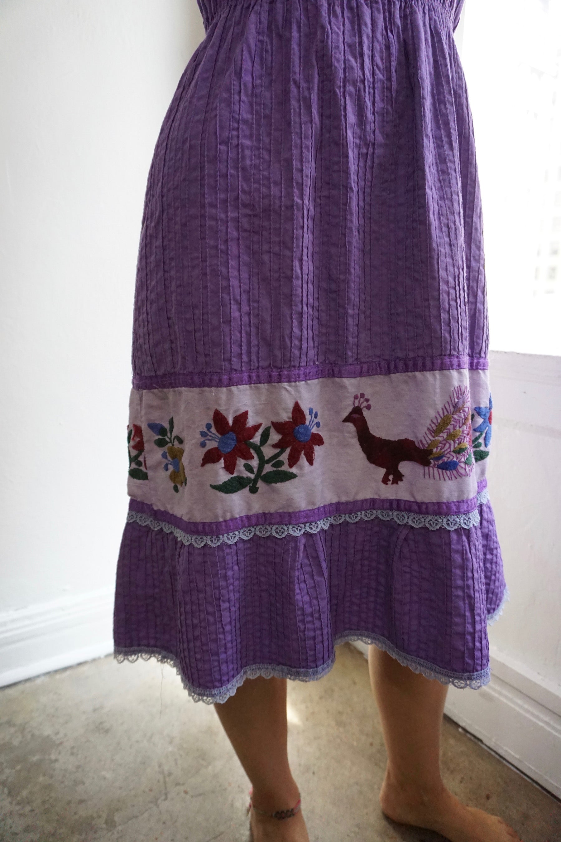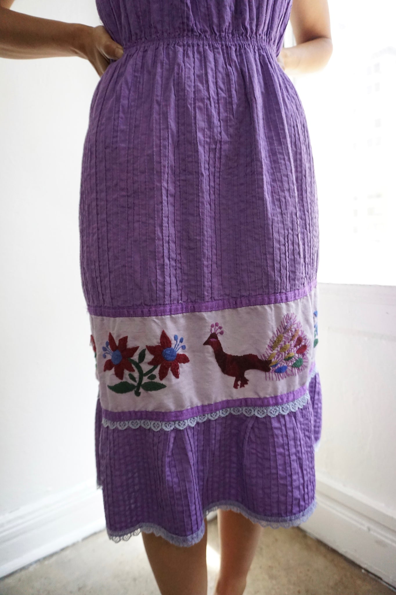 Purple cotton sun dress w/ pin tucking throughout. Elastic waist. Embroidered panel on skirt w/ peacocks & flowers.