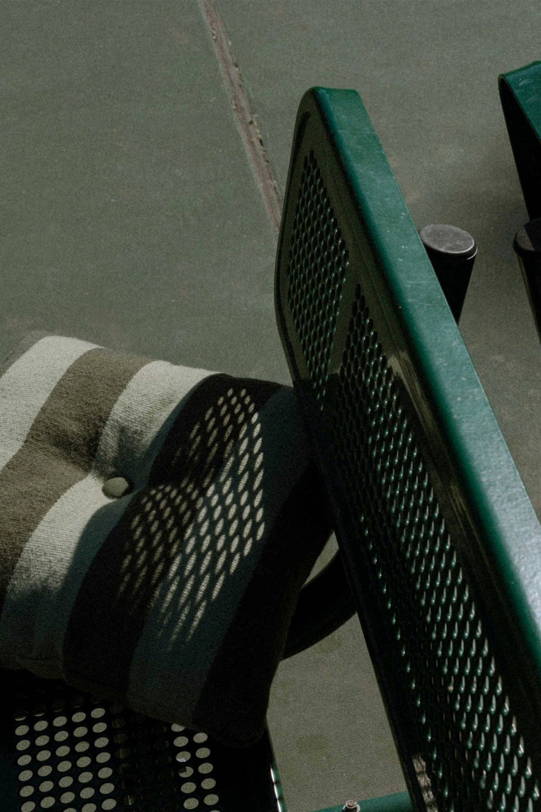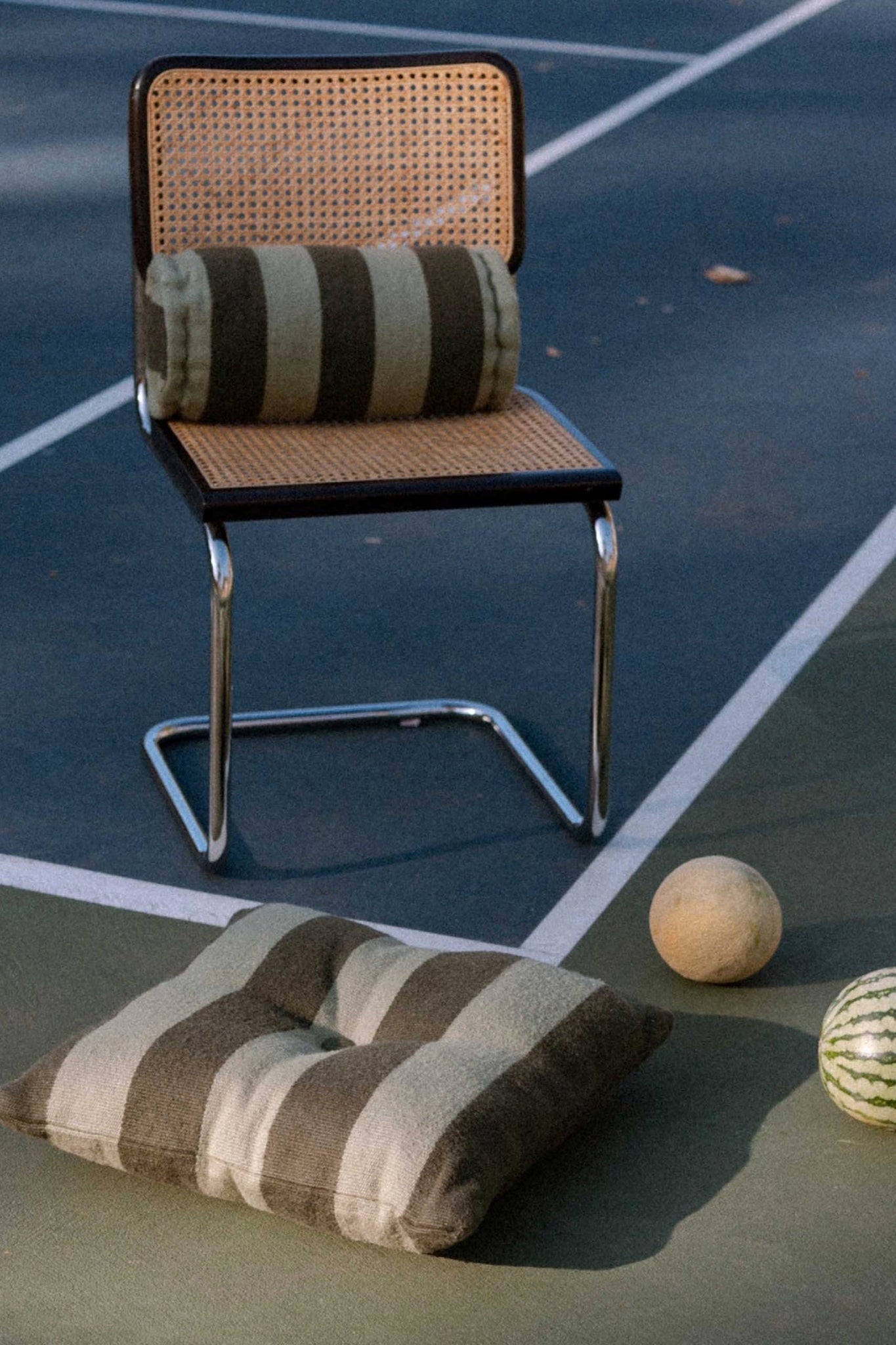 The Hugo Pillow is made from a beautiful wool/cotton blend featuring a hand woven stripe design in alternating shades of cool green and a button sewn in the center to create a tufted effect. This easy pattern is also offered in a quirky cylindrical bolster pillow.