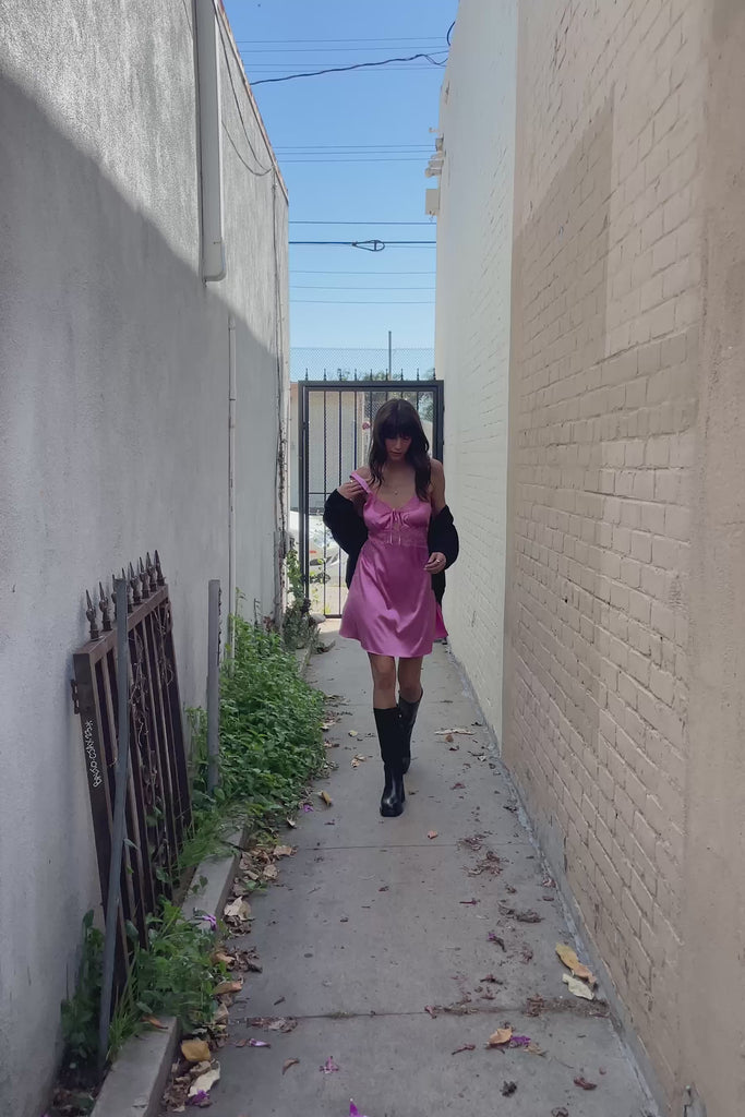Lacy satin mini slip dress featuring a chest cutout and tie closure.