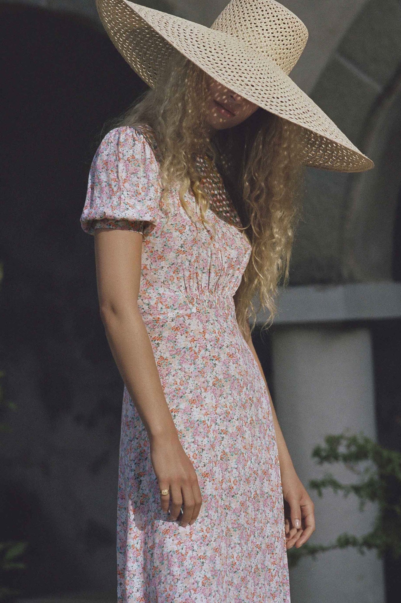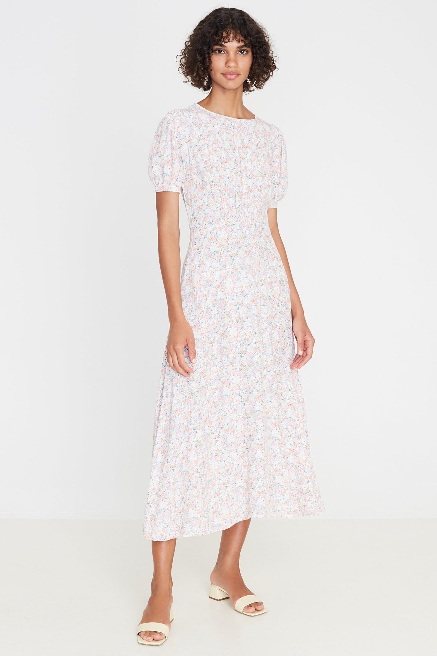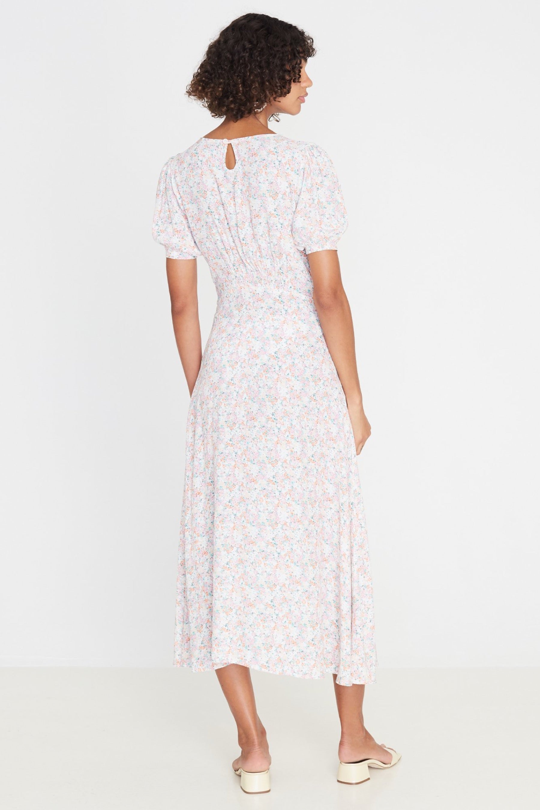 The Beline Midi Dress is a key look in the riviera collection. Featuring a vintage inspired, high cut neckline and delicate sleeves. Fixed through the waist, with an a-line midi length skirt and invisible side seam zipper. Pair with a heeled sandal for romantic, 60's inspired look.