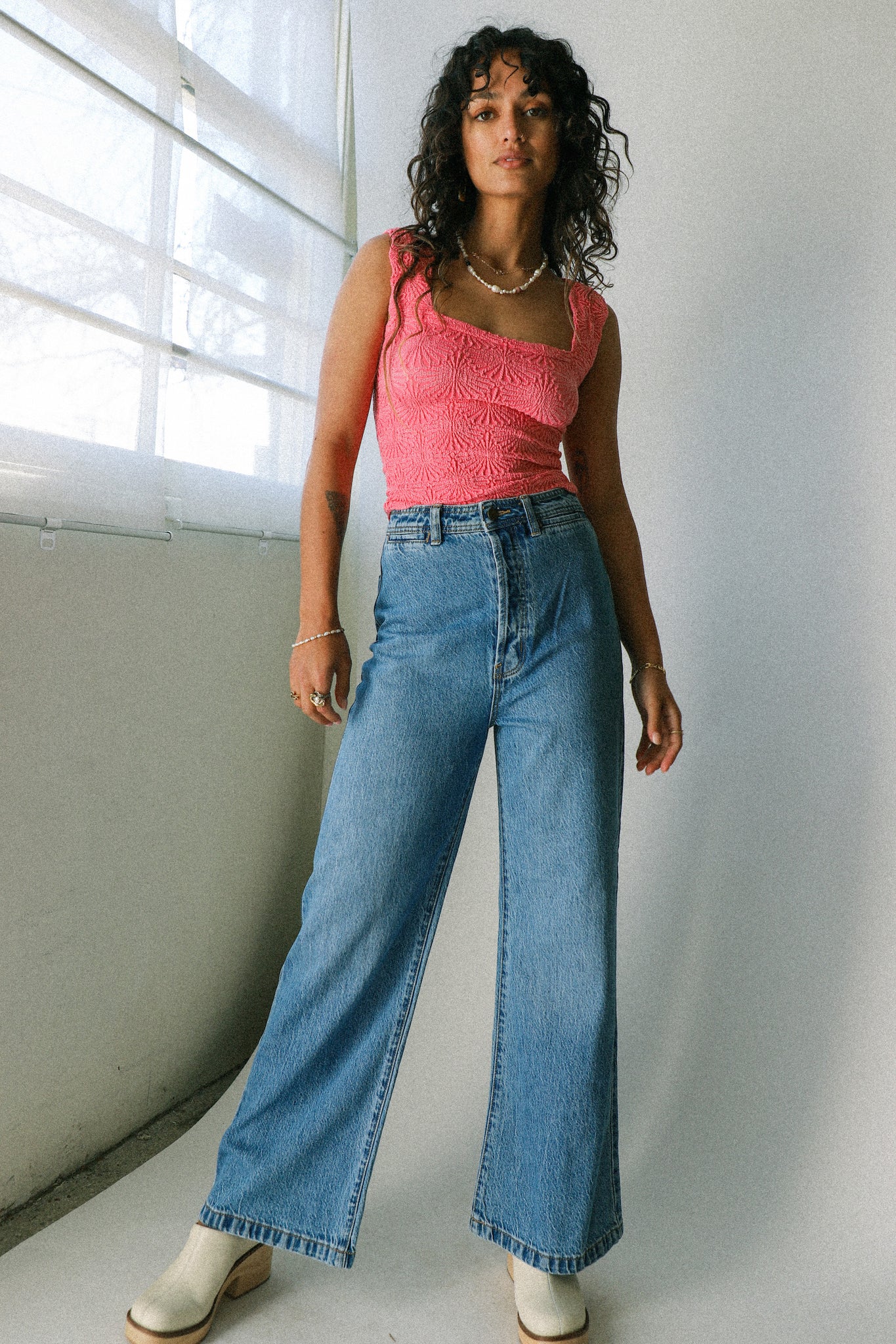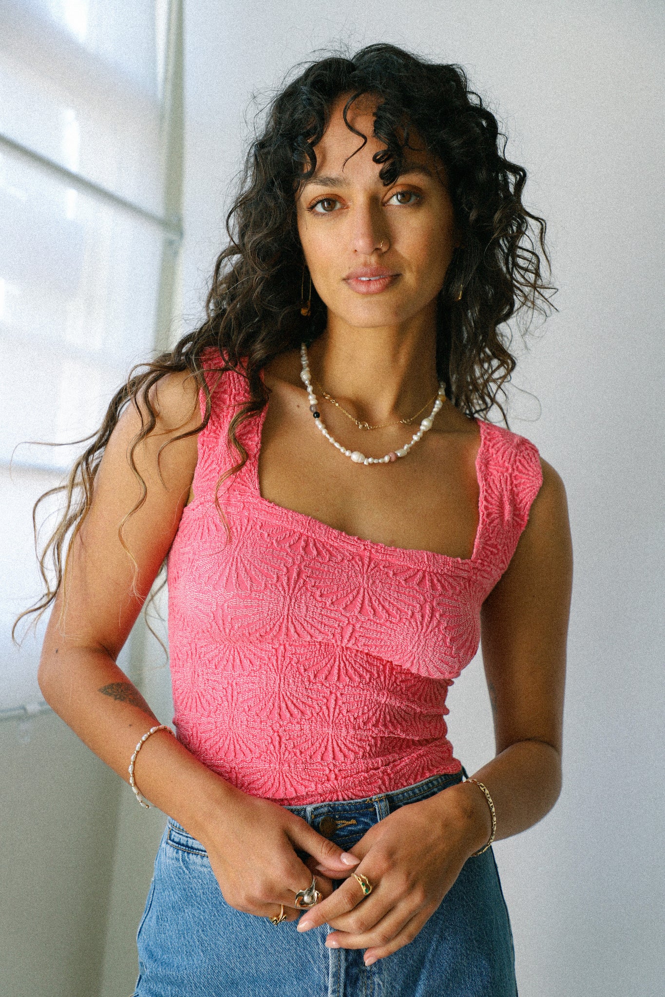 So sweet cami featured in a cropped, square-neck silhouette and jacquard floral design with statement lettuce-edge hemline.