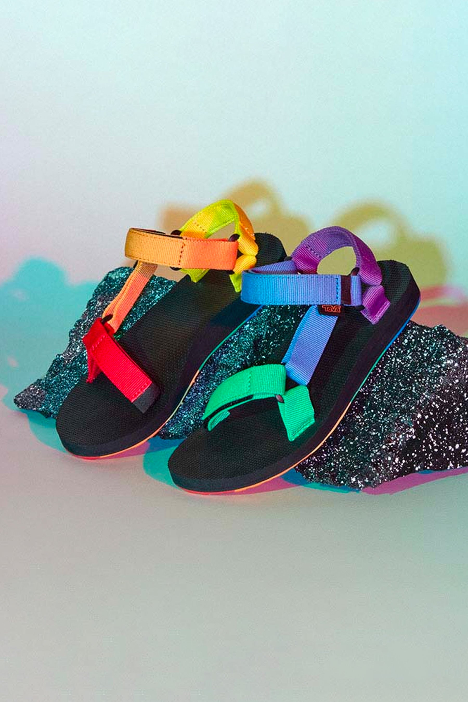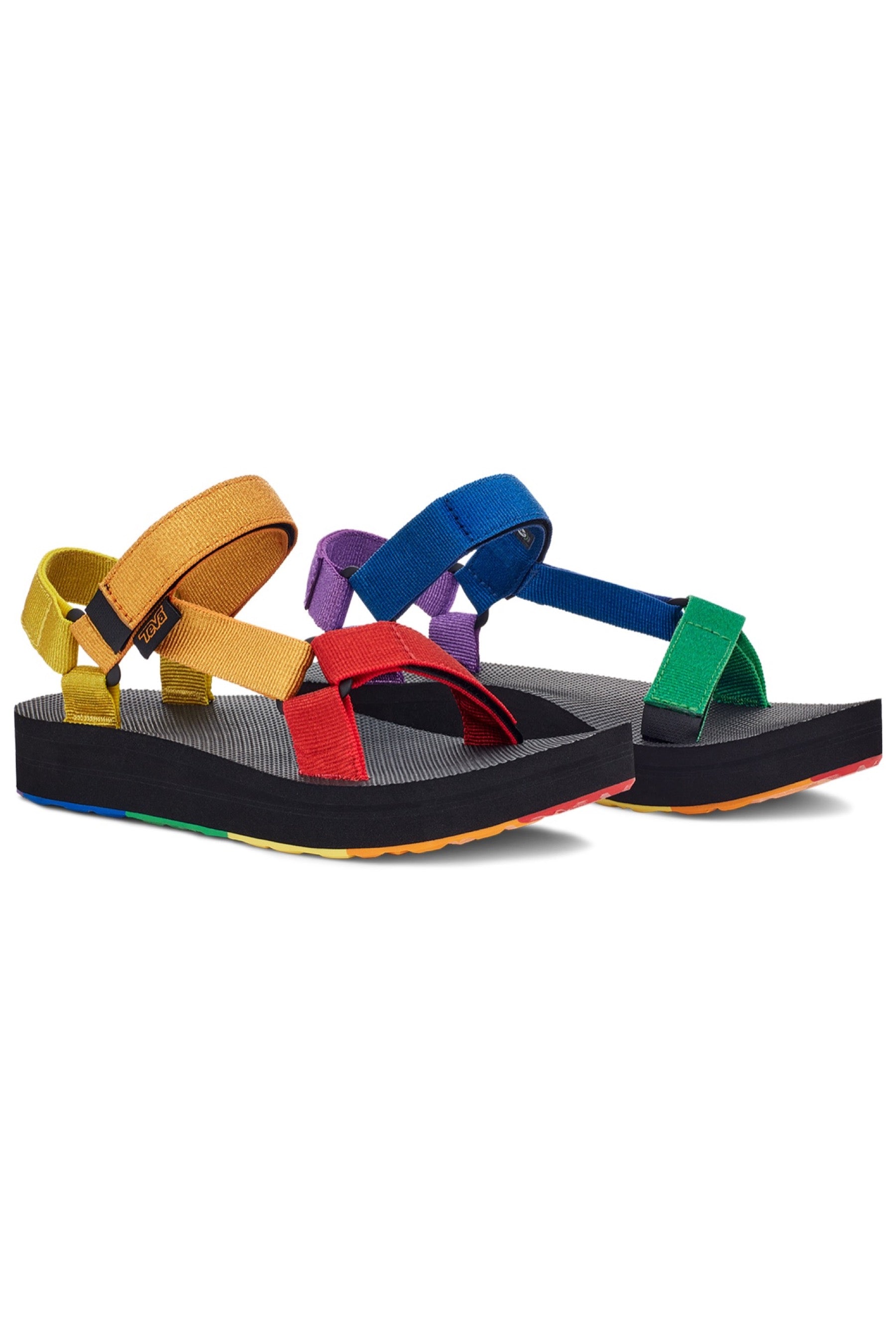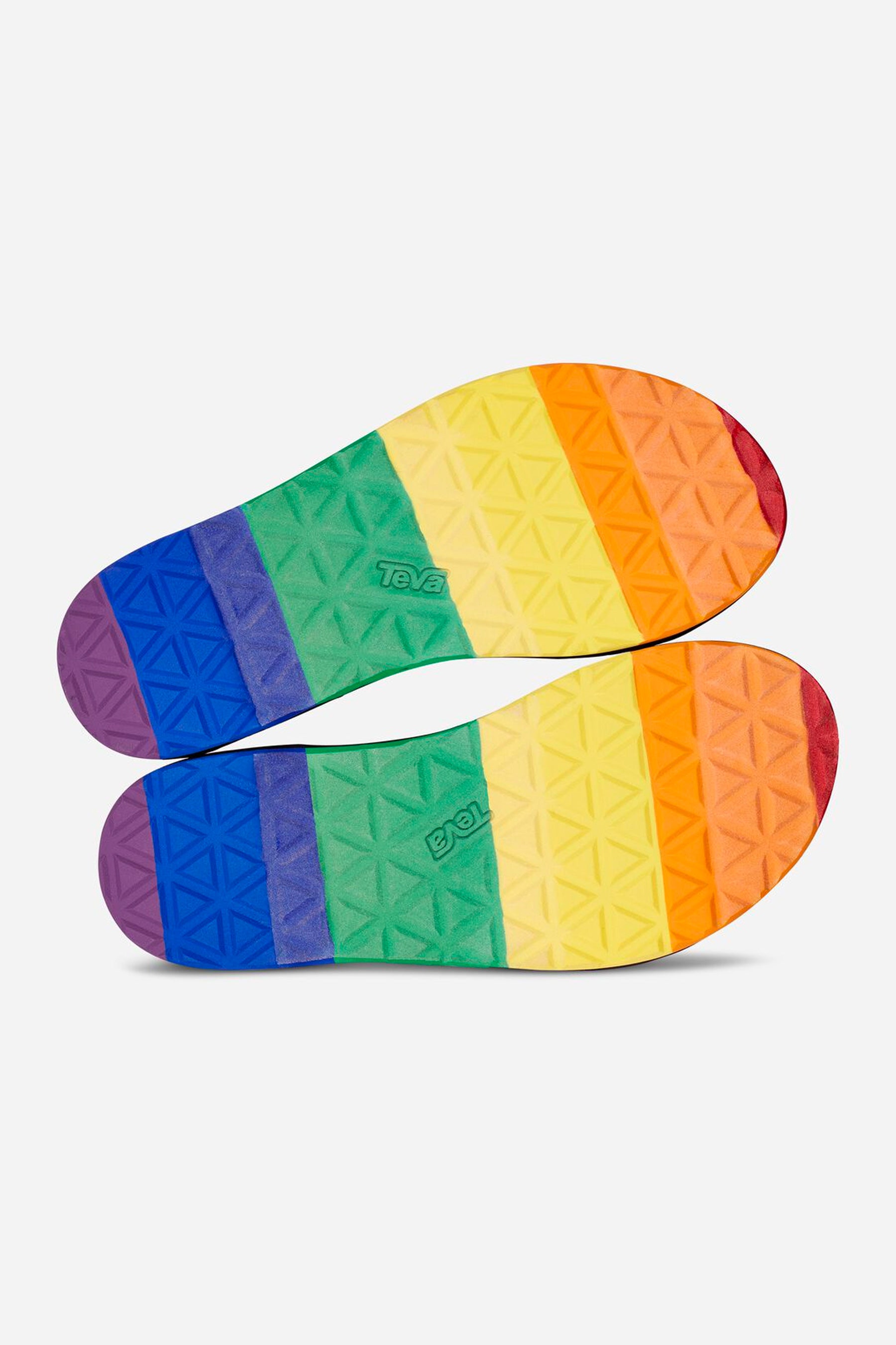Showcasing shimmering metallic rainbow webbing, this statement-making Pride sandal celebrates equality and inclusion. Featuring straps made from REPREVE® recycled polyester straps this metallic platform sandal incorporates pops of color on the hardware and outsole.