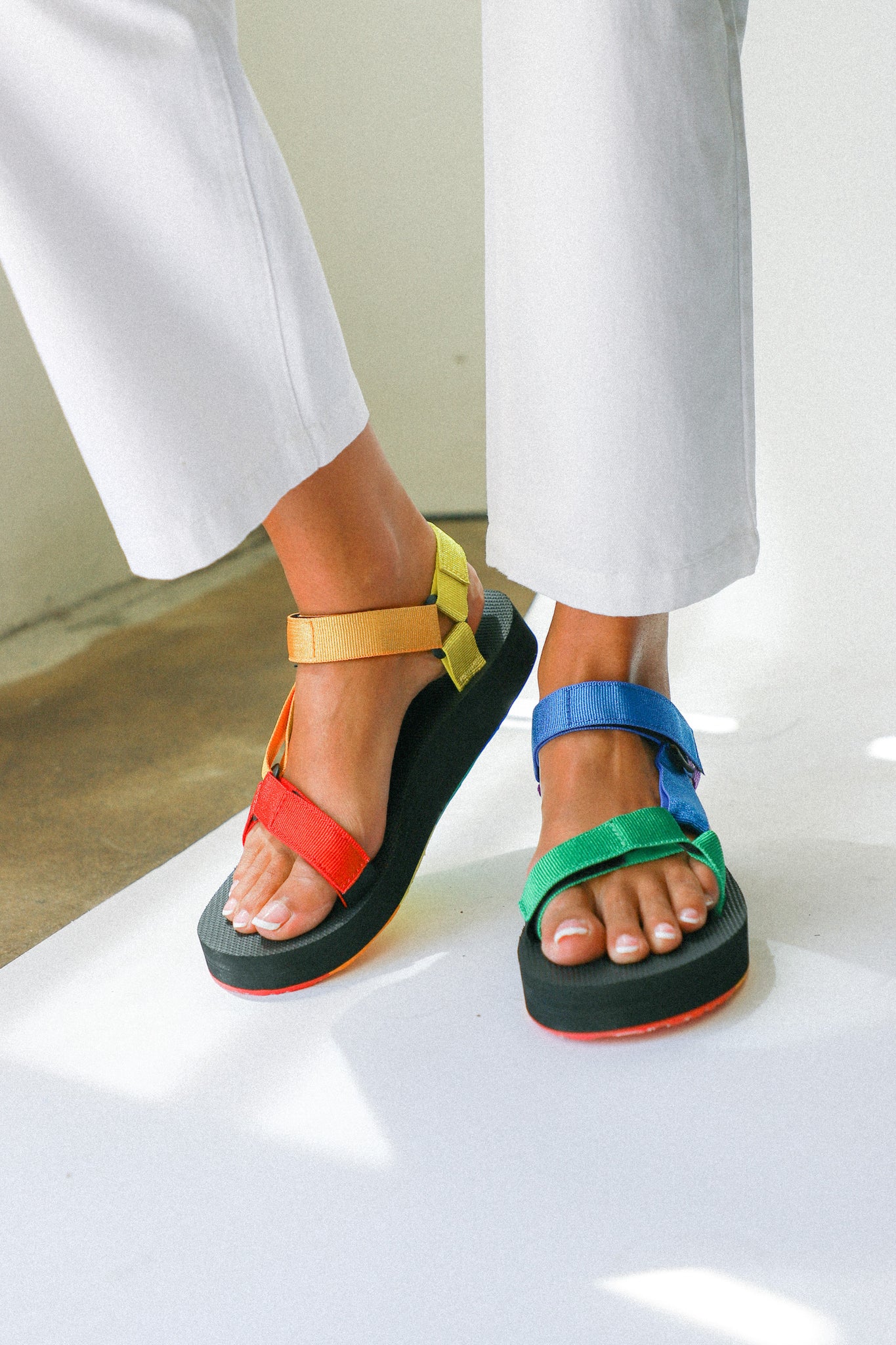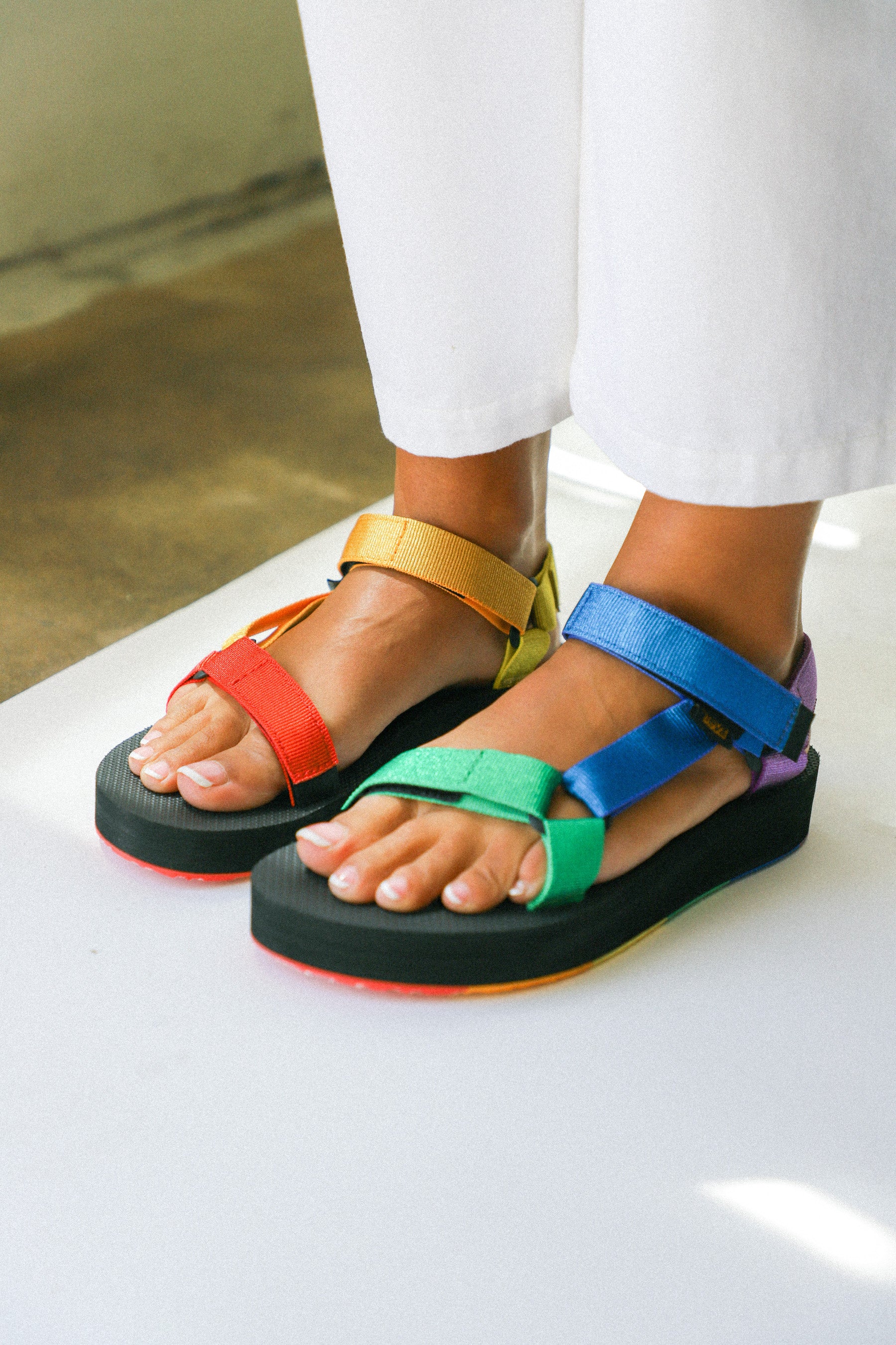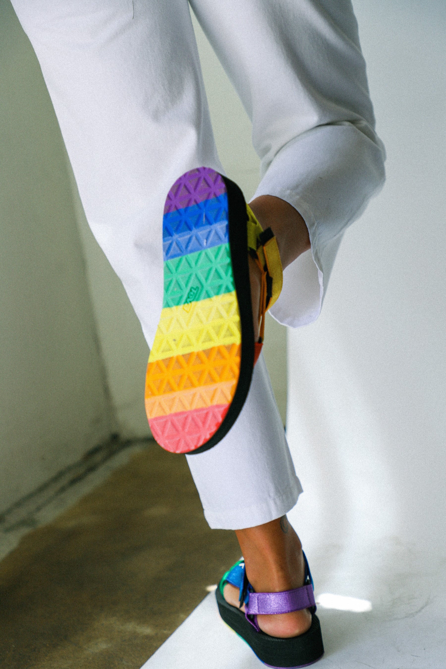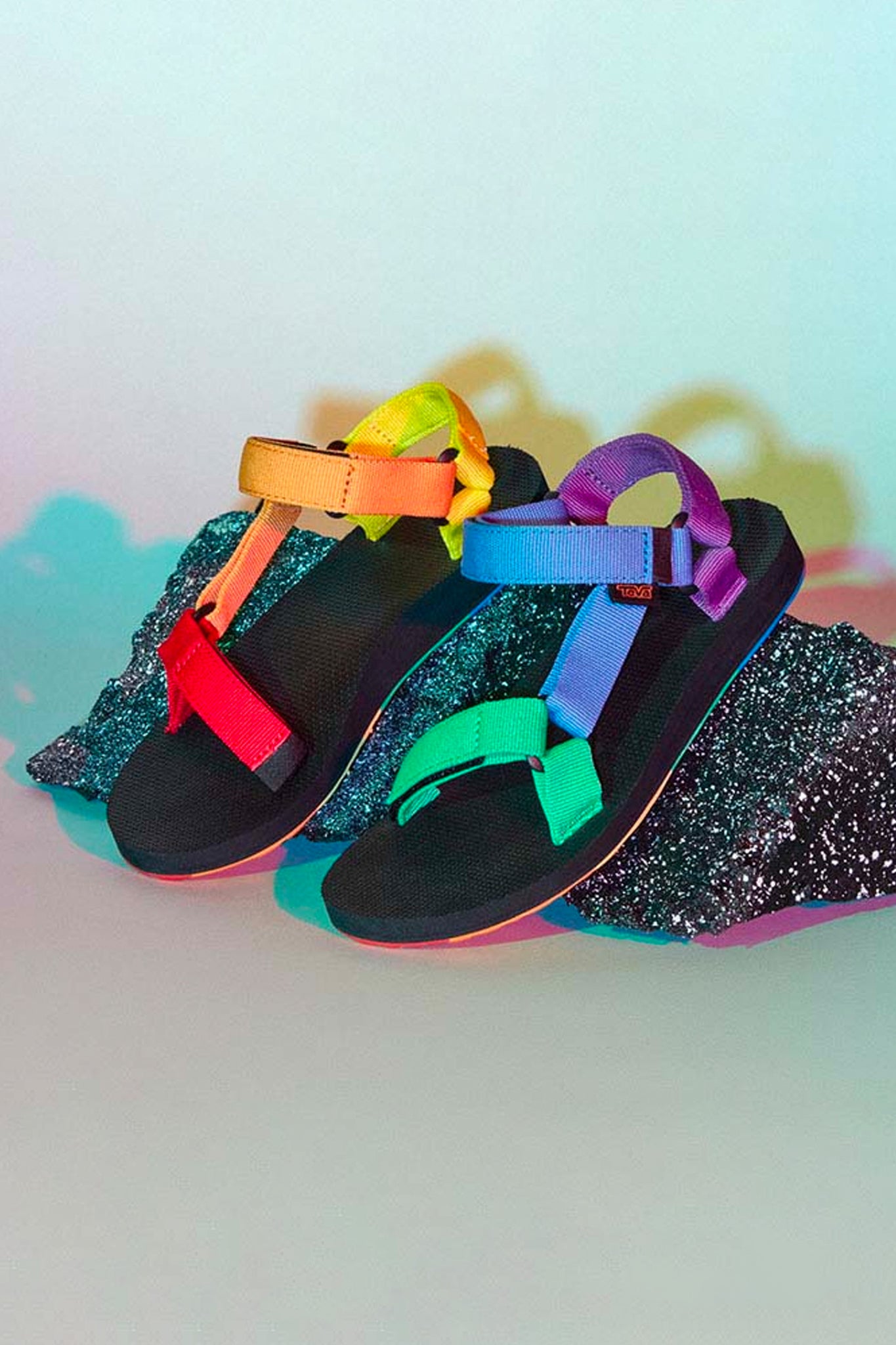 Showcasing shimmering metallic rainbow webbing, this statement-making Pride sandal celebrates equality and inclusion. Featuring straps made from REPREVE® recycled polyester straps this metallic platform sandal incorporates pops of color on the hardware and outsole.