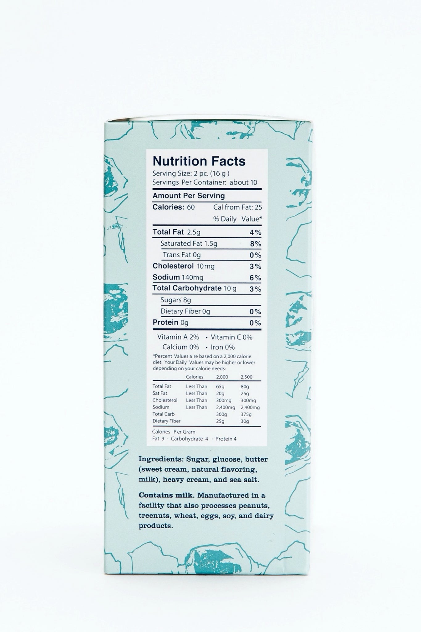 Jacobsen Salt Co.'s recipe starts with the purest sea salt, sustainably harvested from Netarts Bay on the Oregon Coast. They then carefully toast the sugar and butter to a perfect golden brown, before stirring in the heavy cream. The result: a creamy, chewy caramel with bright, briny sparks of sea salt.