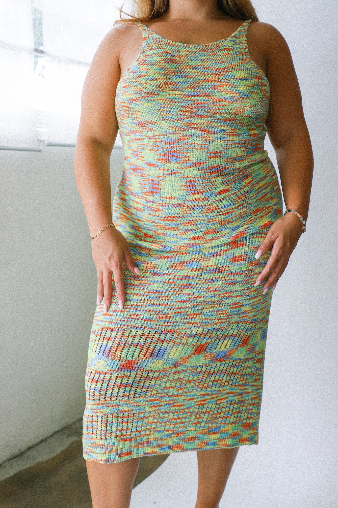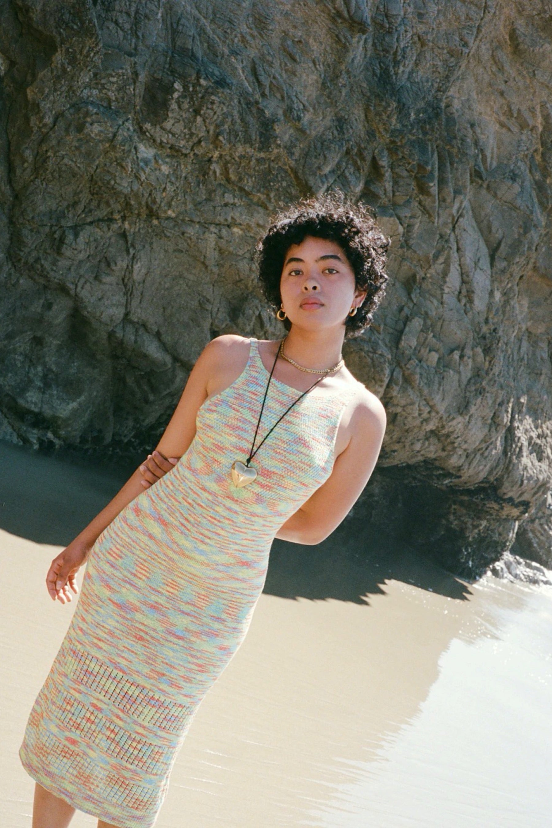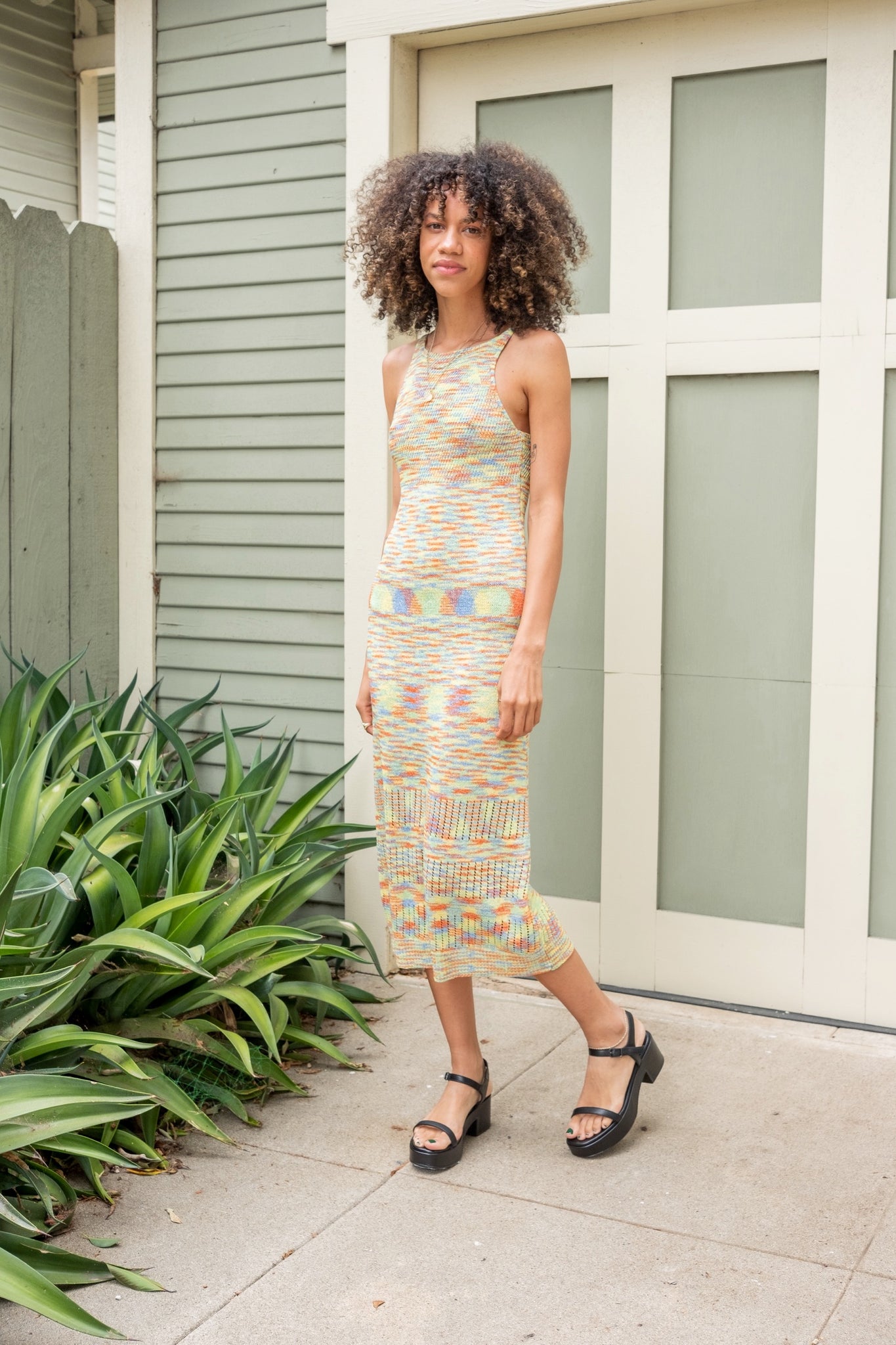 Crochet knit tank midi dress in rainbow space dye, featuring sheer knit detailing.