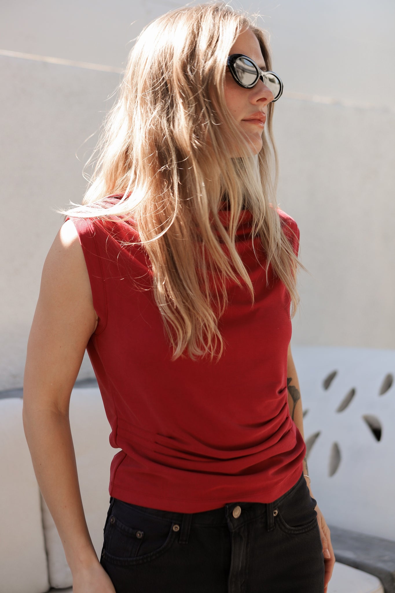 Raspberry Asymmetric Pleats Tank
