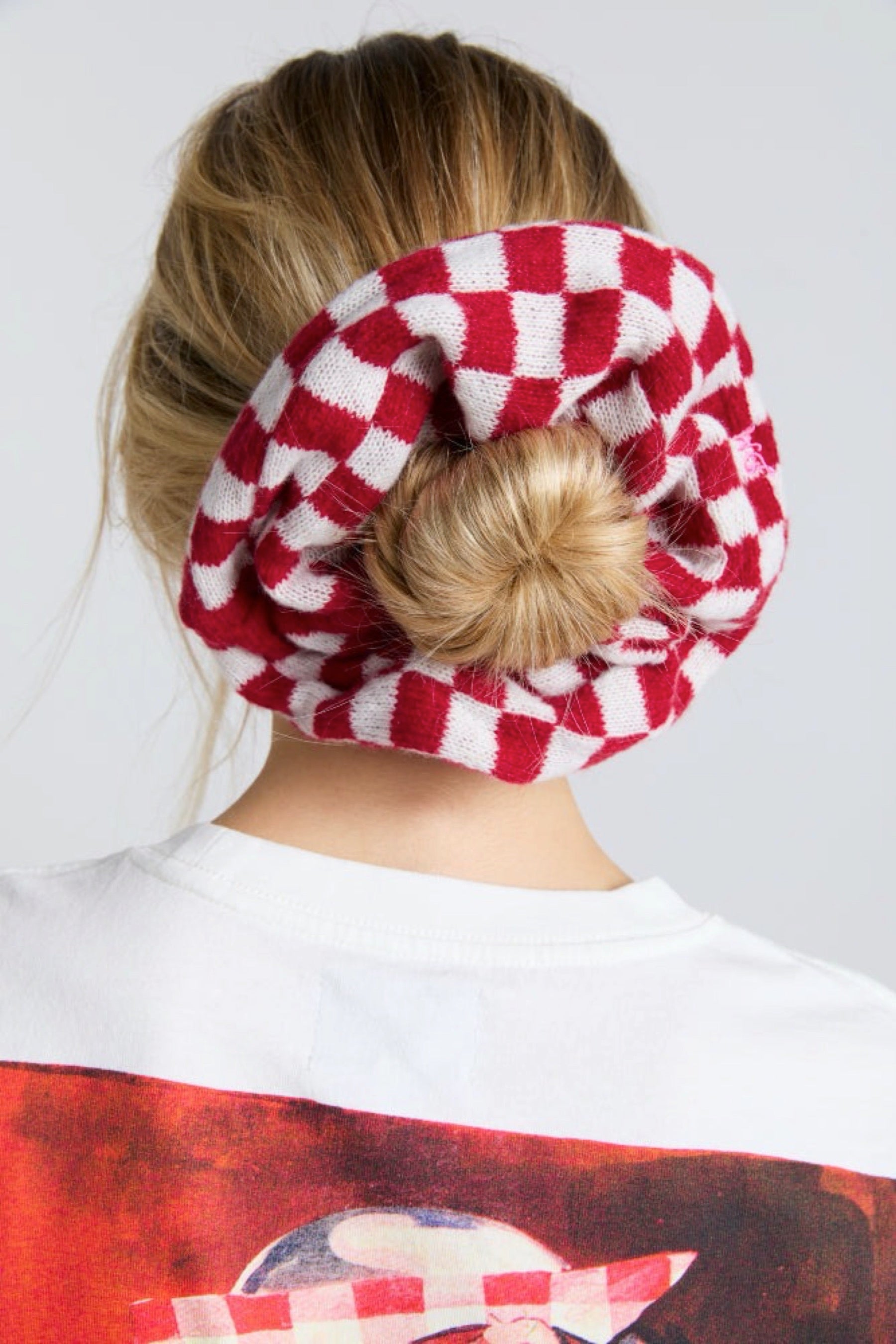 Go big with this oversized knitted scrunchie in chocolate and blue stripe.