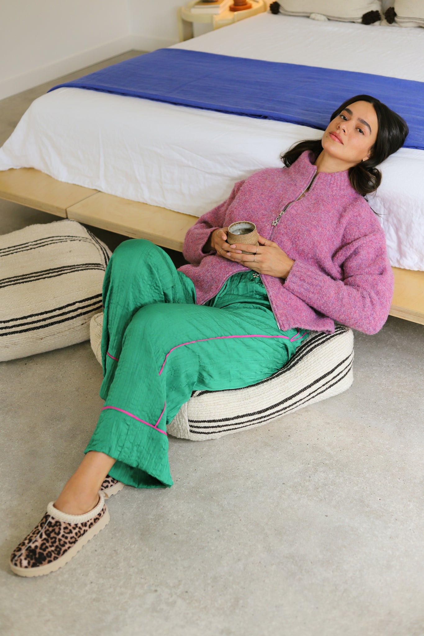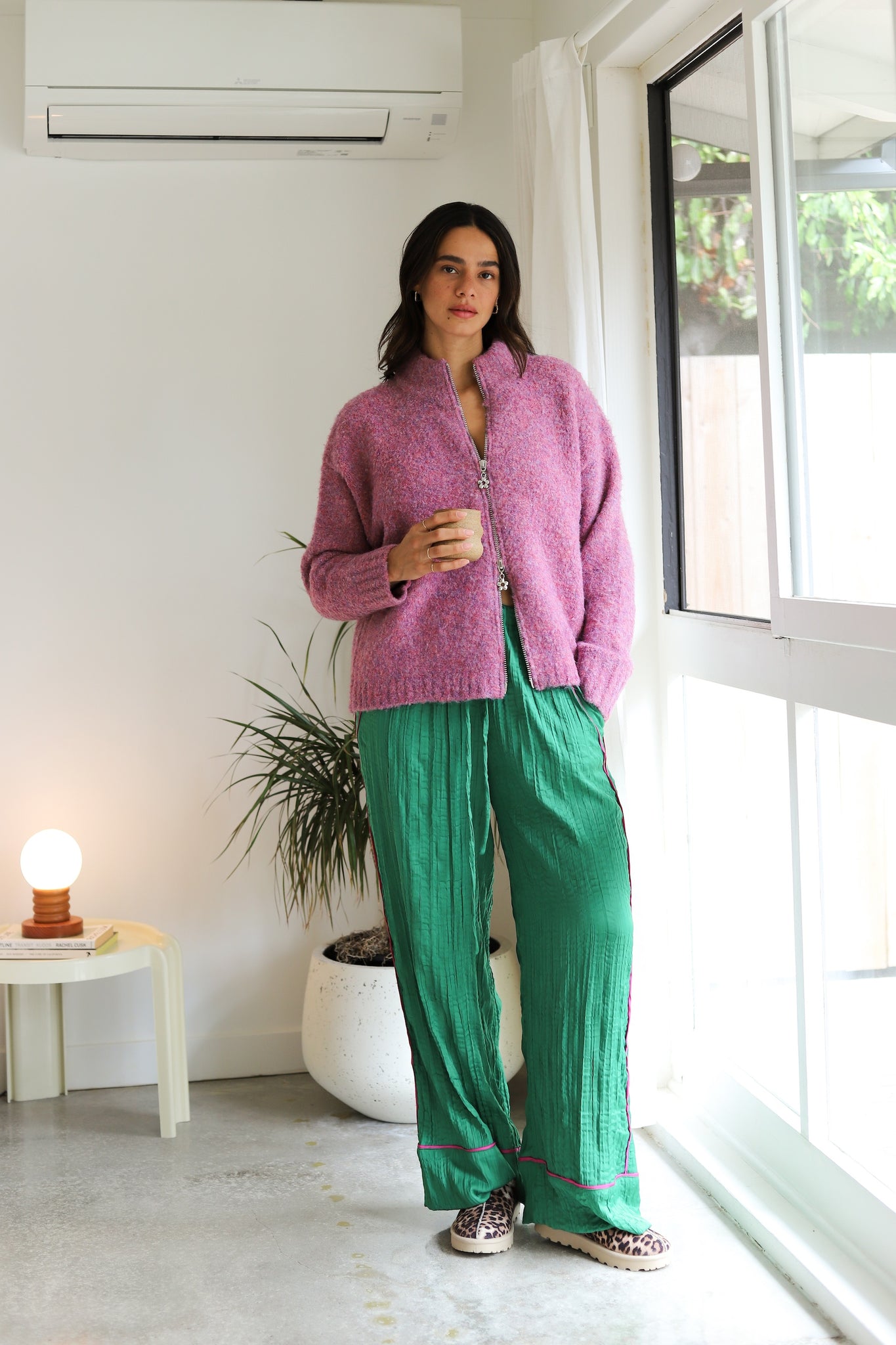 Introducing the Rolling Hills Out Satin Pant: a green satin pant with a playful pink stripe. Embrace a quirky, fun style while enjoying the luxurious feel of satin. Perfect for lounging or making a statement.