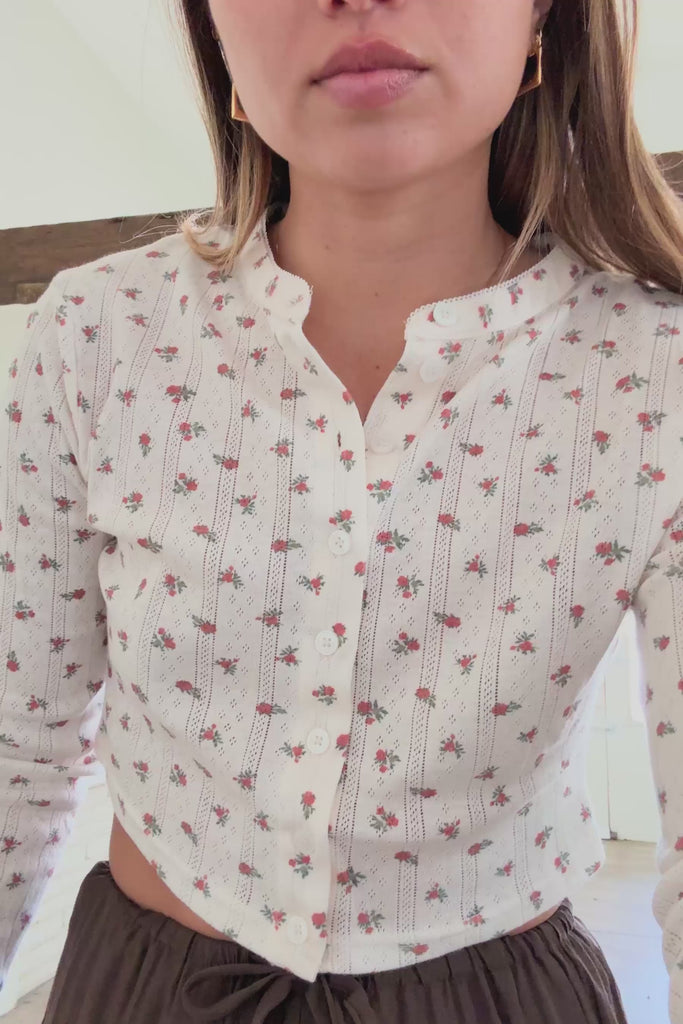 Pointelle jersey long-sleeve crop top featuring a ditsy floral print and button front.
