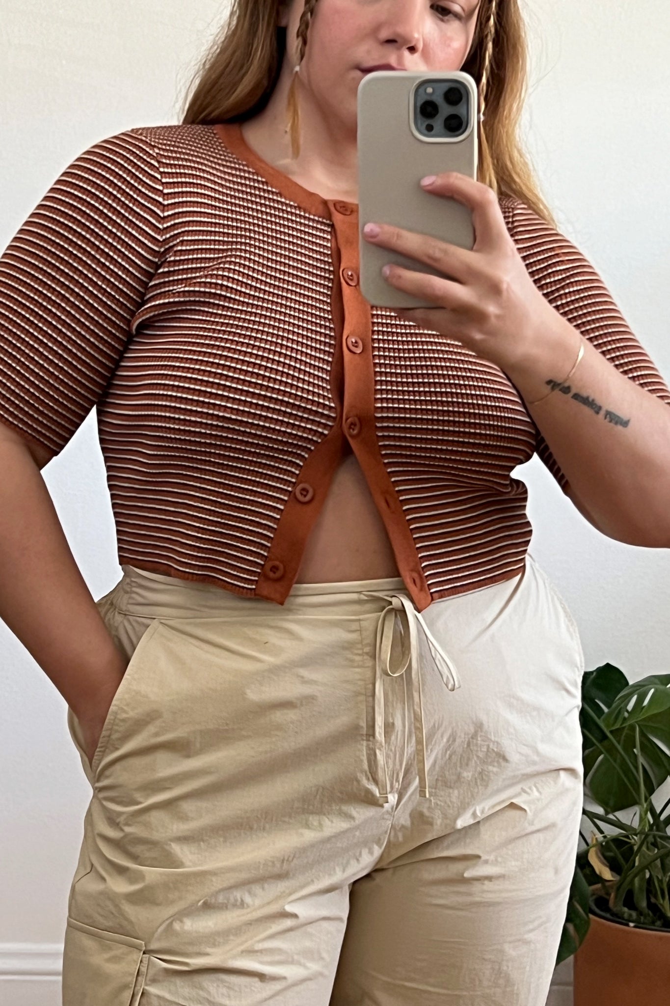 The Mia Top is a 90s inspired short-sleeve button-down that can be worn open as a cardigan or a top.