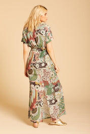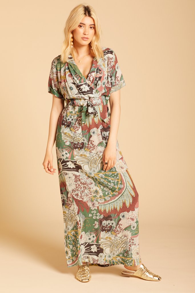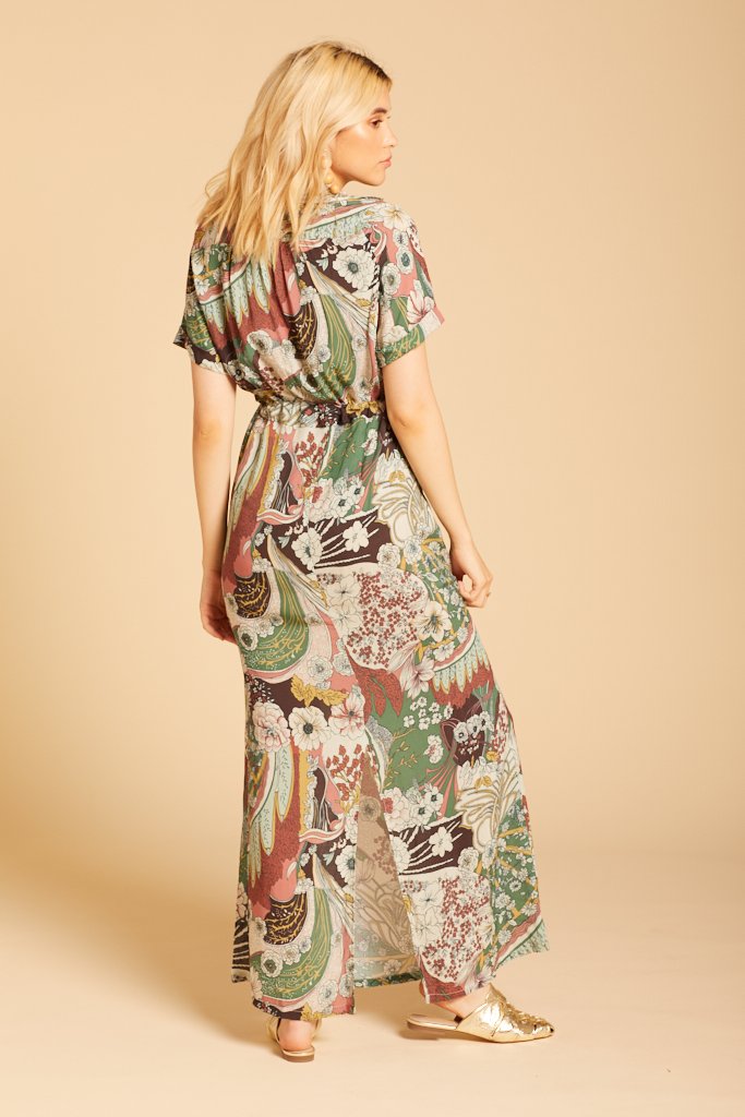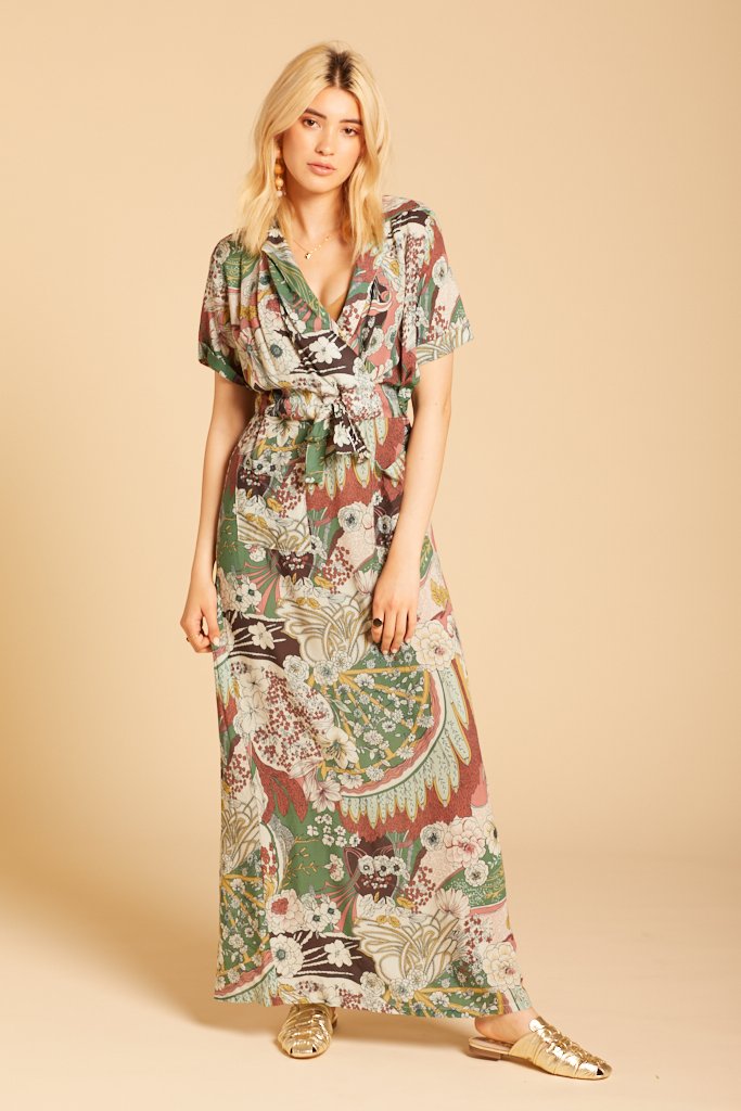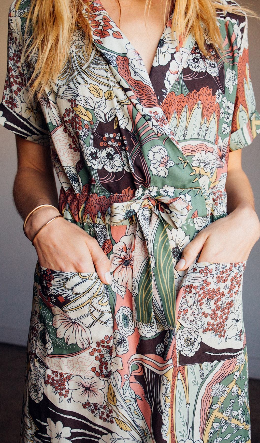 Get groovy, but be comfy in this relaxed floor length dress, featuring a slit in the back, tie waist, and pockets.