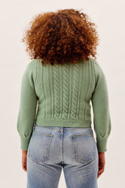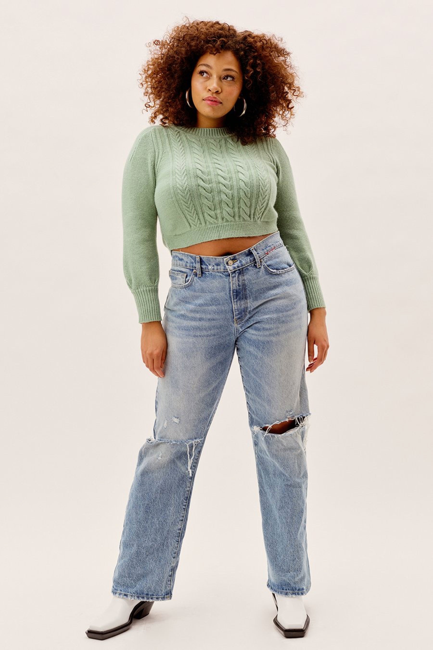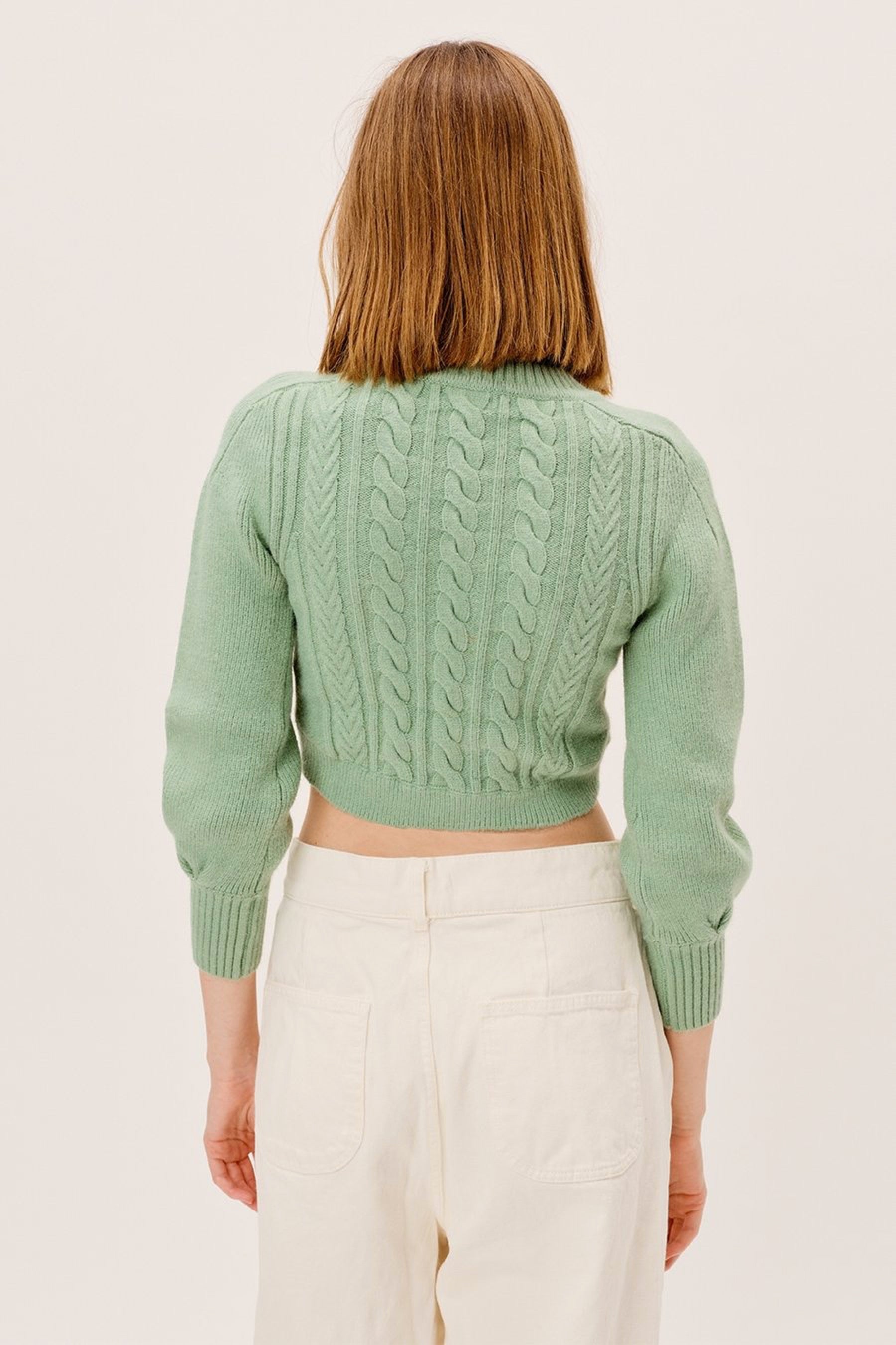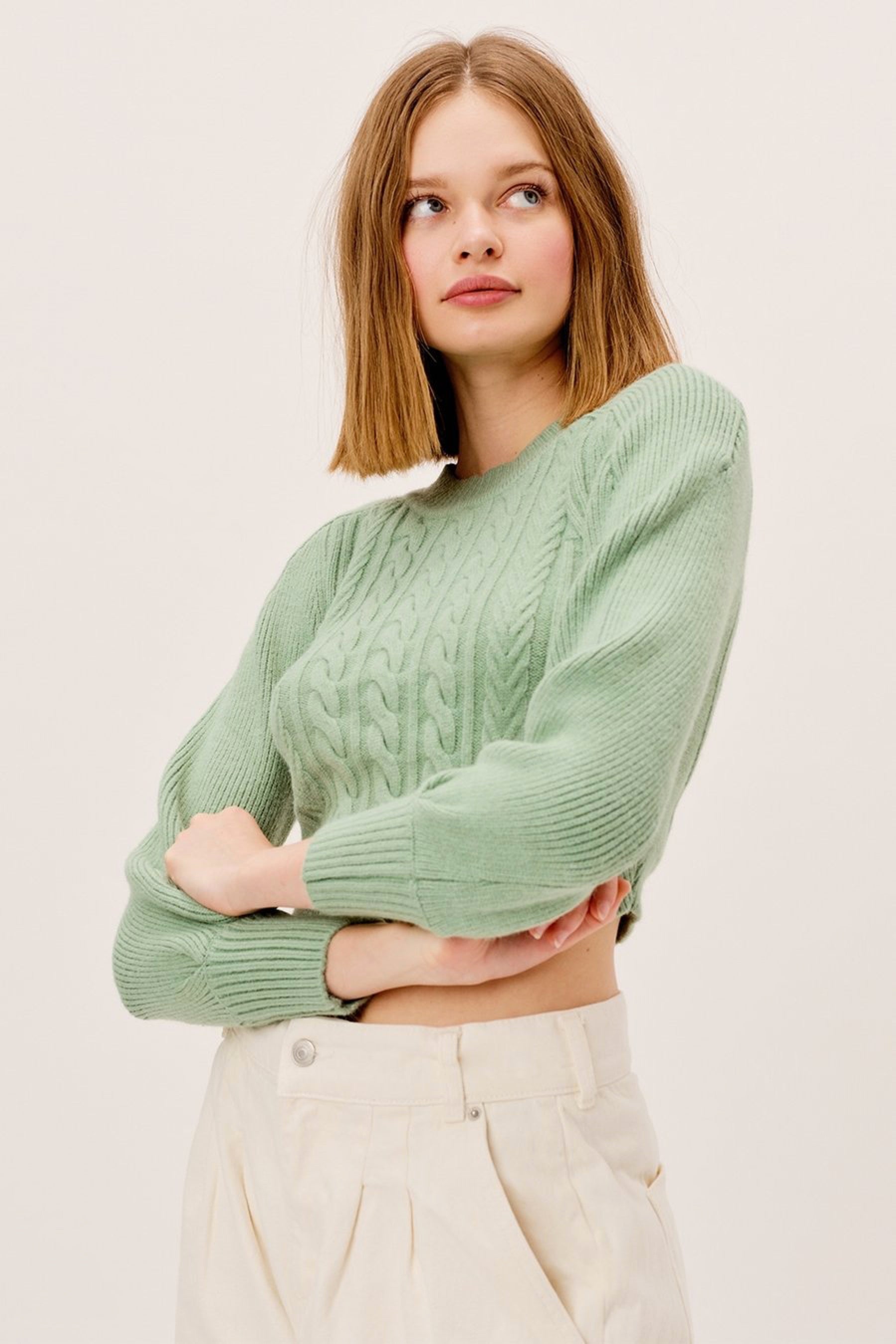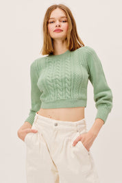 Cropped and cozy sweater featuring cable and ribbed knit detailing, crew neckline, and pleated cuffs.