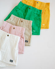 The once forgotten short from the 70's is back! In so many cute colors, you won't be able to decide which one you want. In a soft stretch corduroy, elastic waist band and copper snap with zipper. These will be your go to shorts for any day.