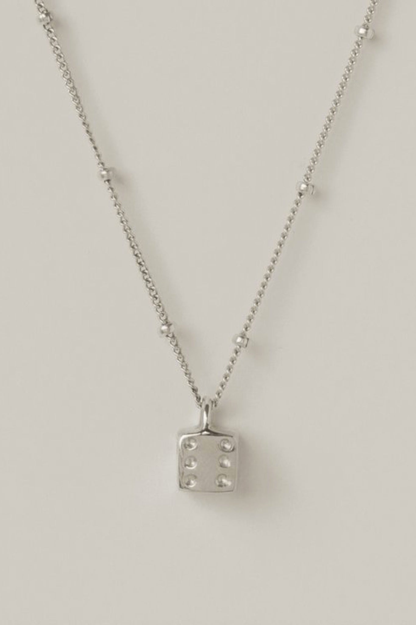Sterling silver satellite chain and dice pendant.