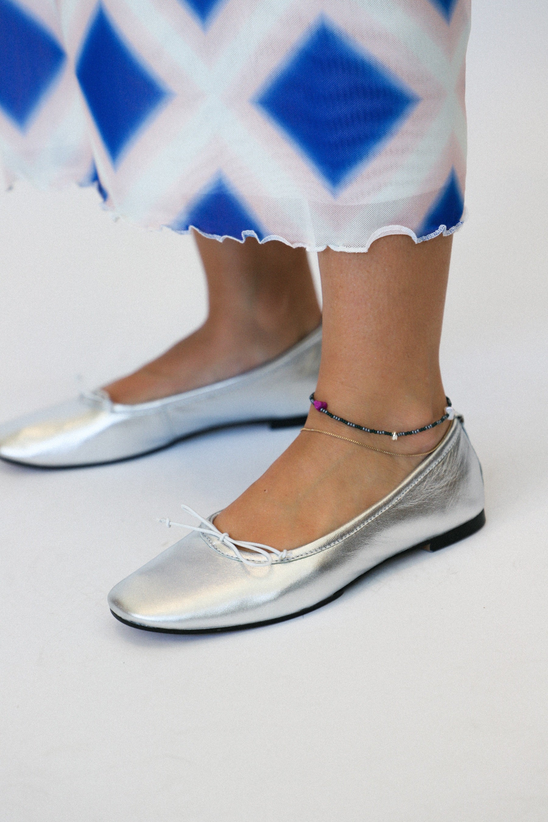 Classic ballet flats featuring a soft metallic leather upper and contrasting bow.