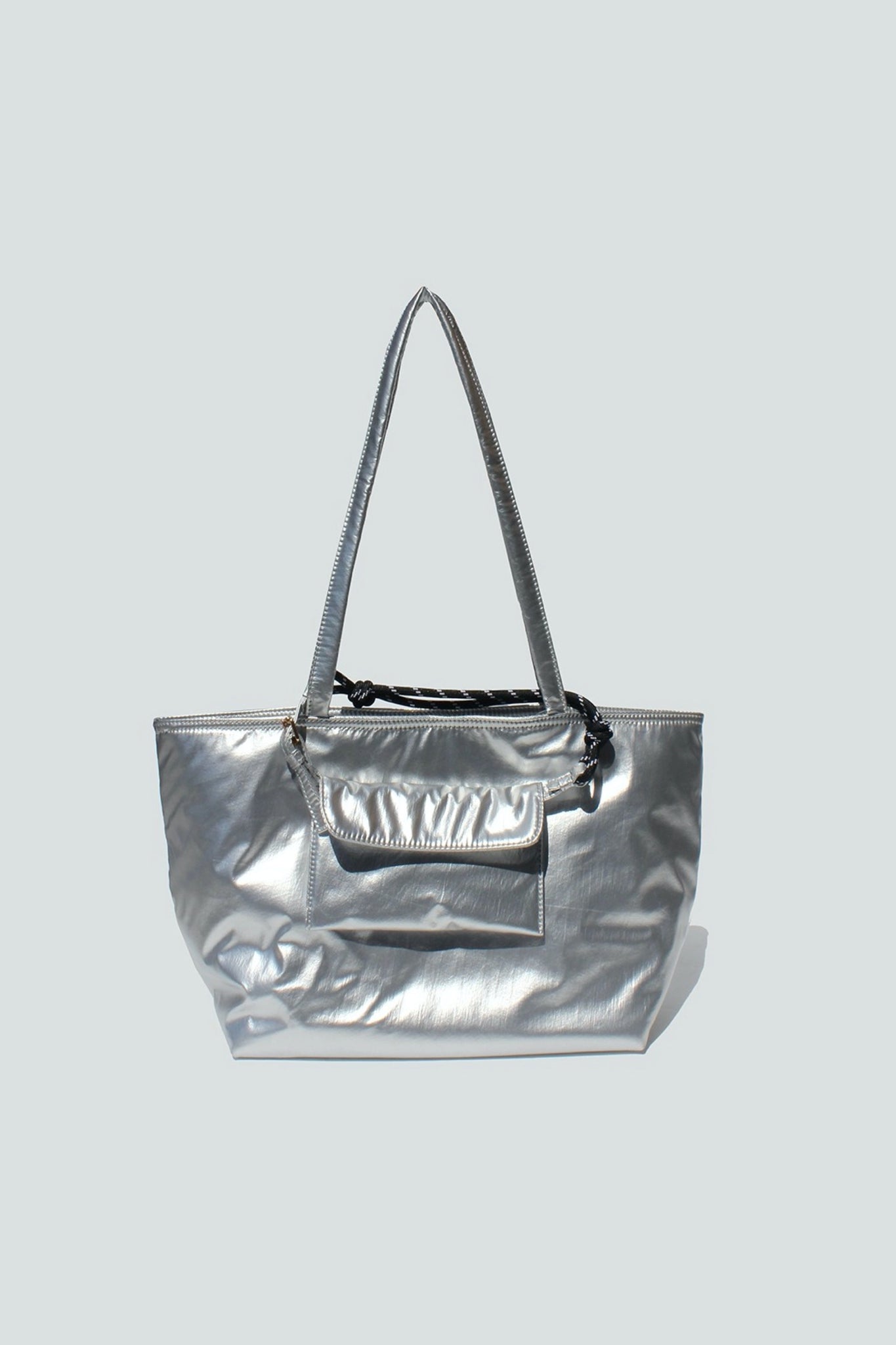 This oversized tote, made of durable nylon, boasts a metallic finish and includes a detachable pouch. Perfect for everyday use, this bag offers both practicality and fashion-forward design.