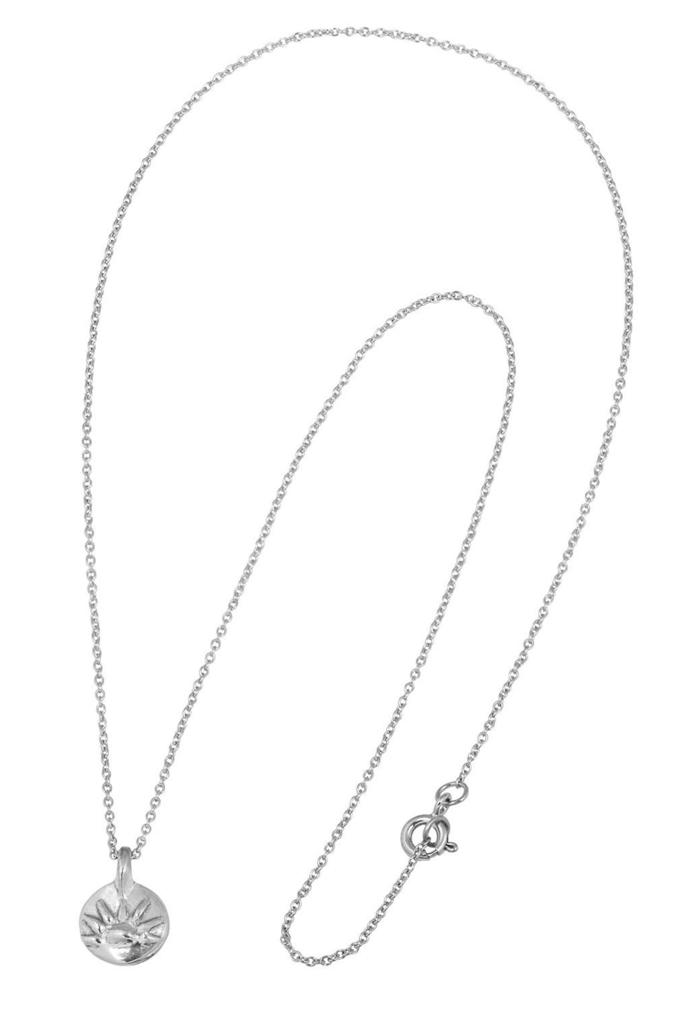 A delicate round charm with a sun on 18 inch chain, perfect for everyday.