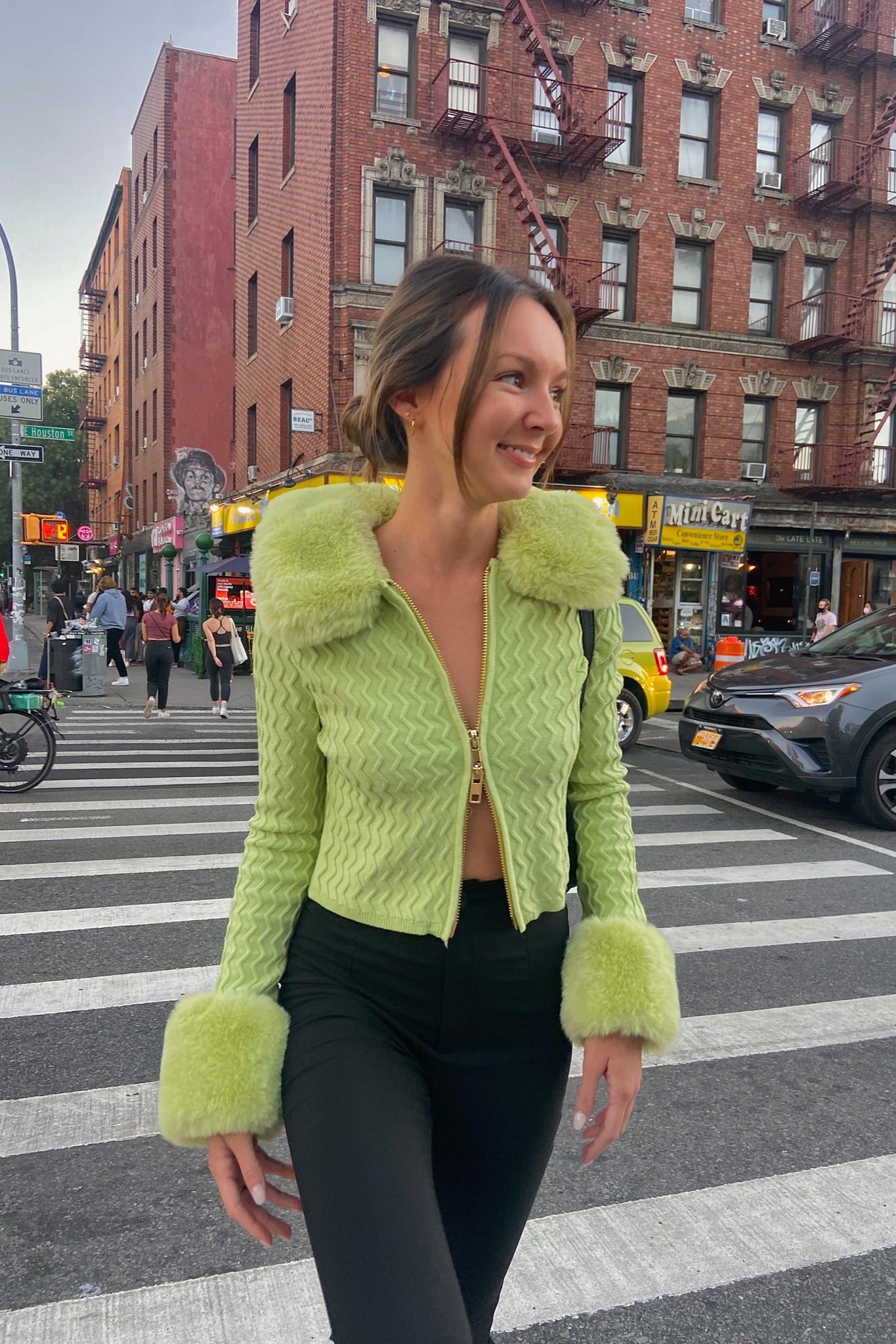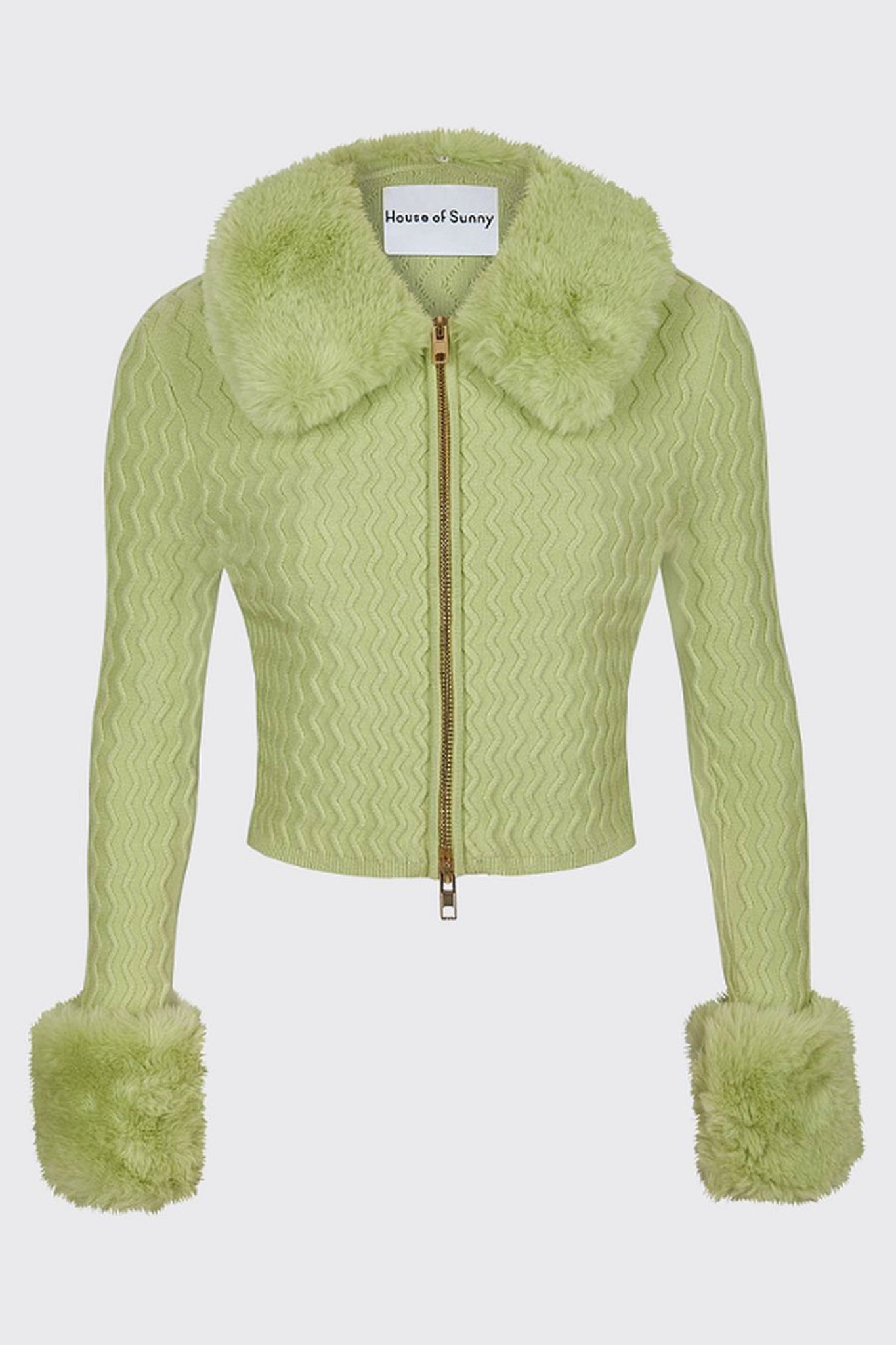 Wavy ribbed cardigan with a cropped body and detachable cuff and collar.