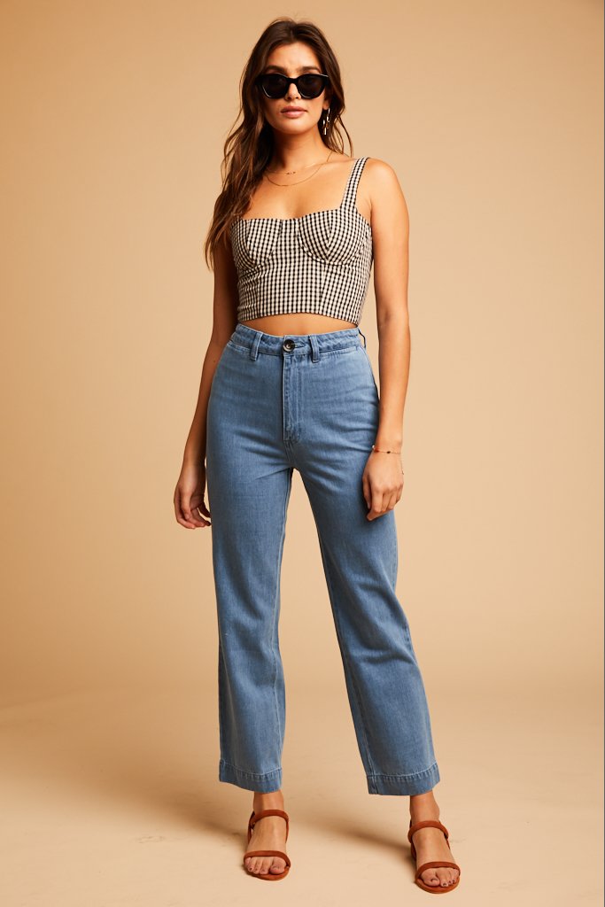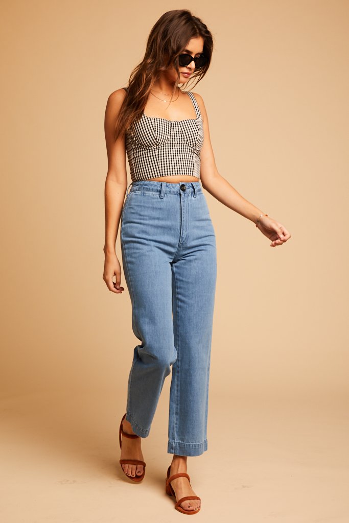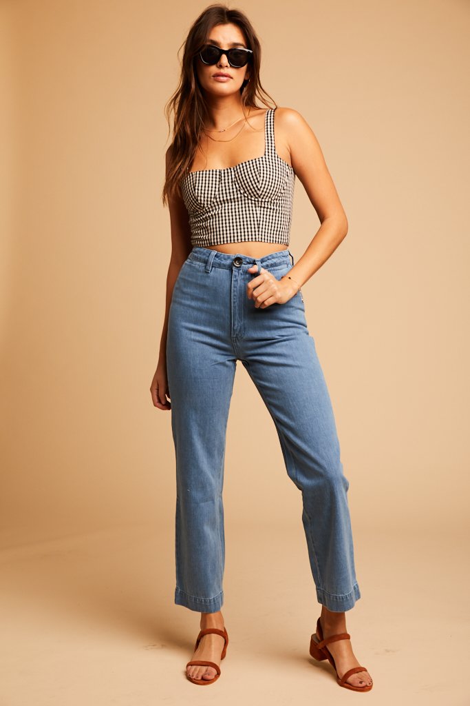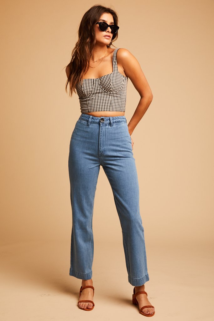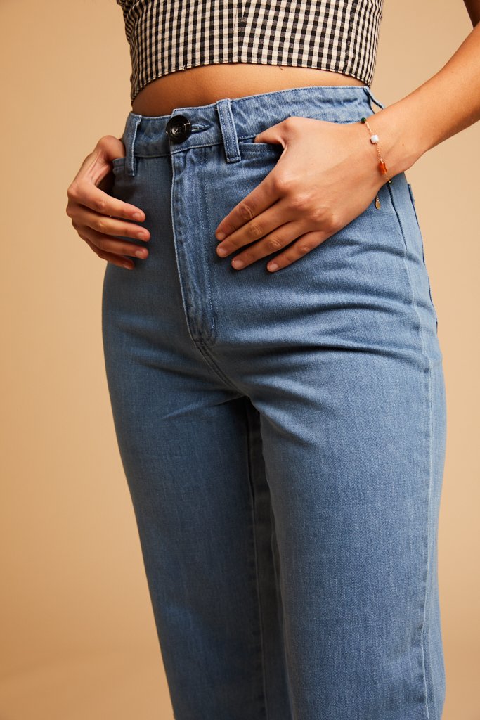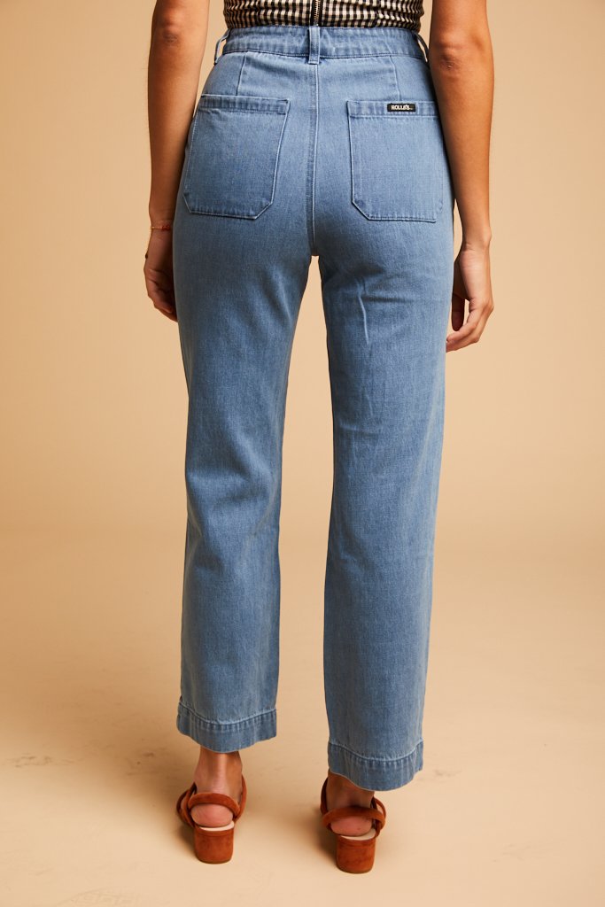 Living in and for these perfect sailor high rise jeans. Features a super high waist, slip front pockets, sailor back pockets, a zip fly and a subtle flare.