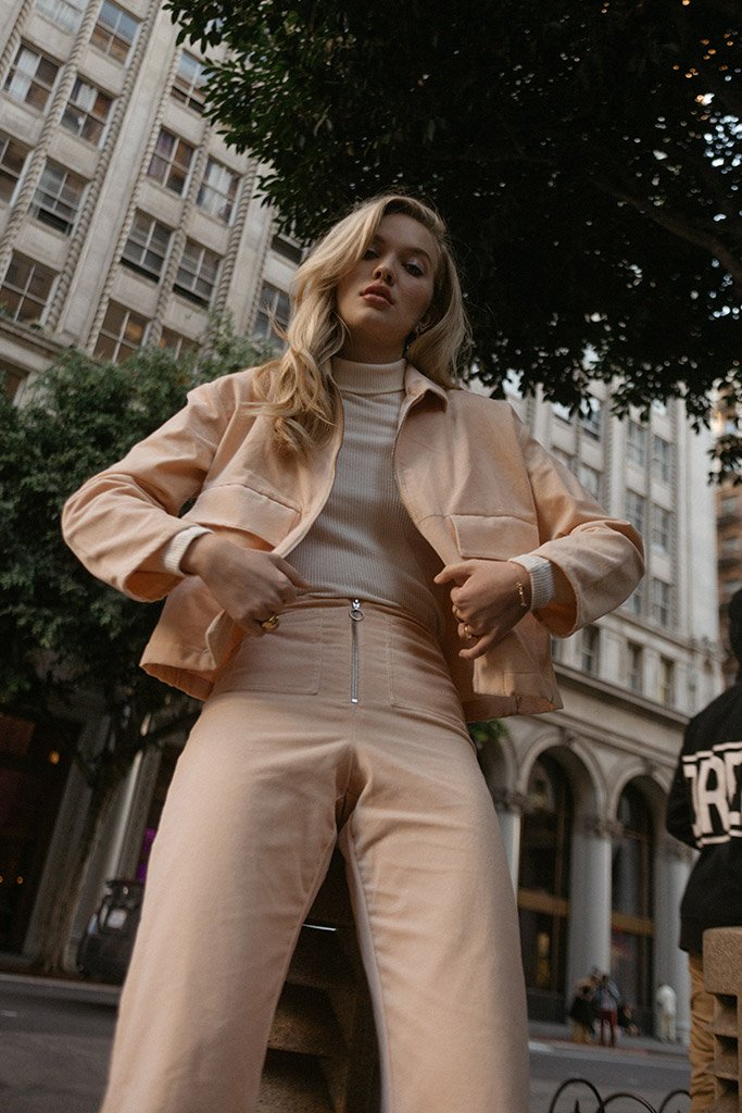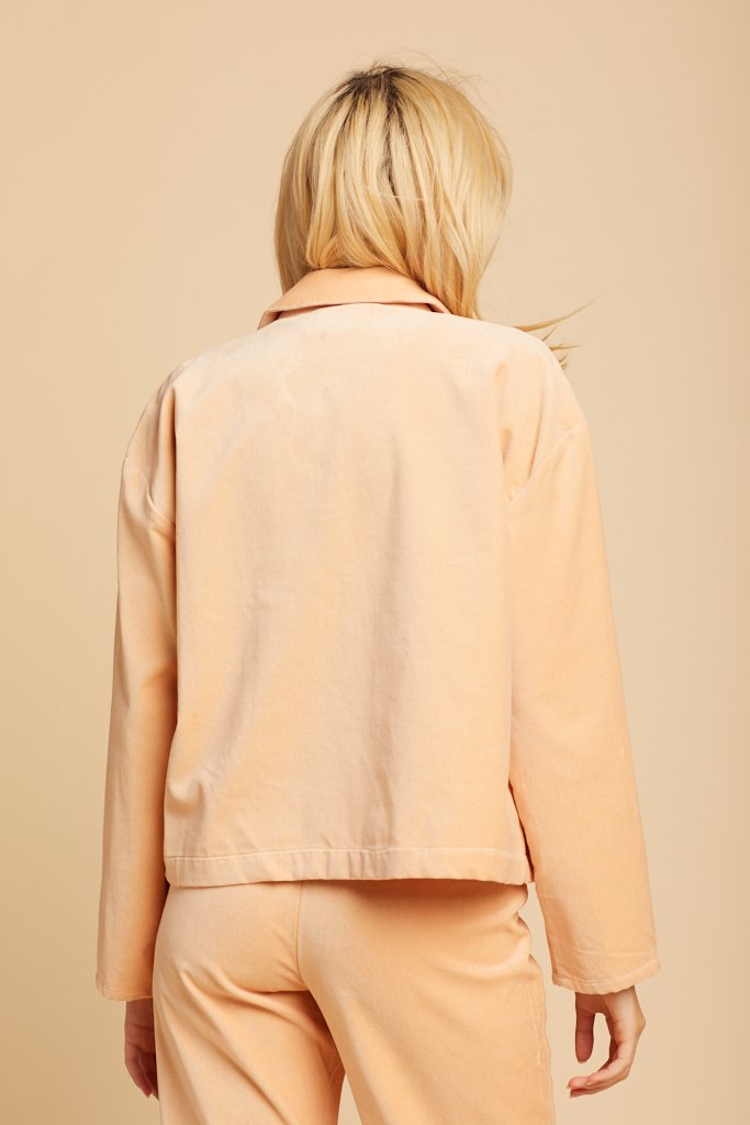Soft pink velvet jacket with zip closure and a flattering boxy fit with front pockets. Pair with the Soft Pink Wadi Pant for the complete look.