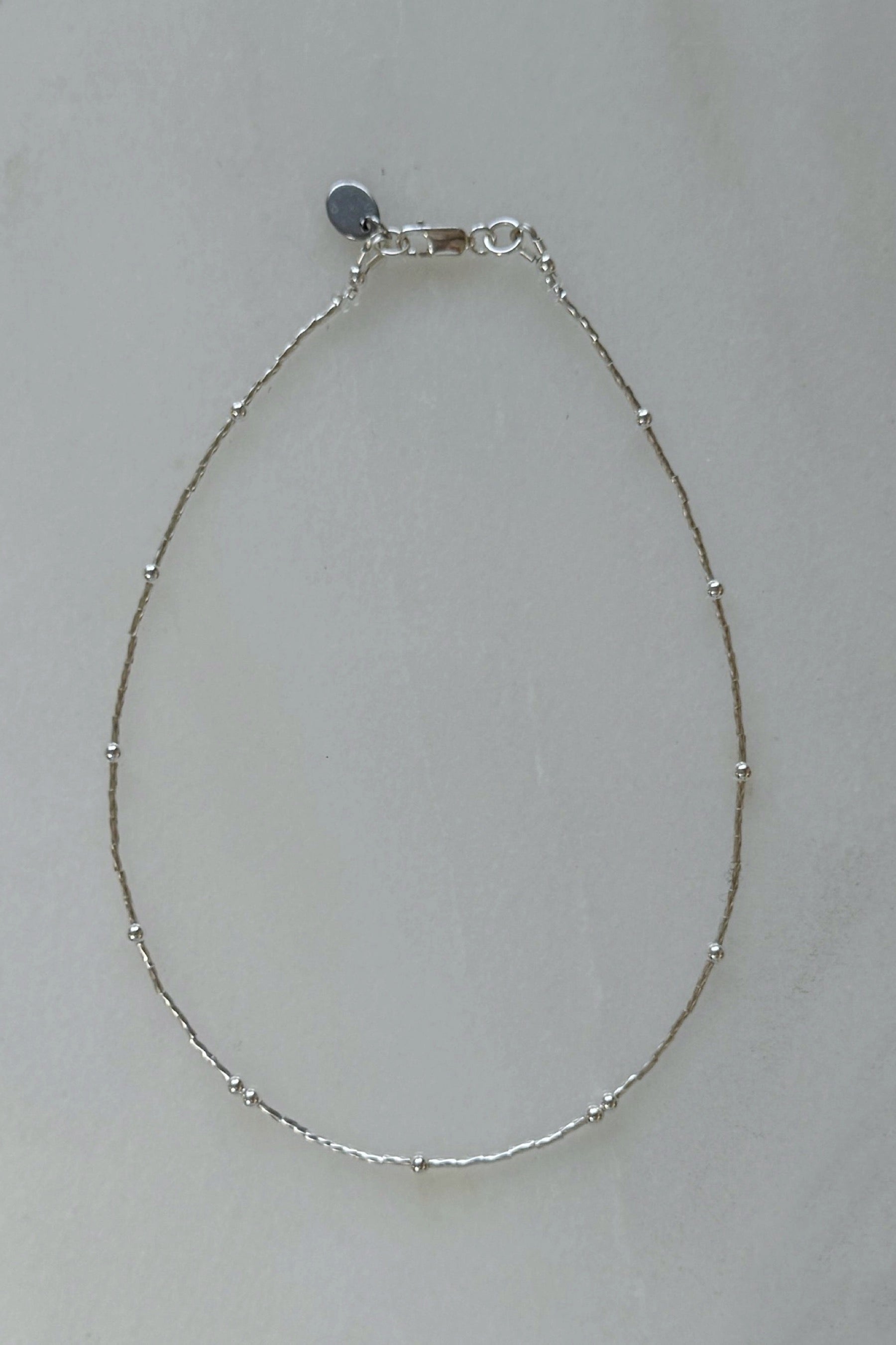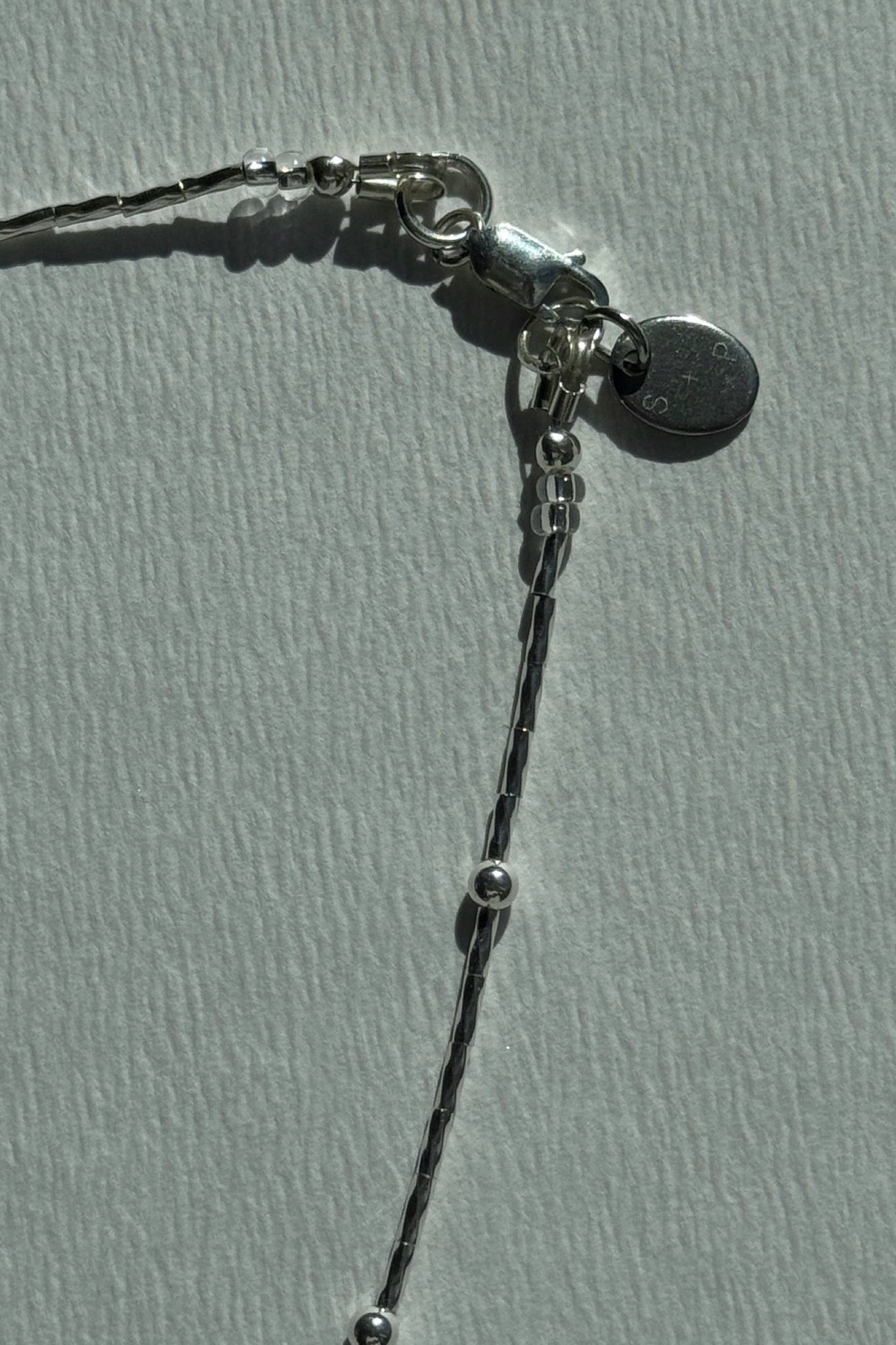 Beaded necklace featuring sterling silver twisted tube and round beads with a sterling silver clasp. Each necklace is one of a kind and will vary slightly from the photo.