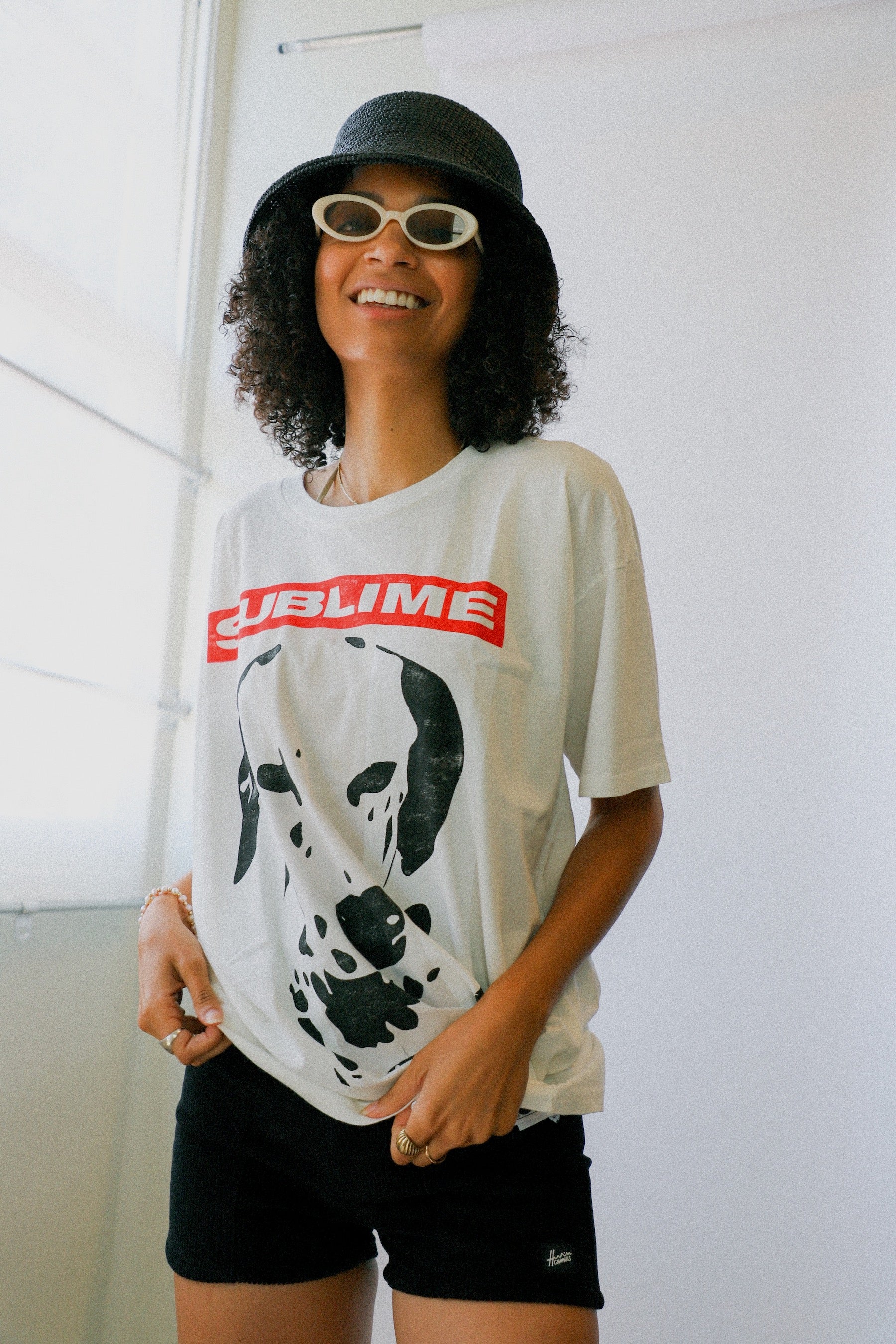 The Merch Tee is a roomy fit, with an open neck and ladder stitch hems and soft drapey feel.