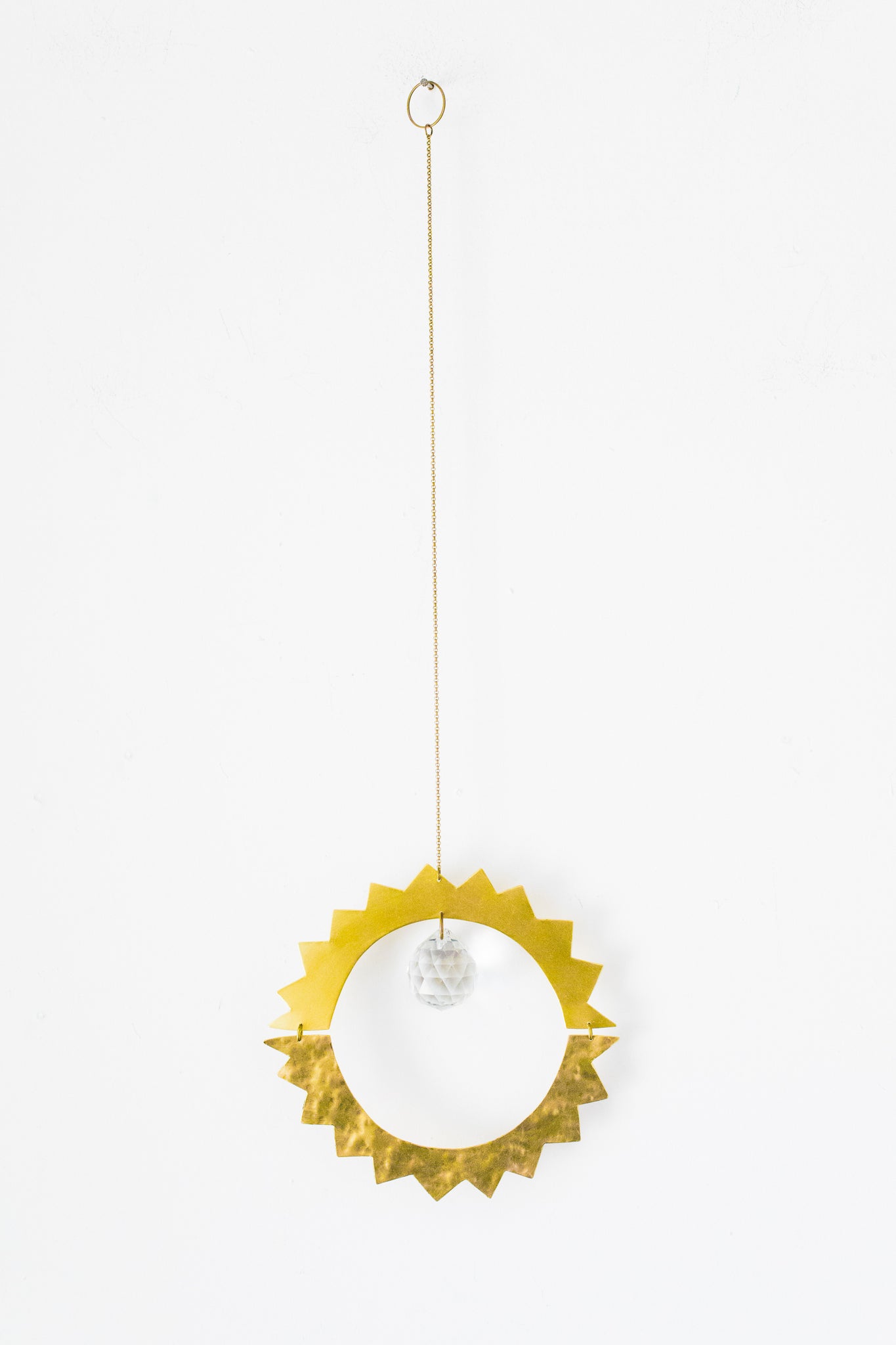 Brass light catcher featuring hand cut shapes from brass sheet + chain. Suspend this from the ceiling (with a ceiling hook) near a window or hanging from your curtain rod to experience the light magic of this piece. Handmade in California.