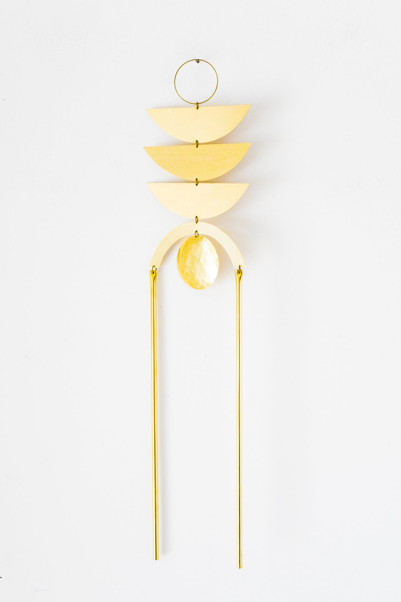 Brass wall hanging featuring hand cut shapes from brass sheet + brass tubing. Handmade in California.