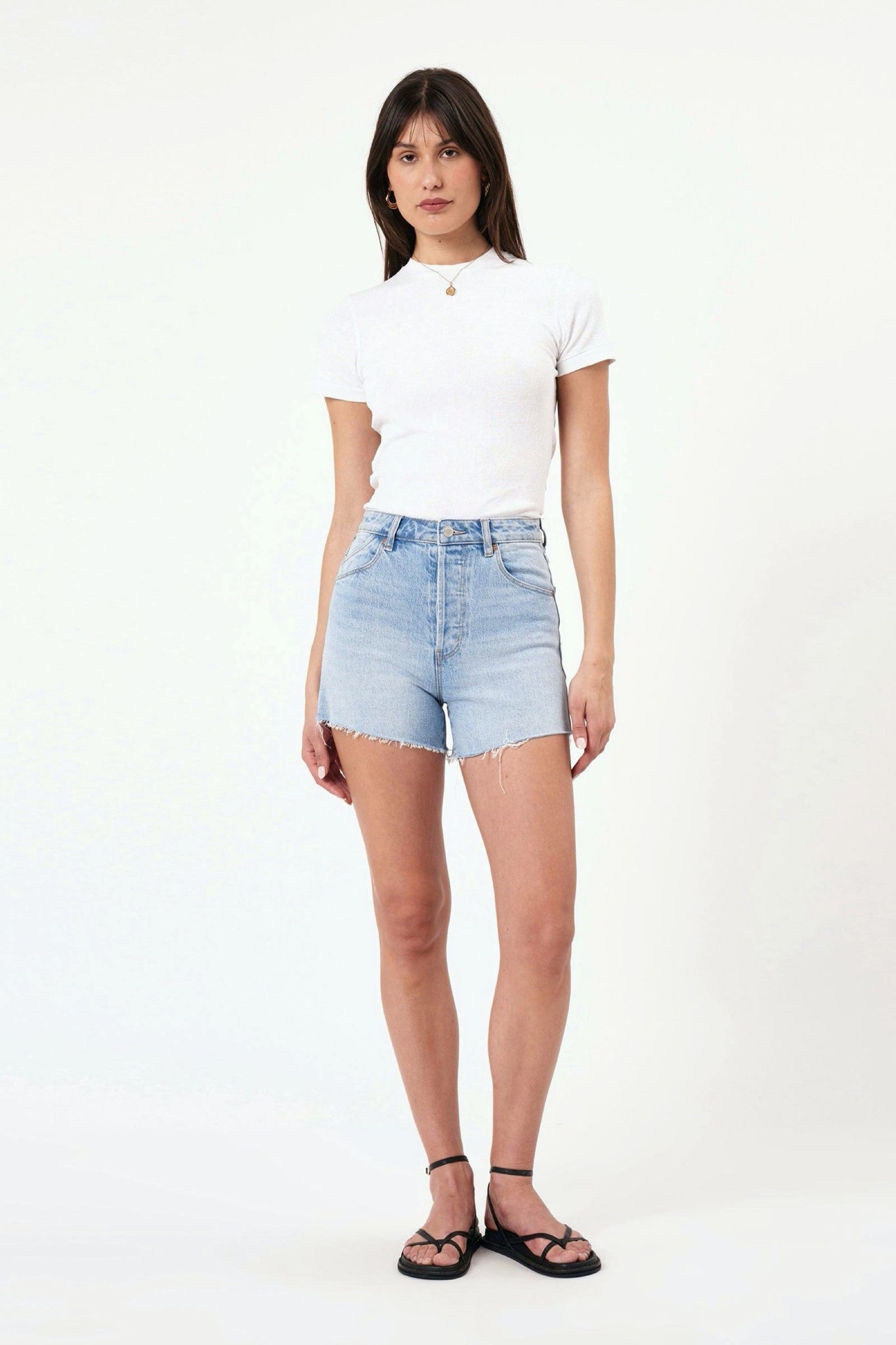 Made with comfortable rigid denim, this high rise short has a slim fit and a modest length for a flattering look. Featuring a signature Rolla's back pocket and a raw hem, this light to mid-blue wash is perfect for any occasion.