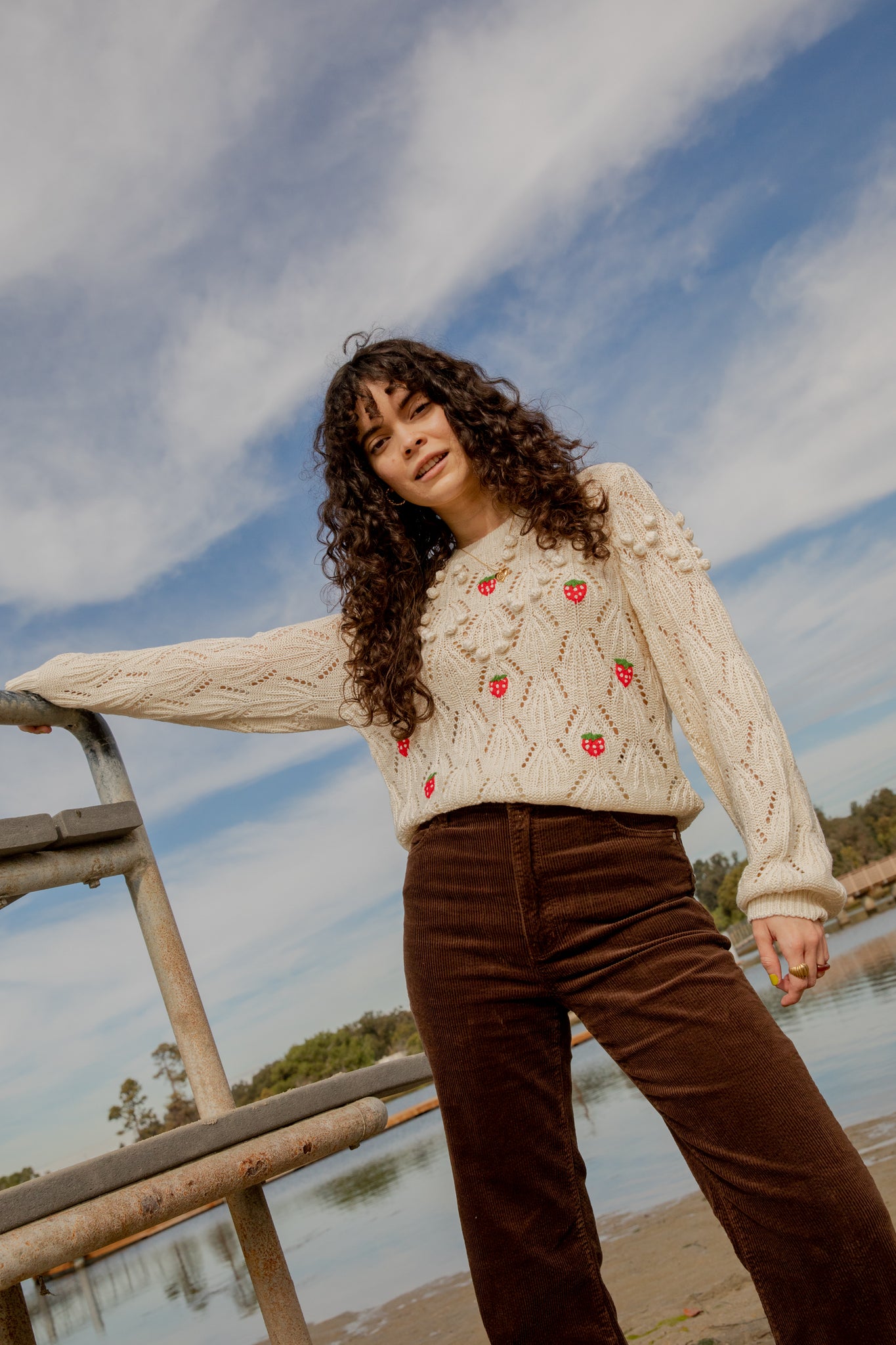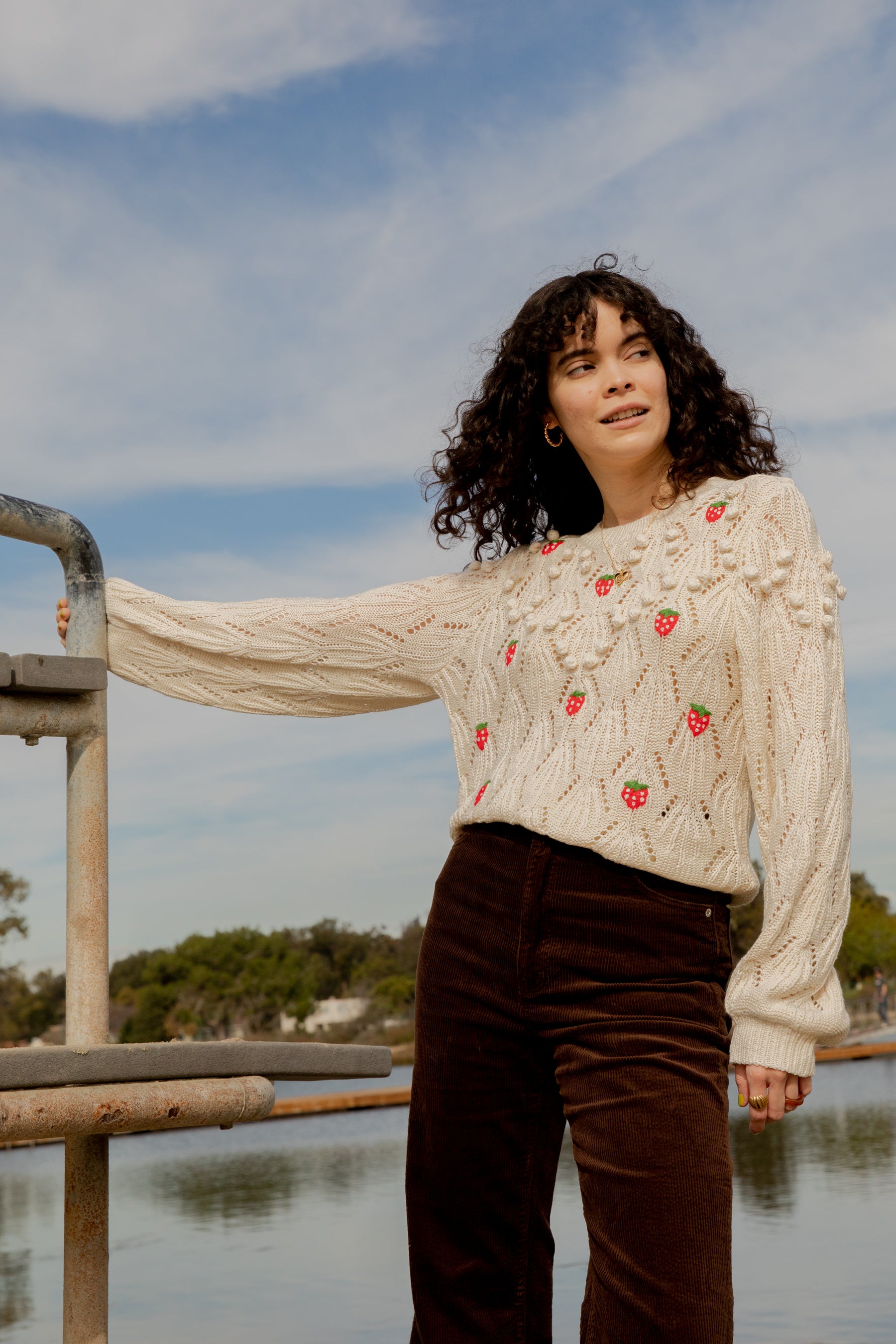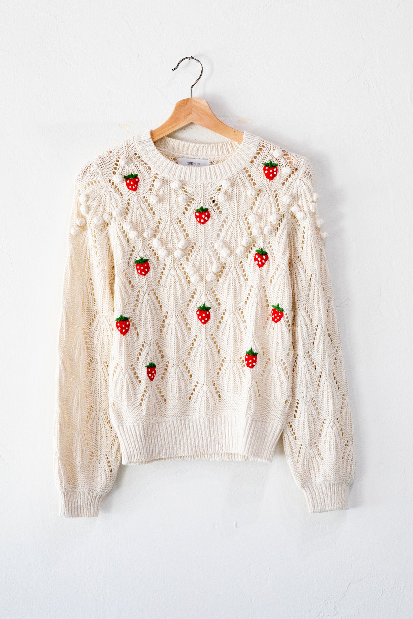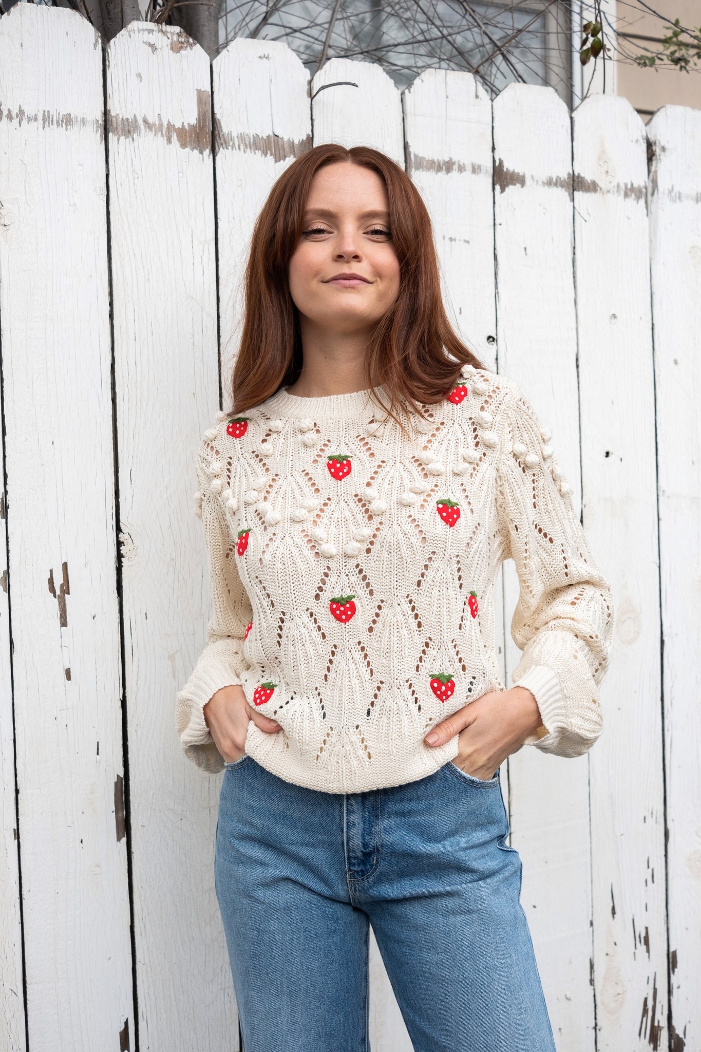 Lightweight crochet sweater with cute strawberry and hand-knitted pom poms all over front bodice.
