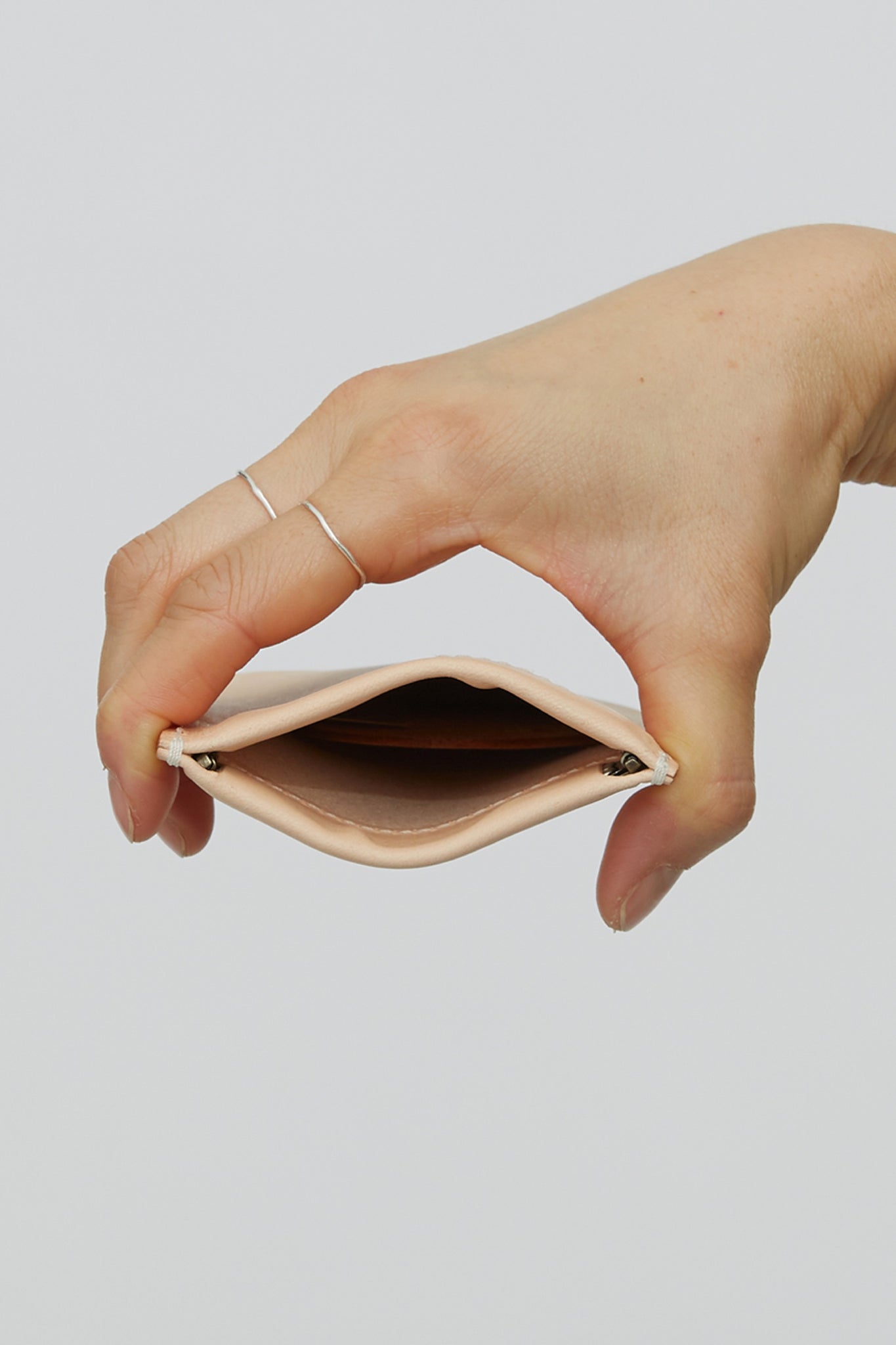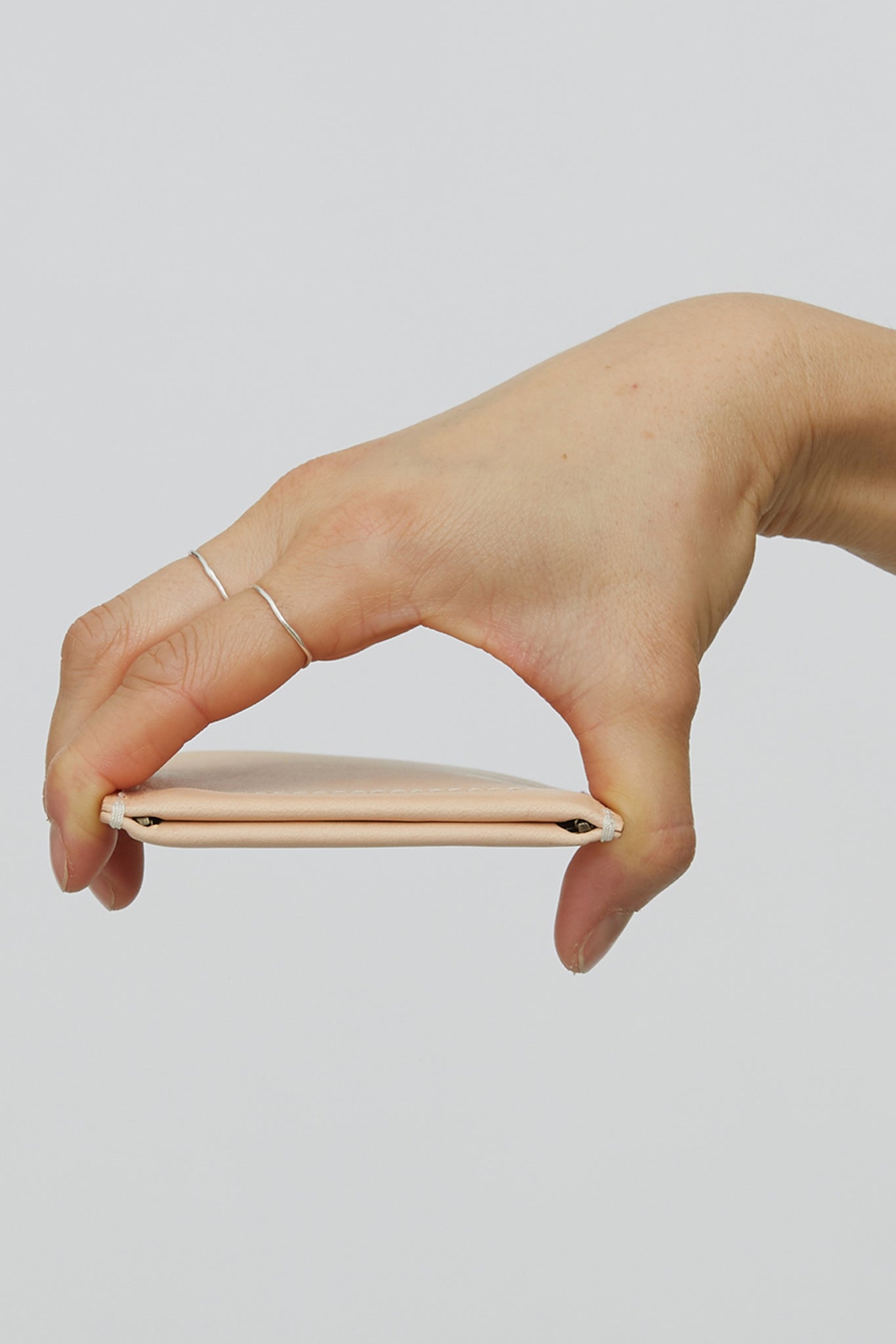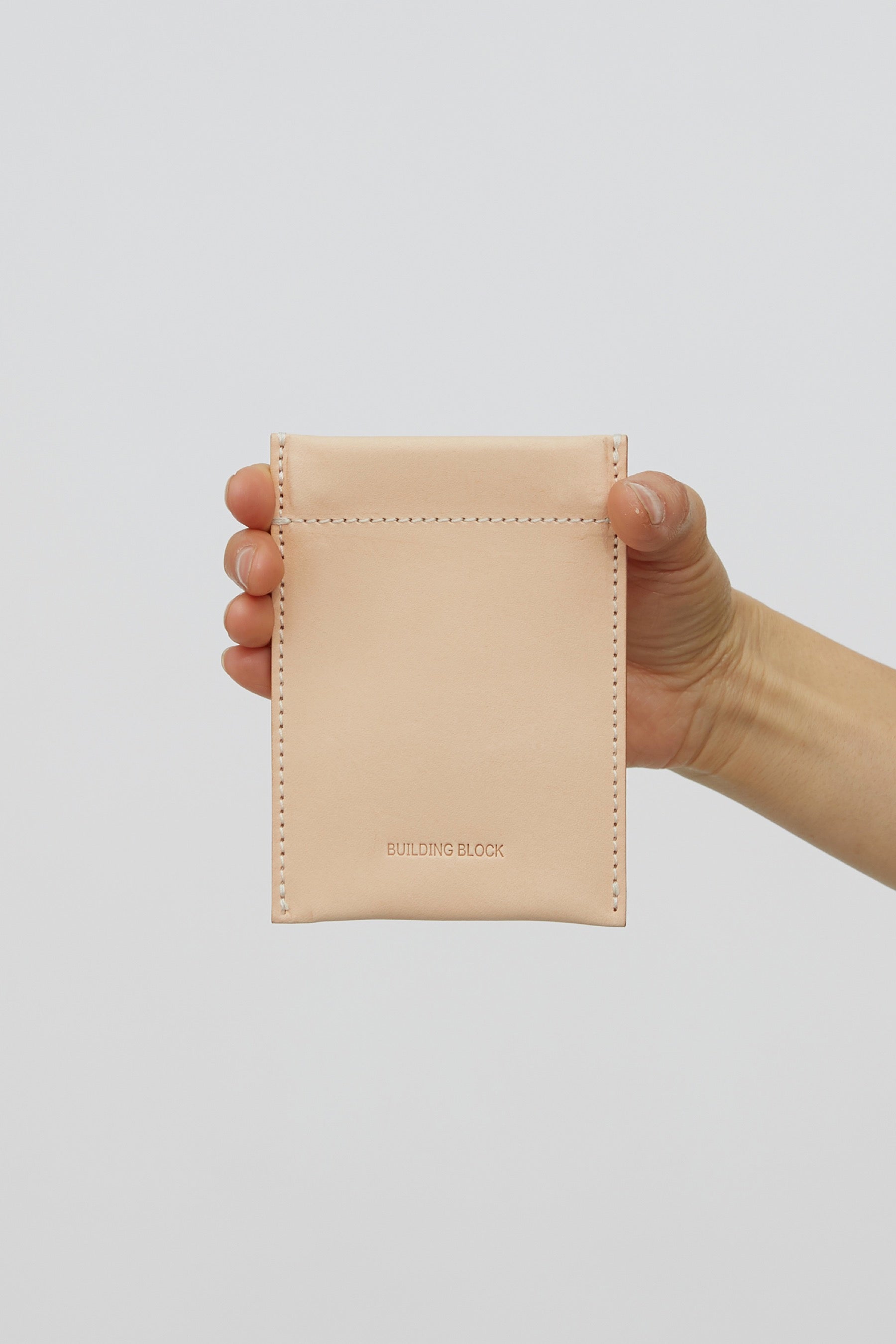 A card sleeve in Natural Vegetable Tan leather, Spring action top closure, Fits cards and folded cash.