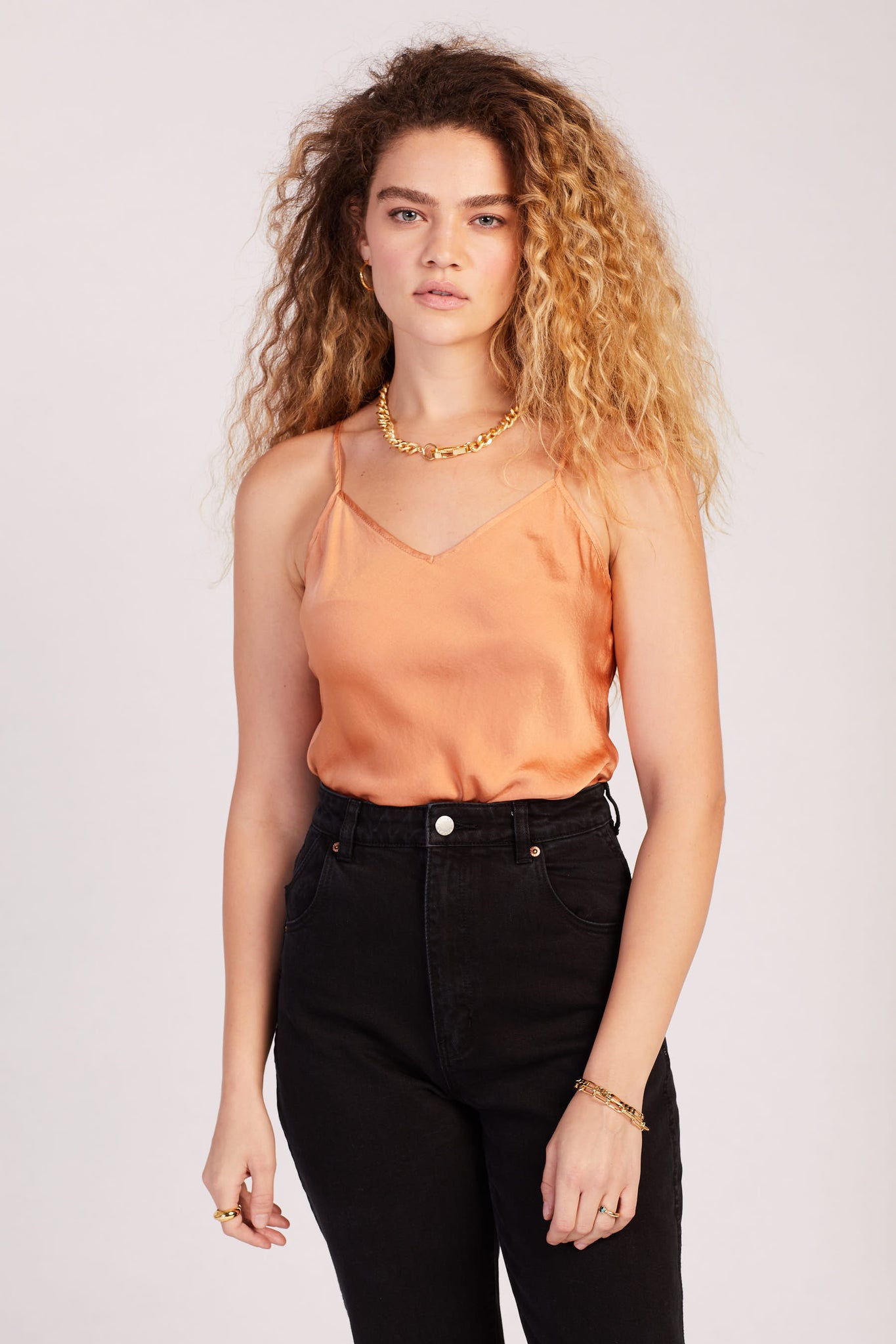 A classic silk cami is a staple for every closet, naturally dyed with cutch and featuring adjustable straps.