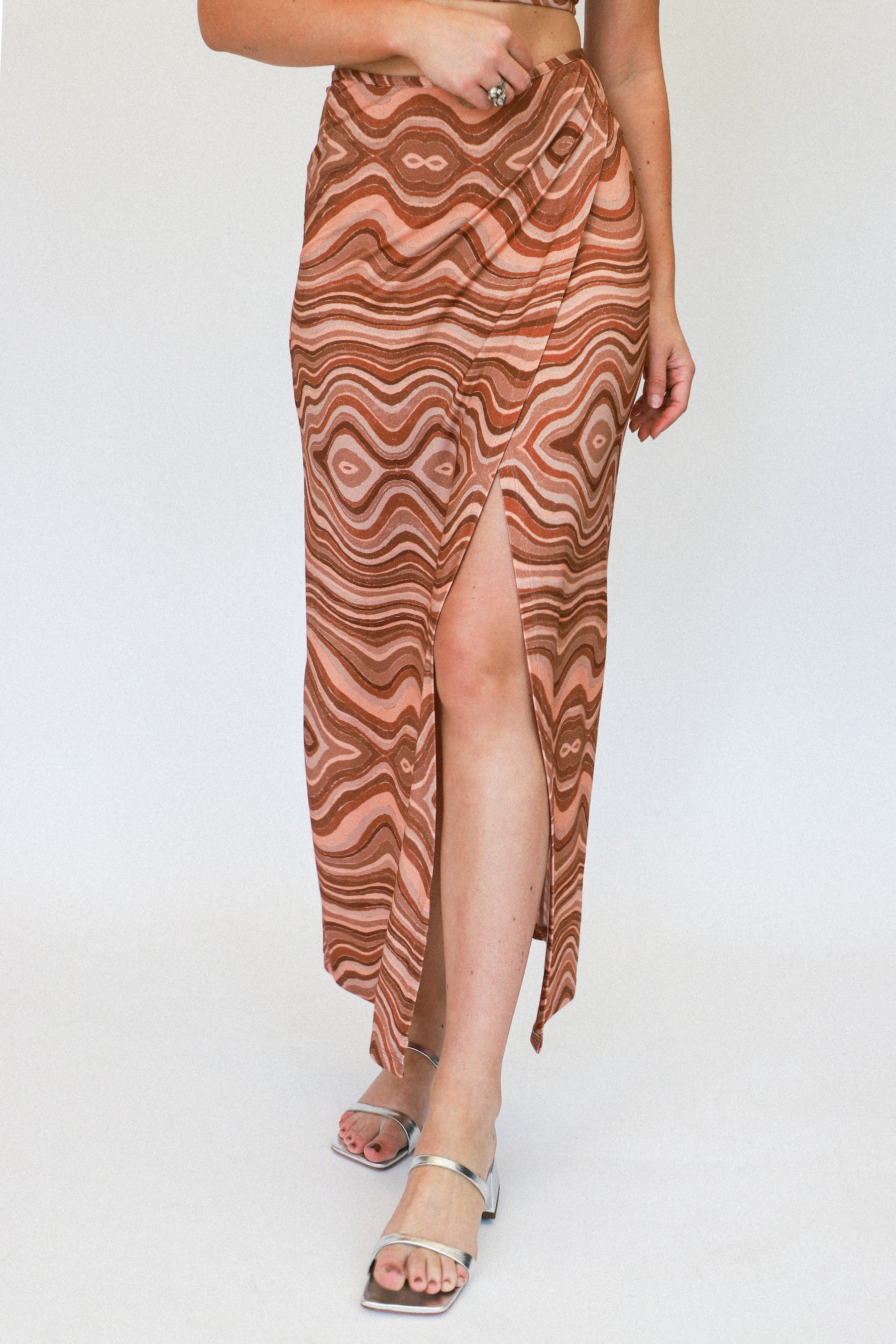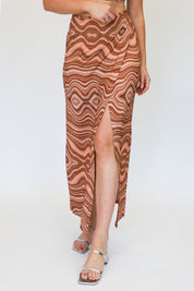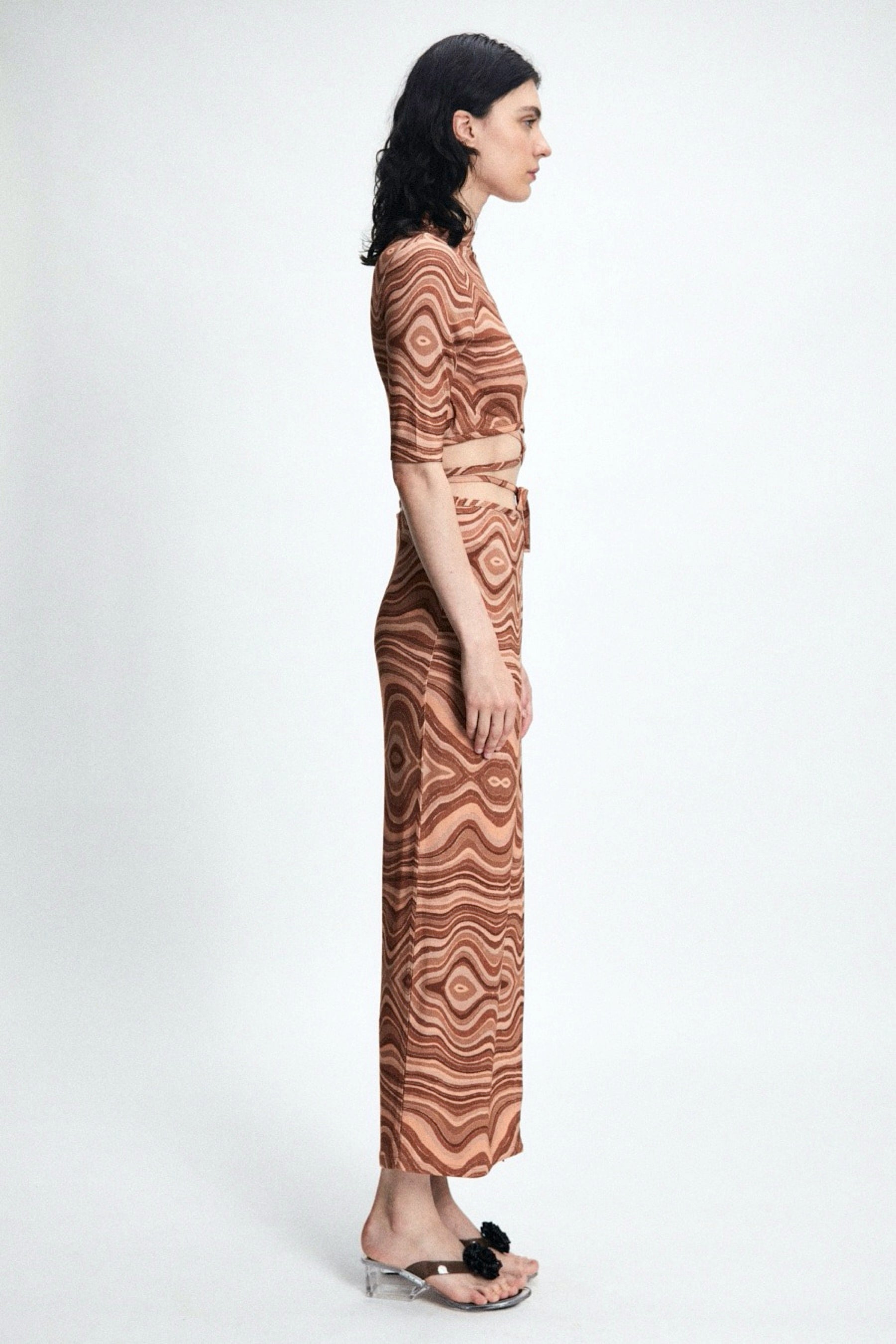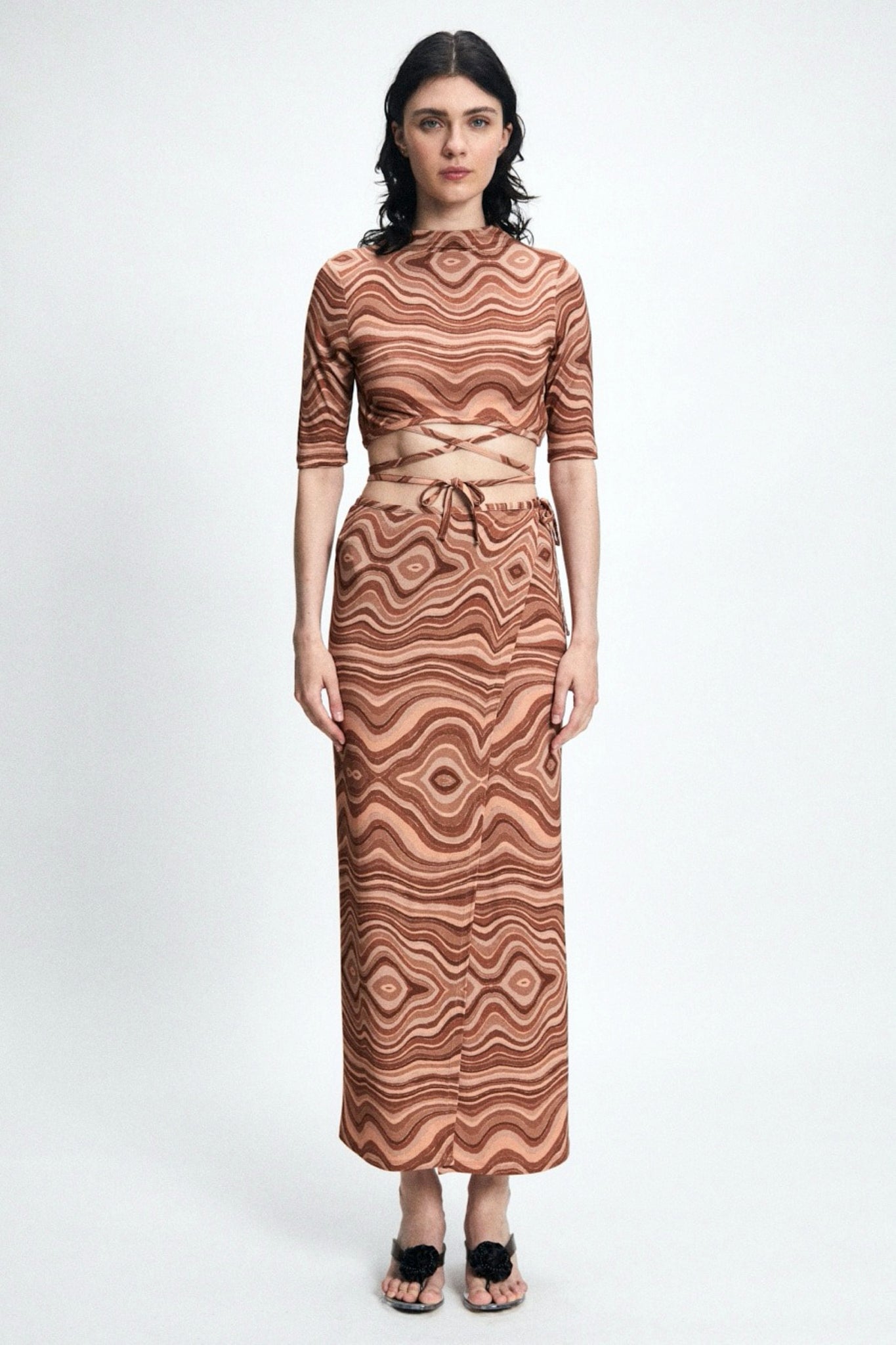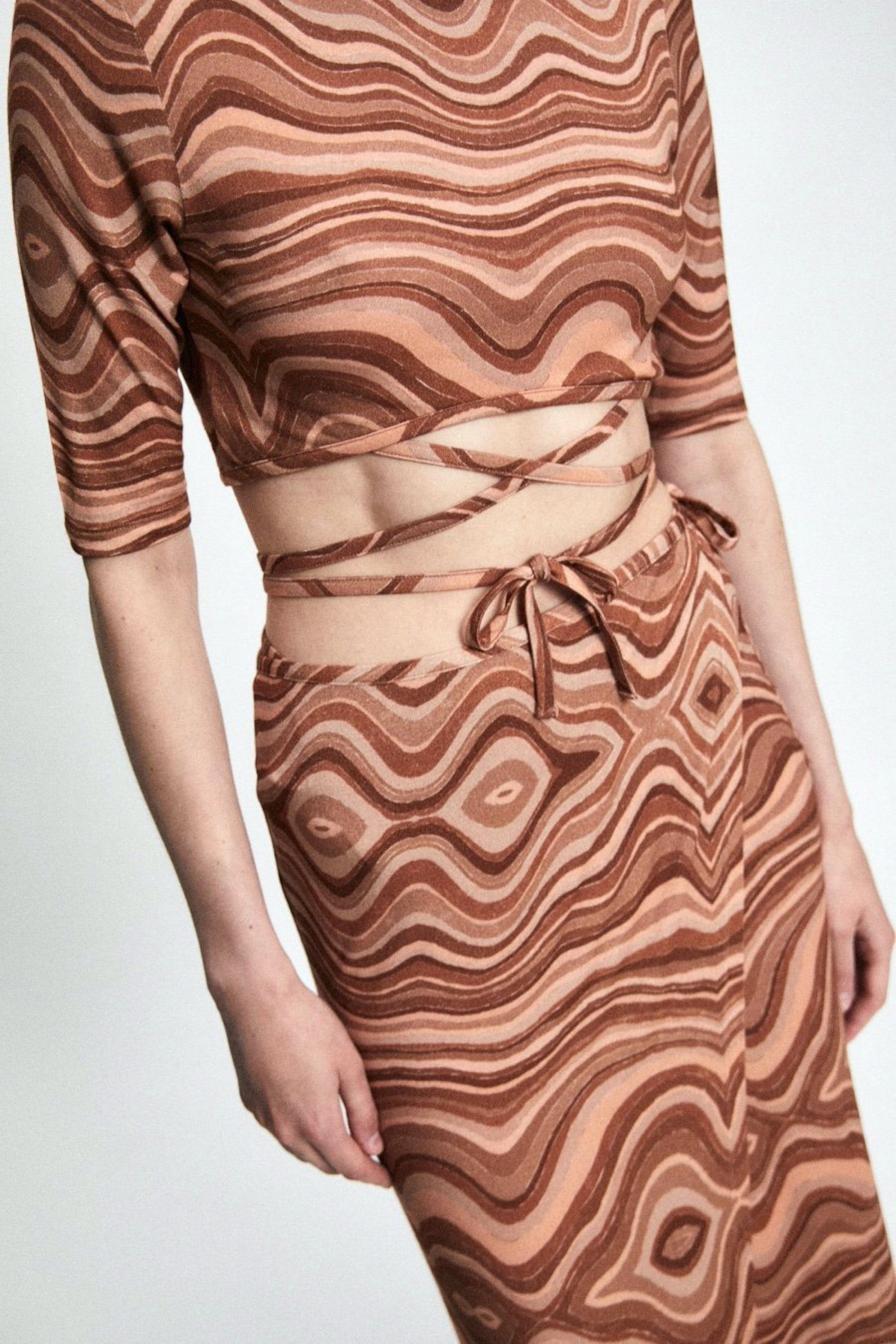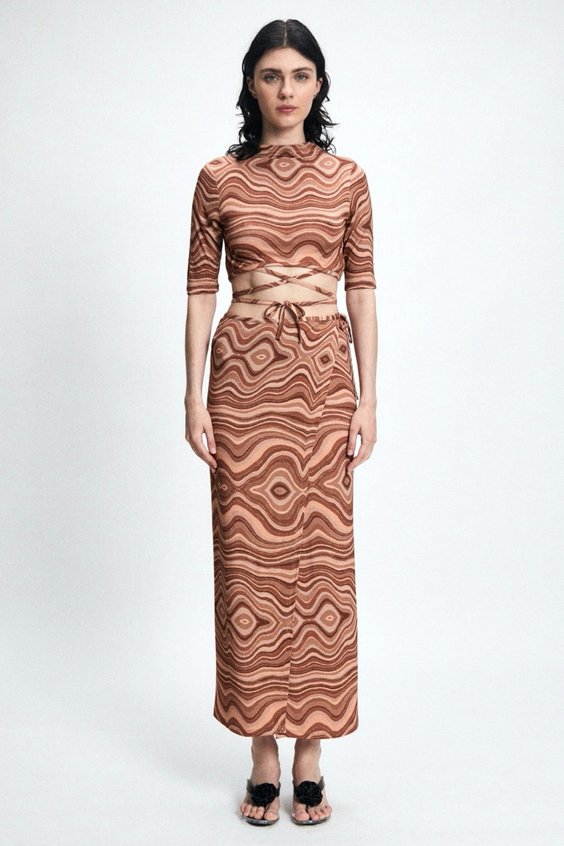 Printed fine-knit recycled viscose sarong skirt with a midi length and double straps at the waist for adjustment.