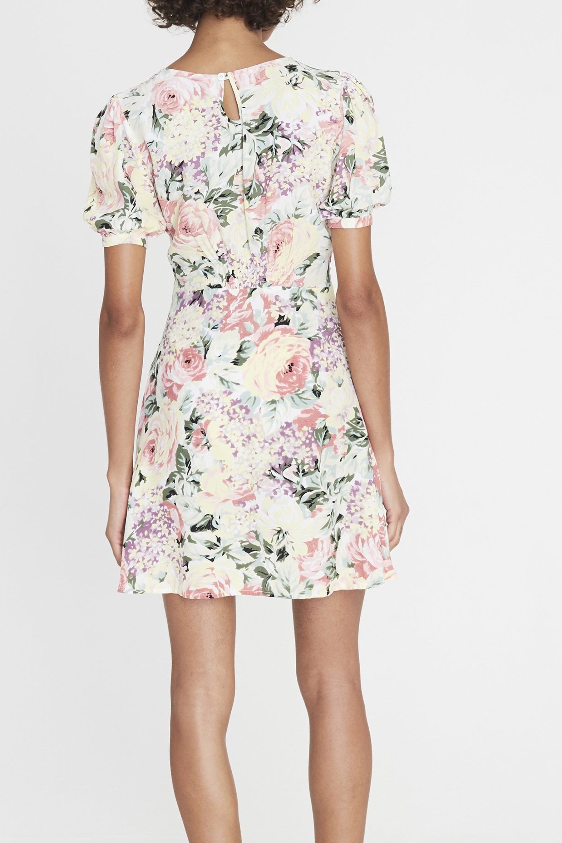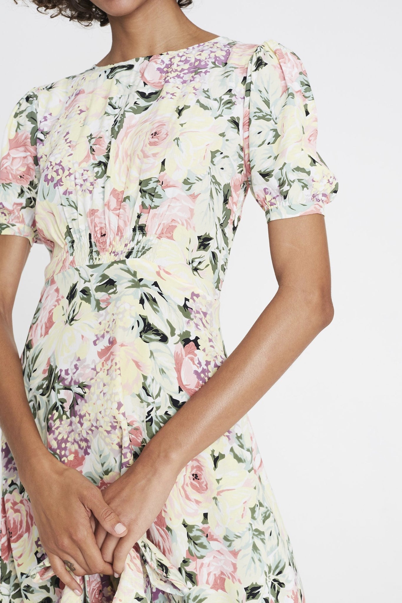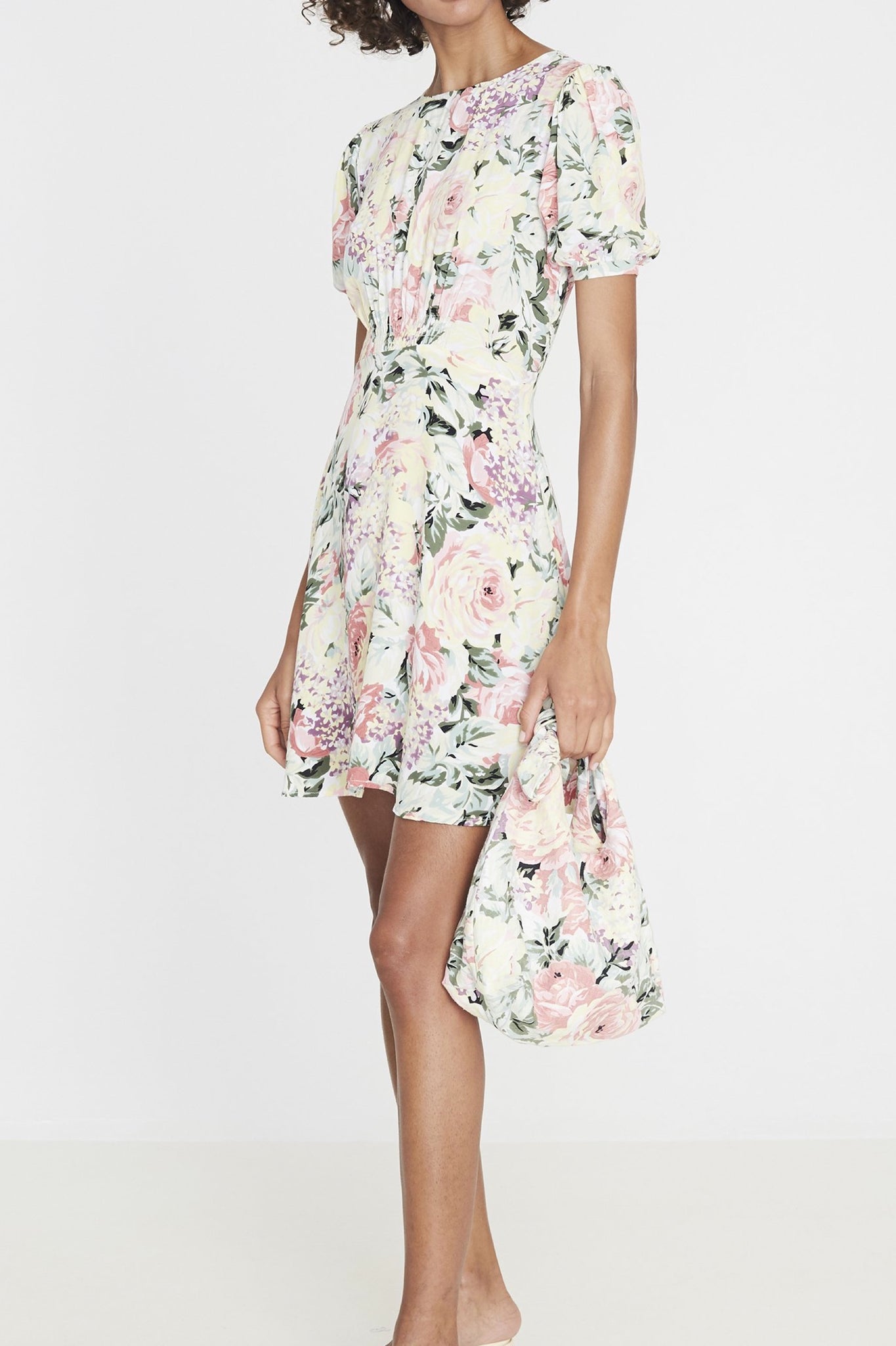 The Sidonie Mini Dress in venissa floral print is a key style in the riviera collection. This ladylike silhouette features a high neckline, delicate sleeves and an invisible side zip. Designed to be fixed through the waist with an a-line skirt. Pair with a vintage heel for your next garden party.