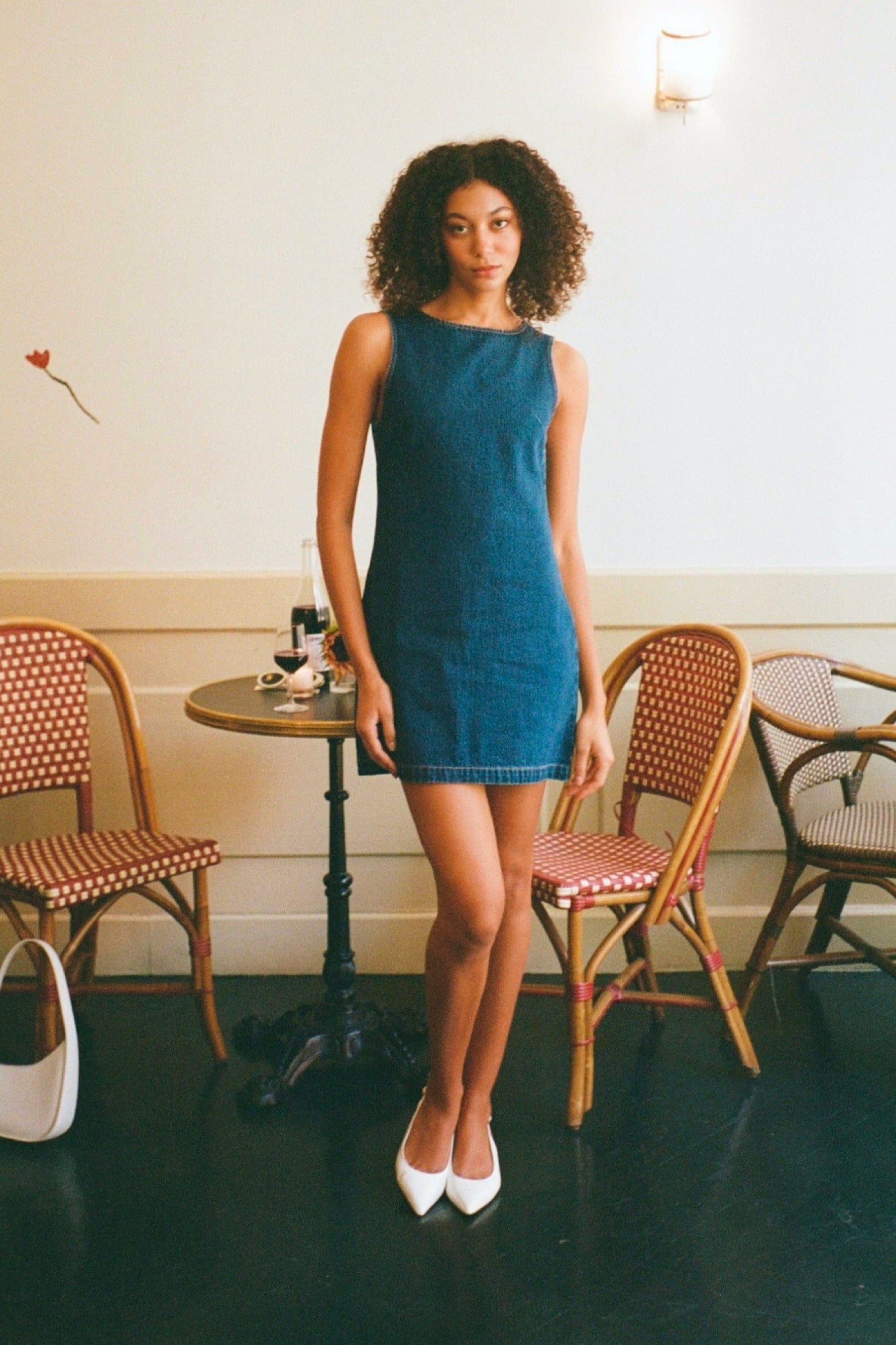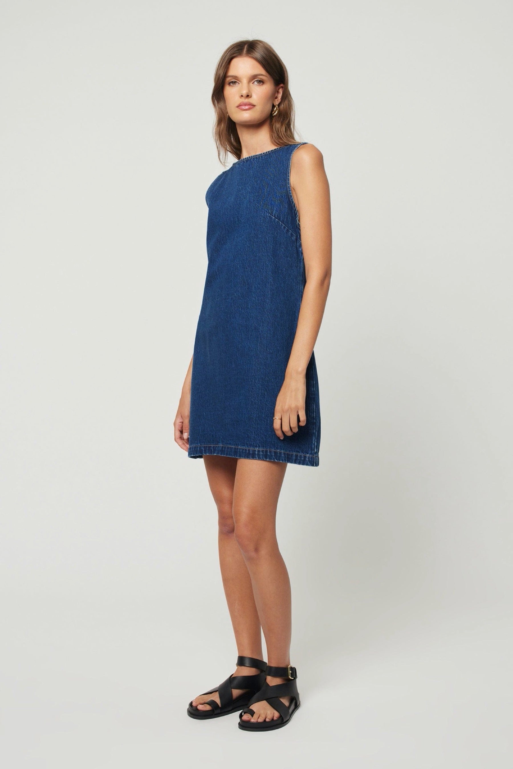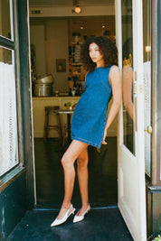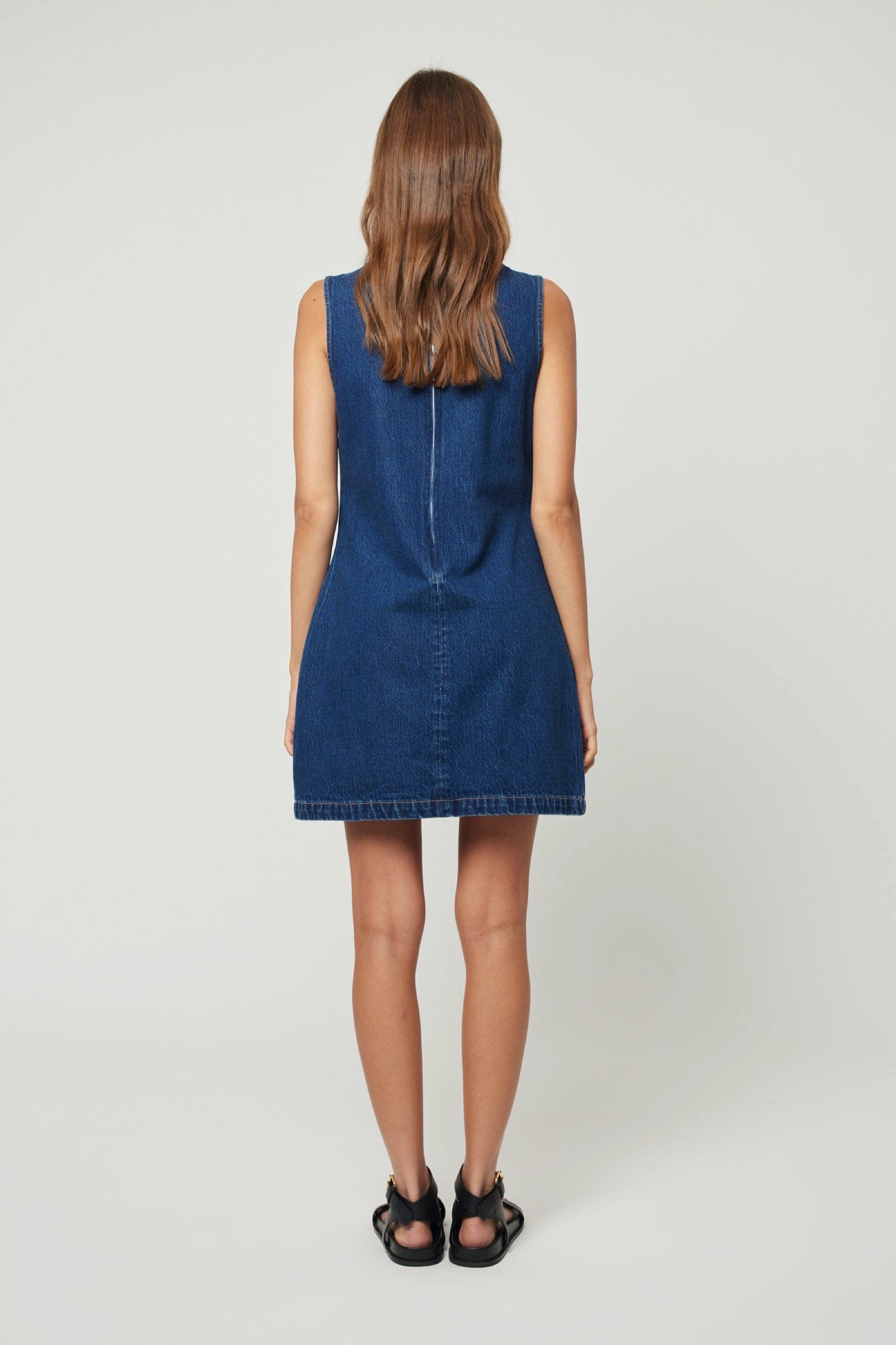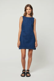 Classic shift silhouette, with center back invisible zip in a bright dark blue rigid denim with a beautiful high low effect. The Lyocell cotton denim has a super soft hand feel and nice drape and is more sustainable than cotton.