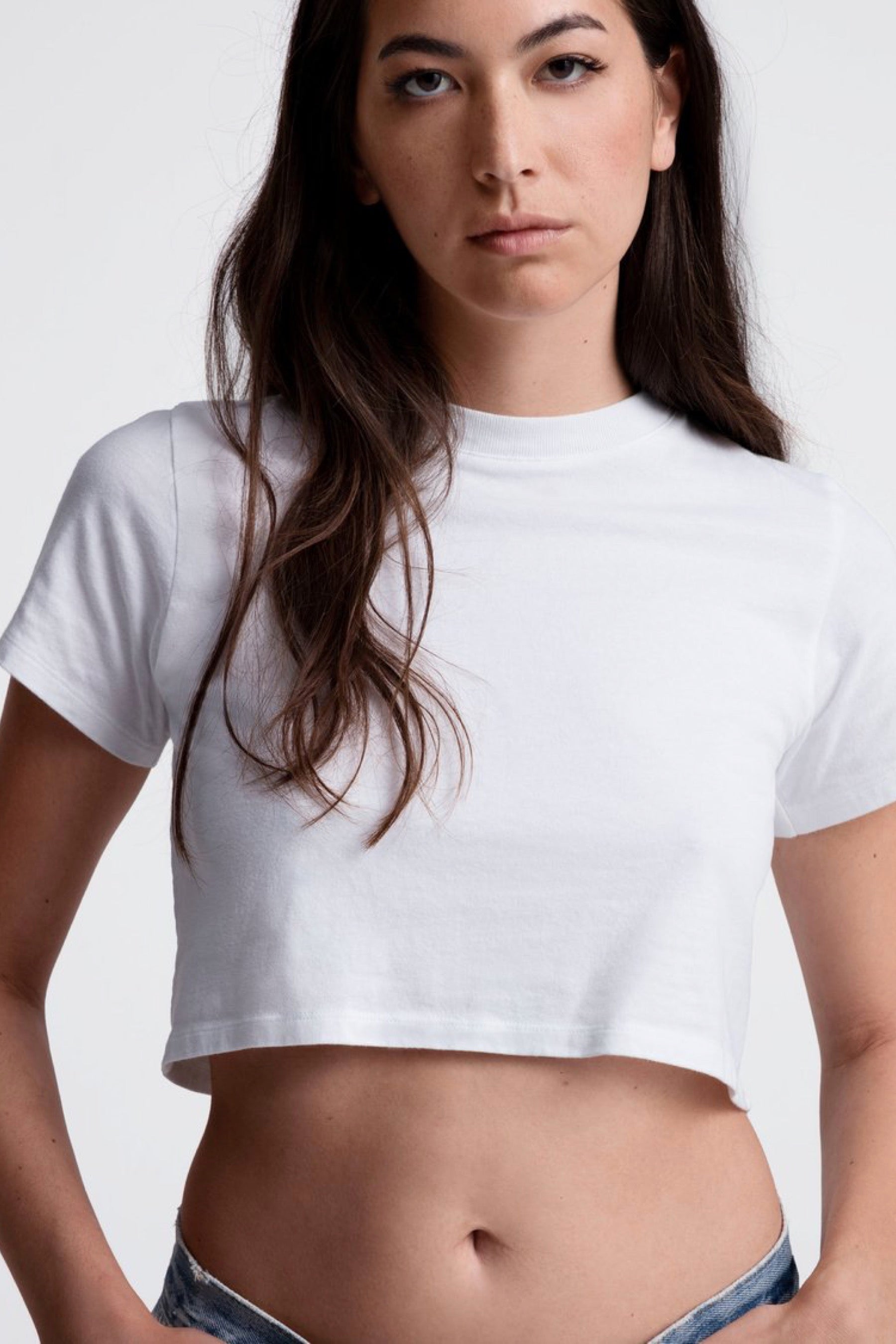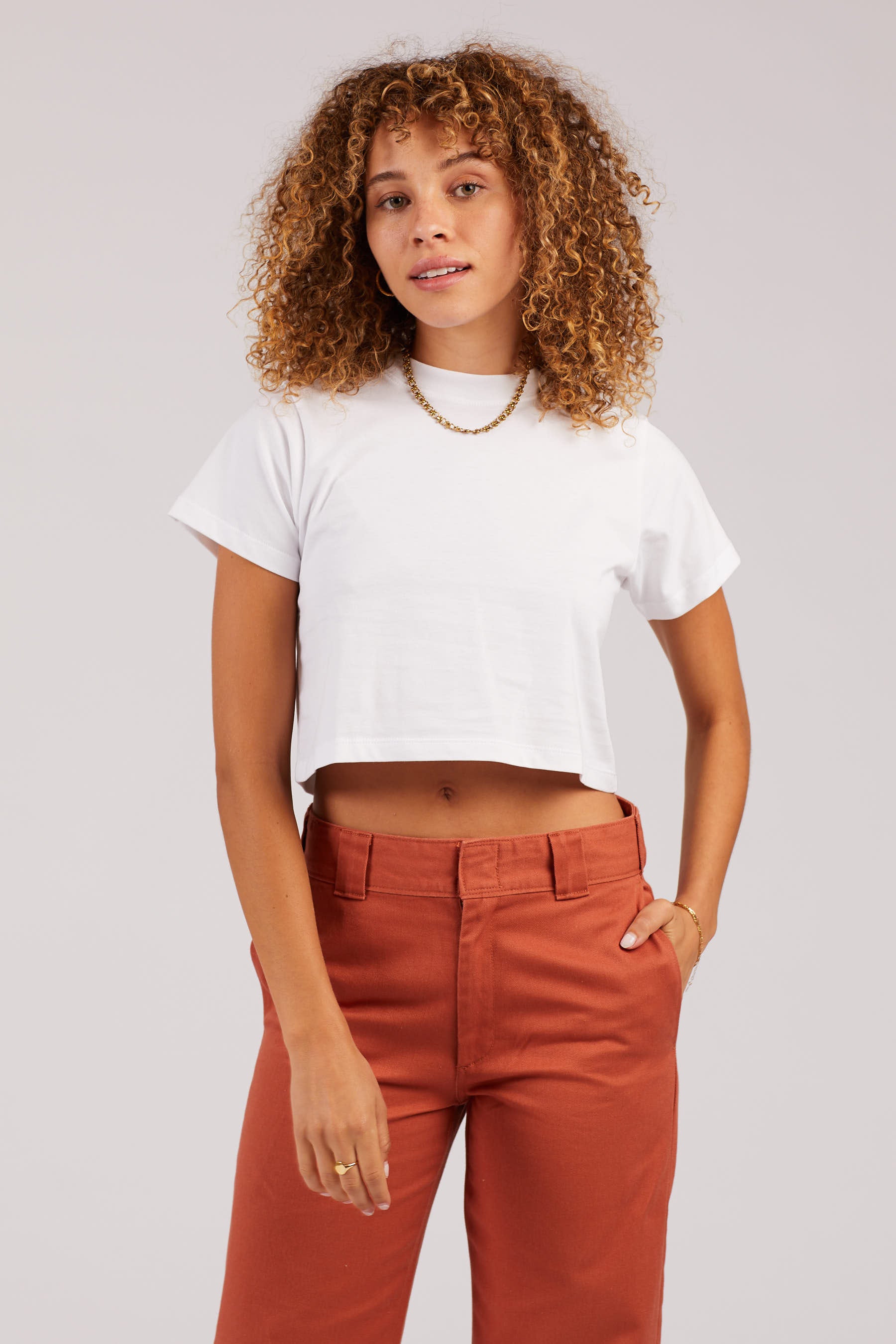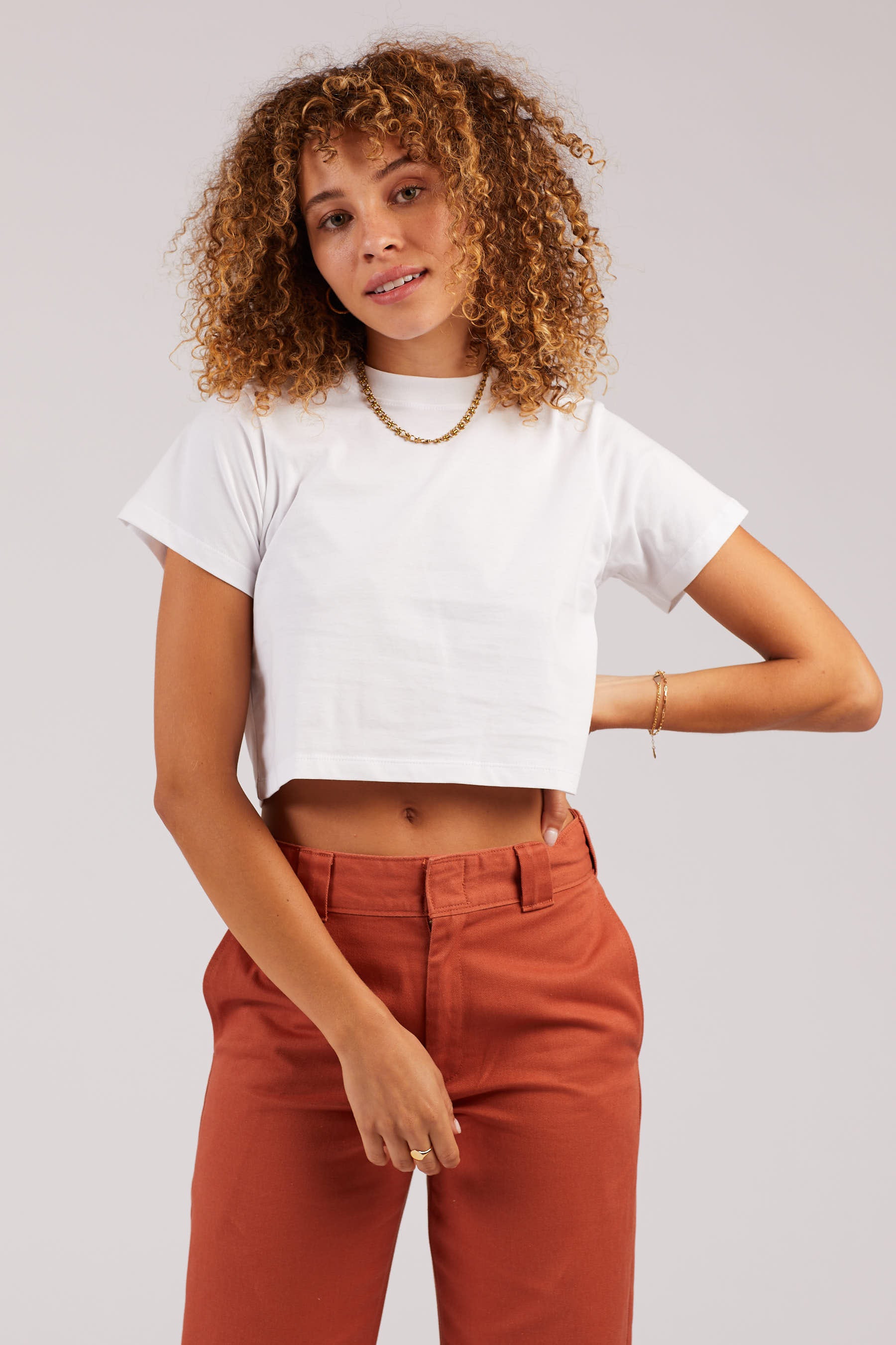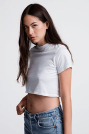 The Baby Tee features shrunken sleeves, a high cut ribbed neck, and the perfect amount of swing through the body. Model is wearing a size Small.