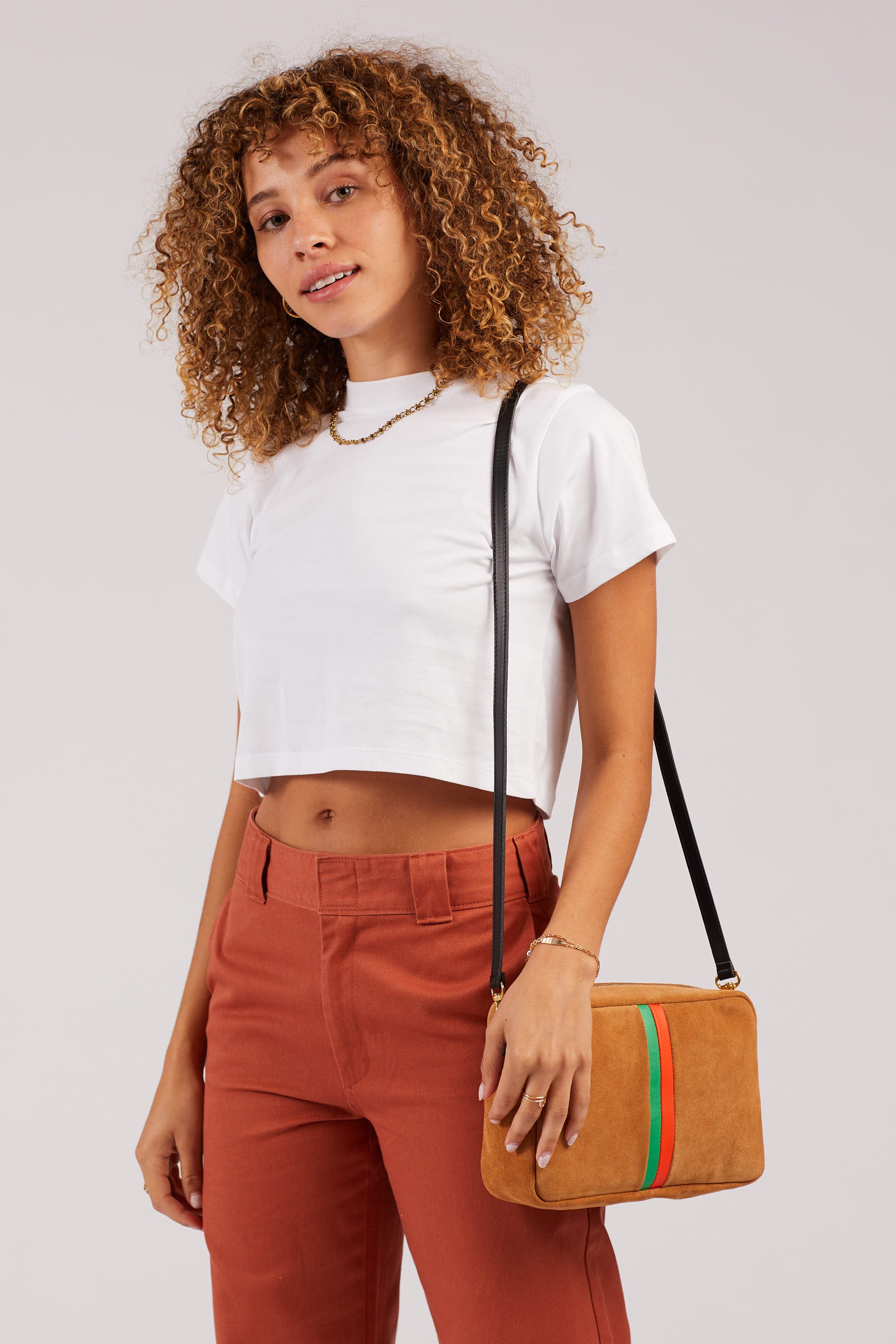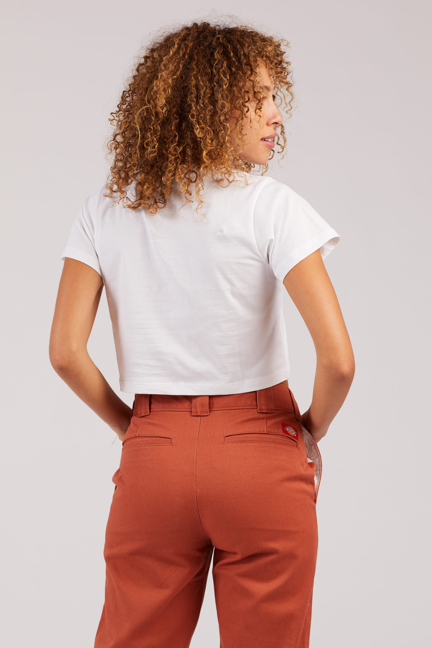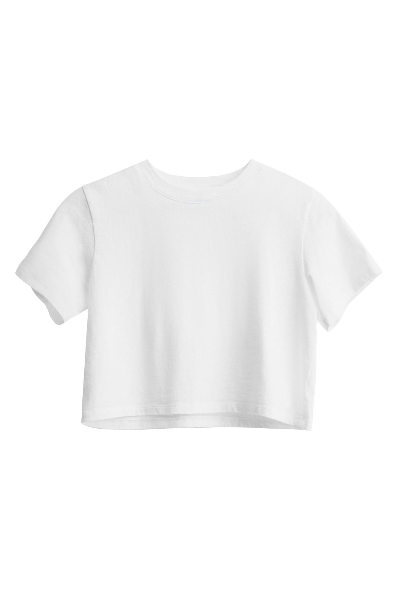 The Baby Tee features shrunken sleeves, a high cut ribbed neck, and the perfect amount of swing through the body. Model is wearing a size Small.