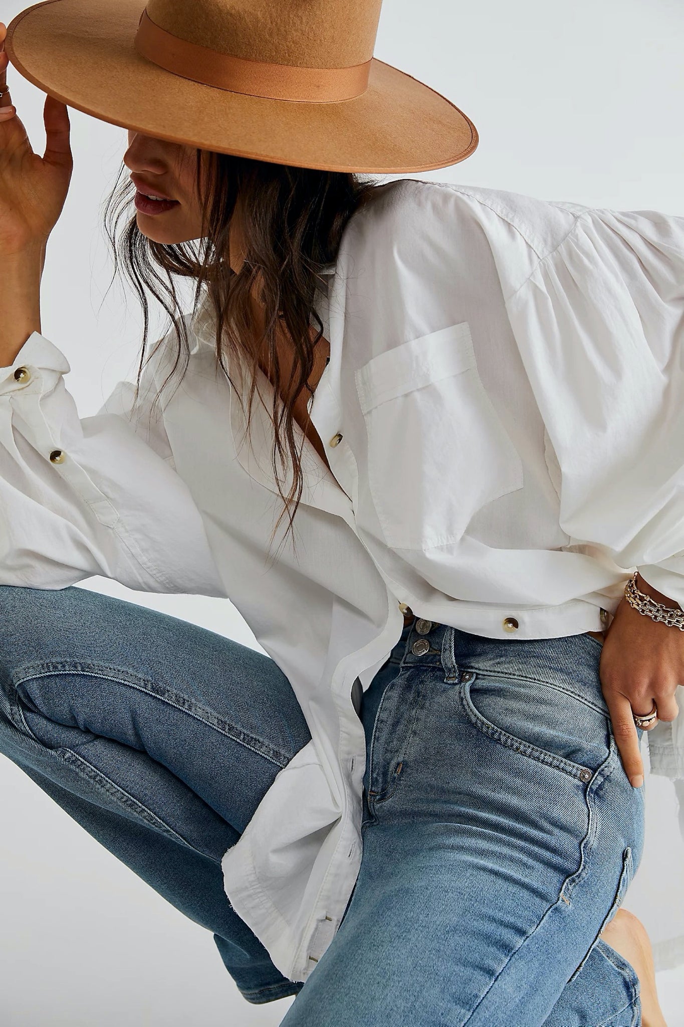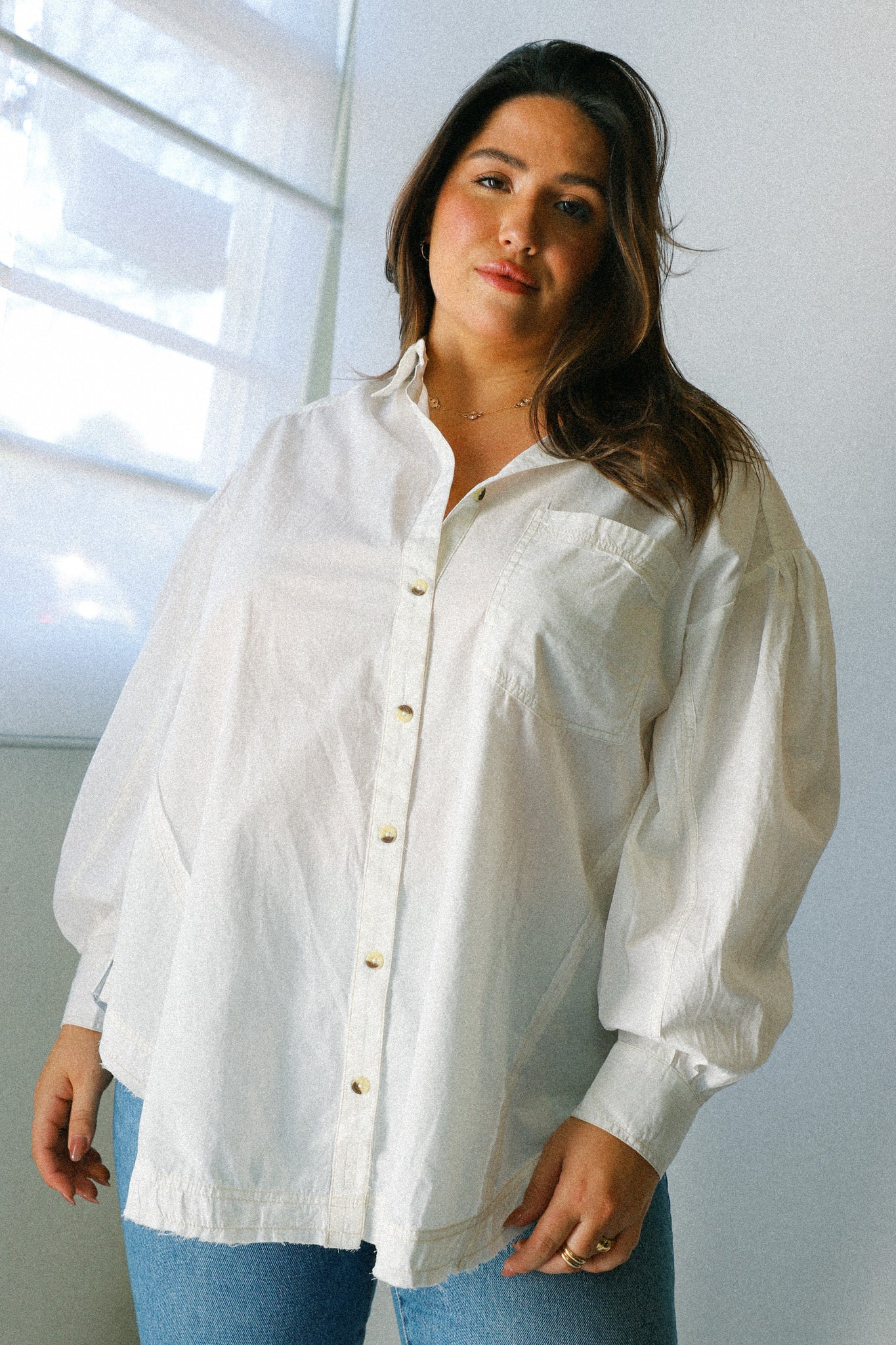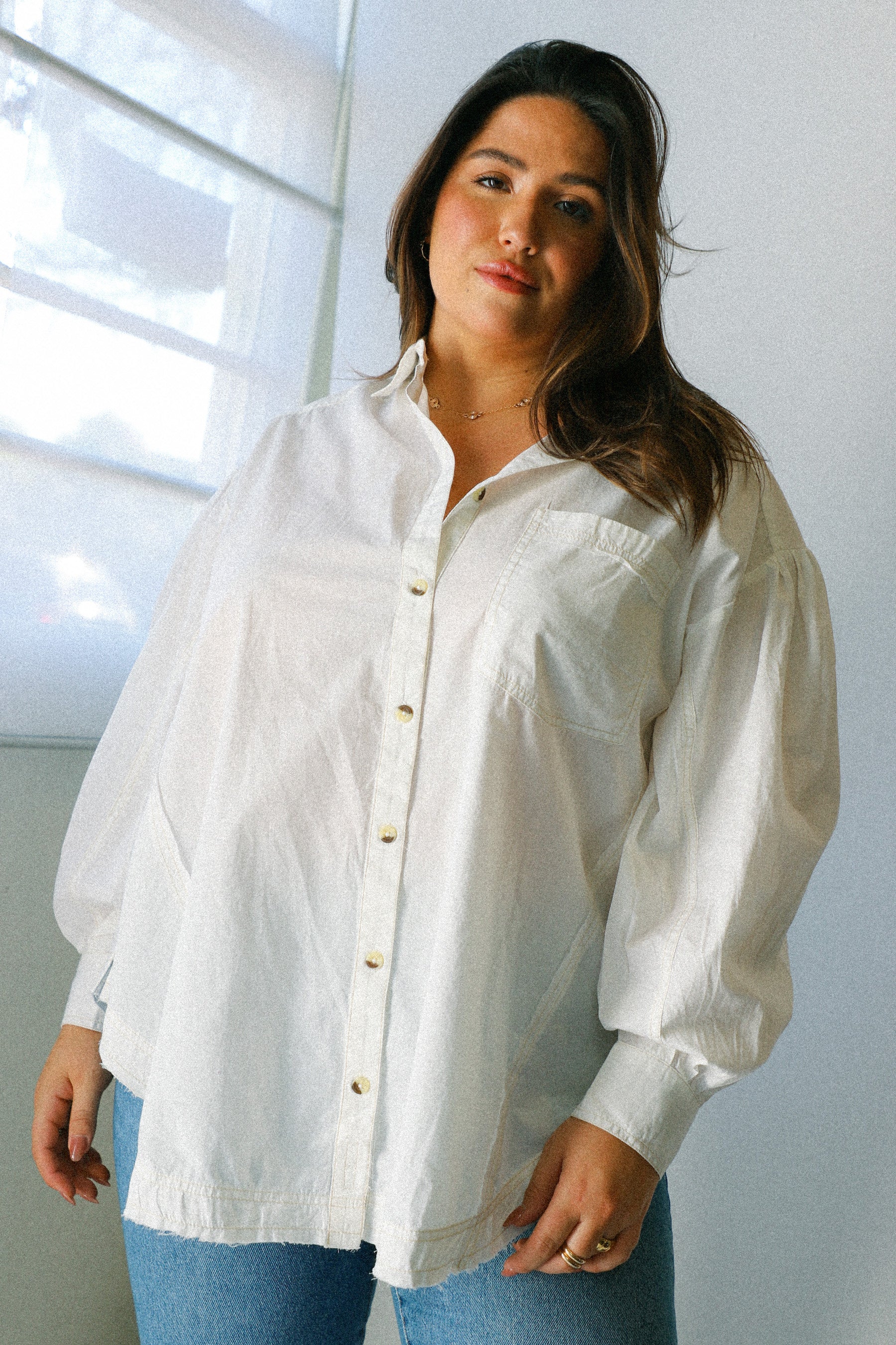 Classic and versatile button-down top featured in a boxy & oversized silhouette with dropped puff sleeves and curved bottom hem for added shape.