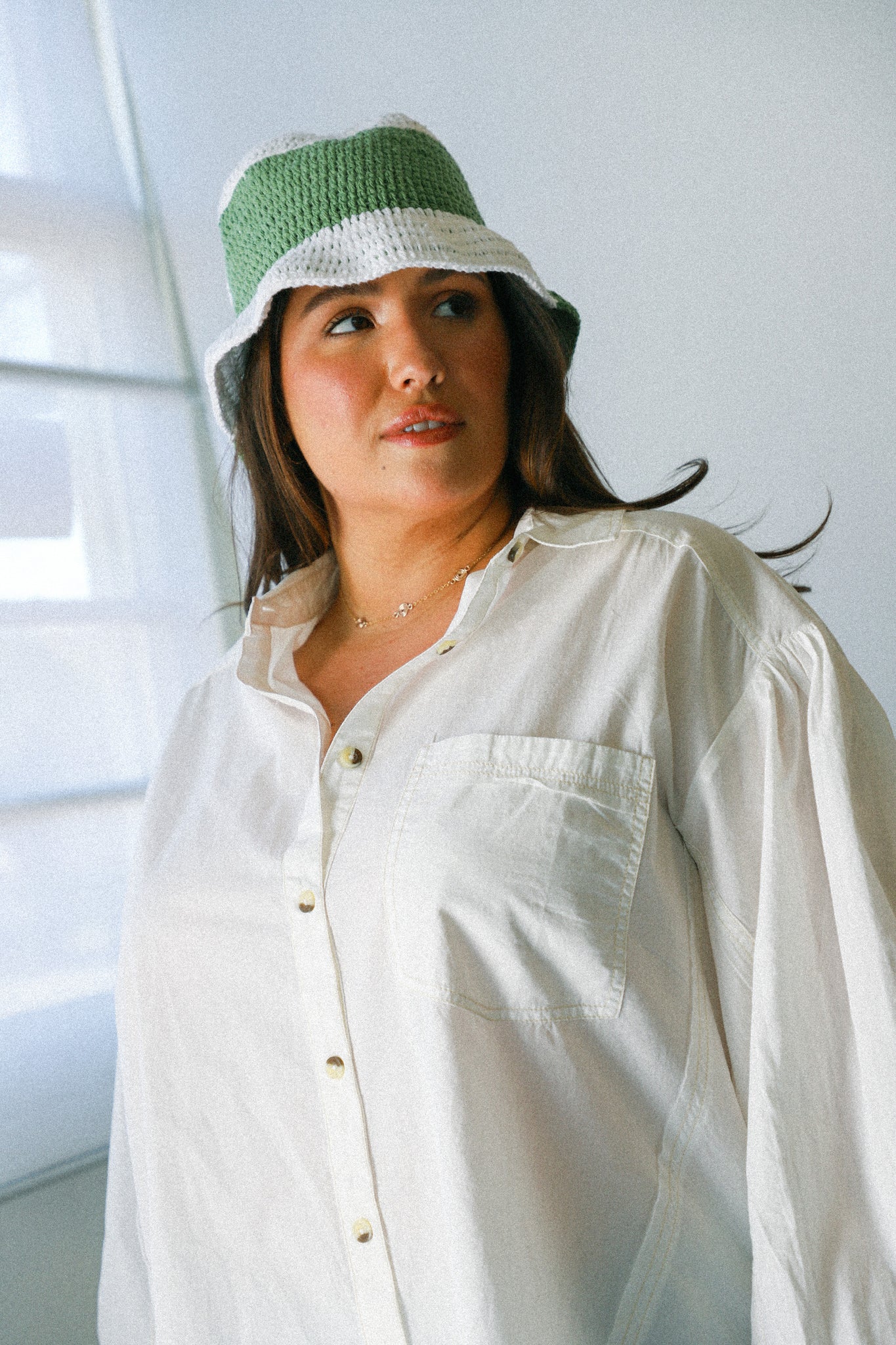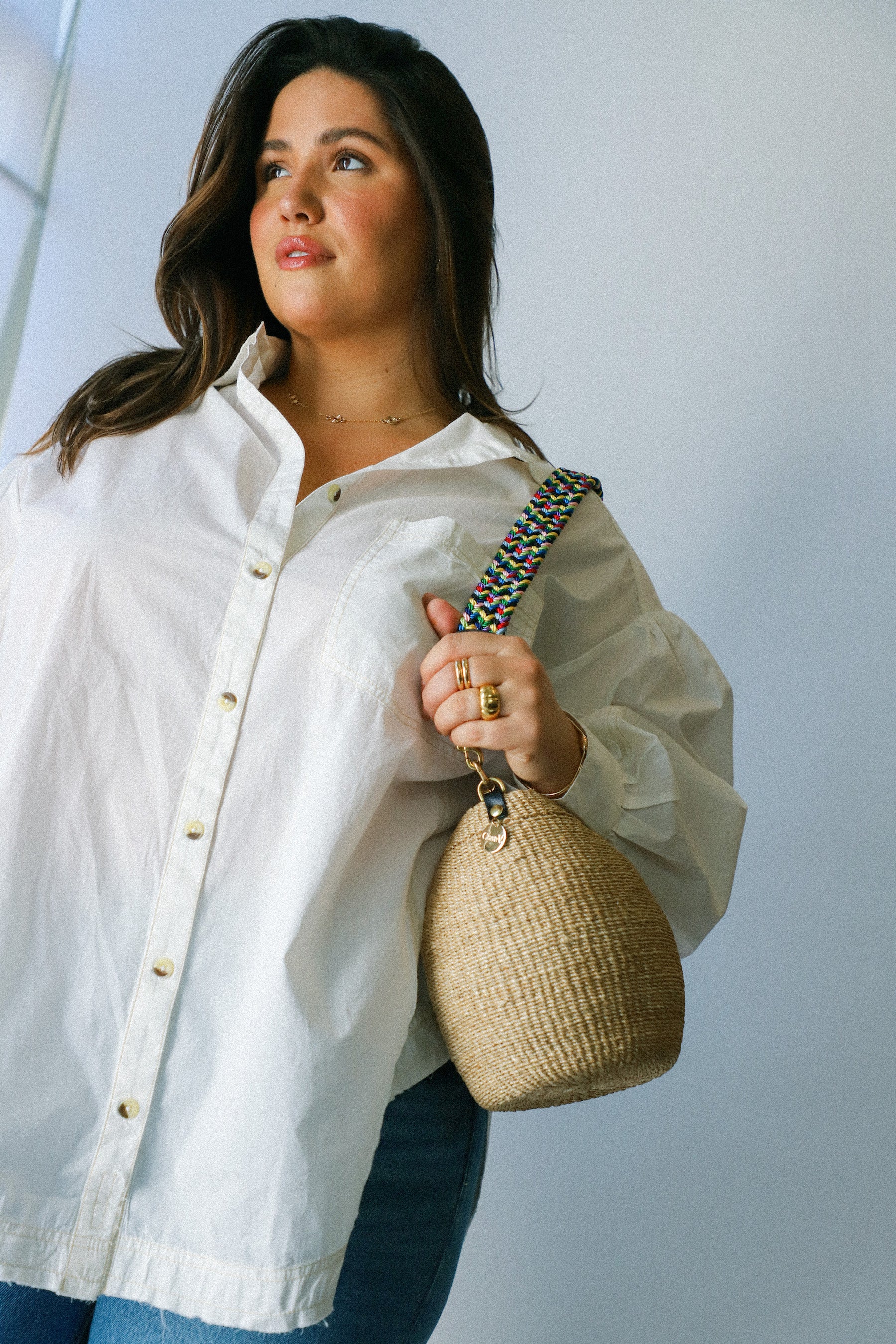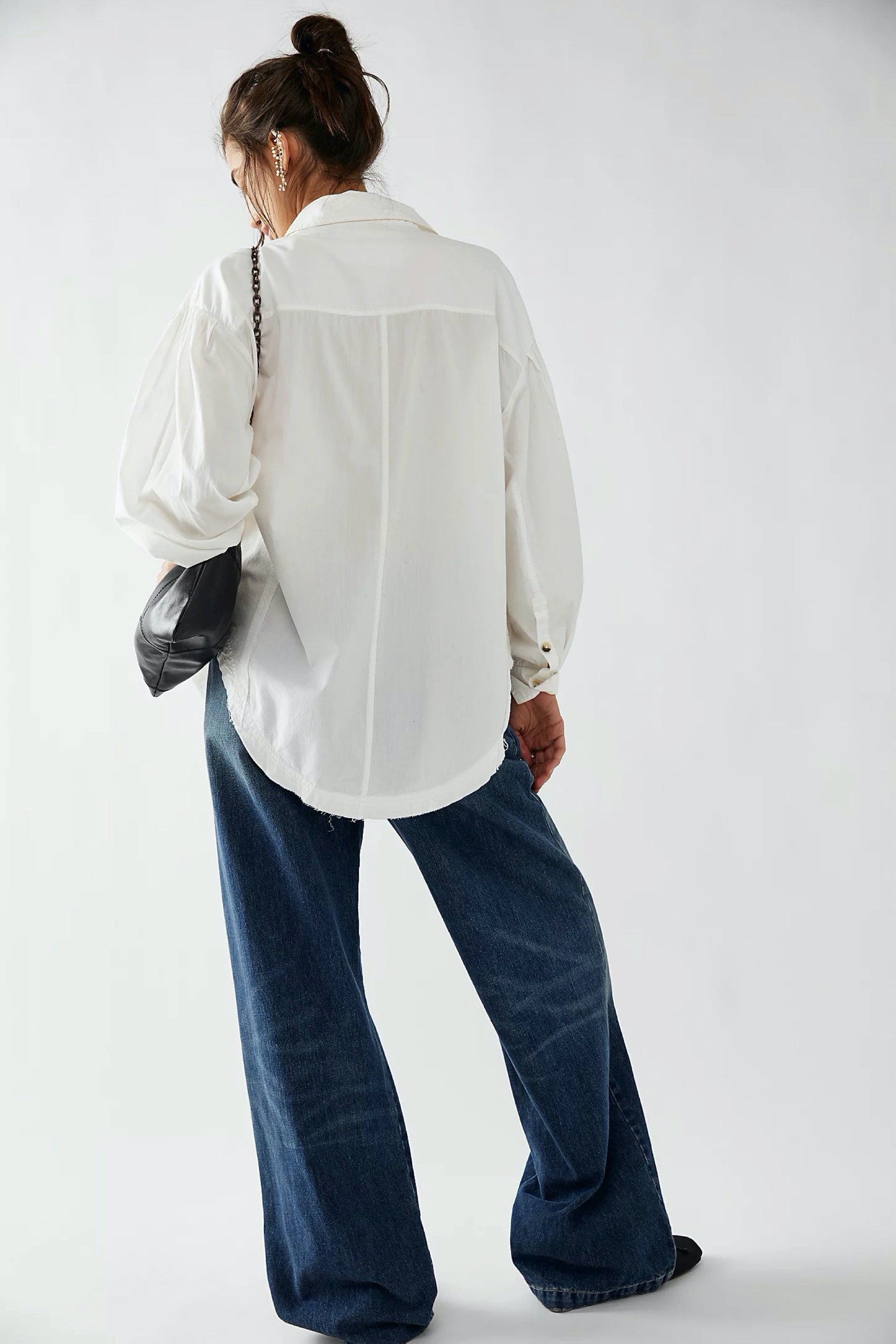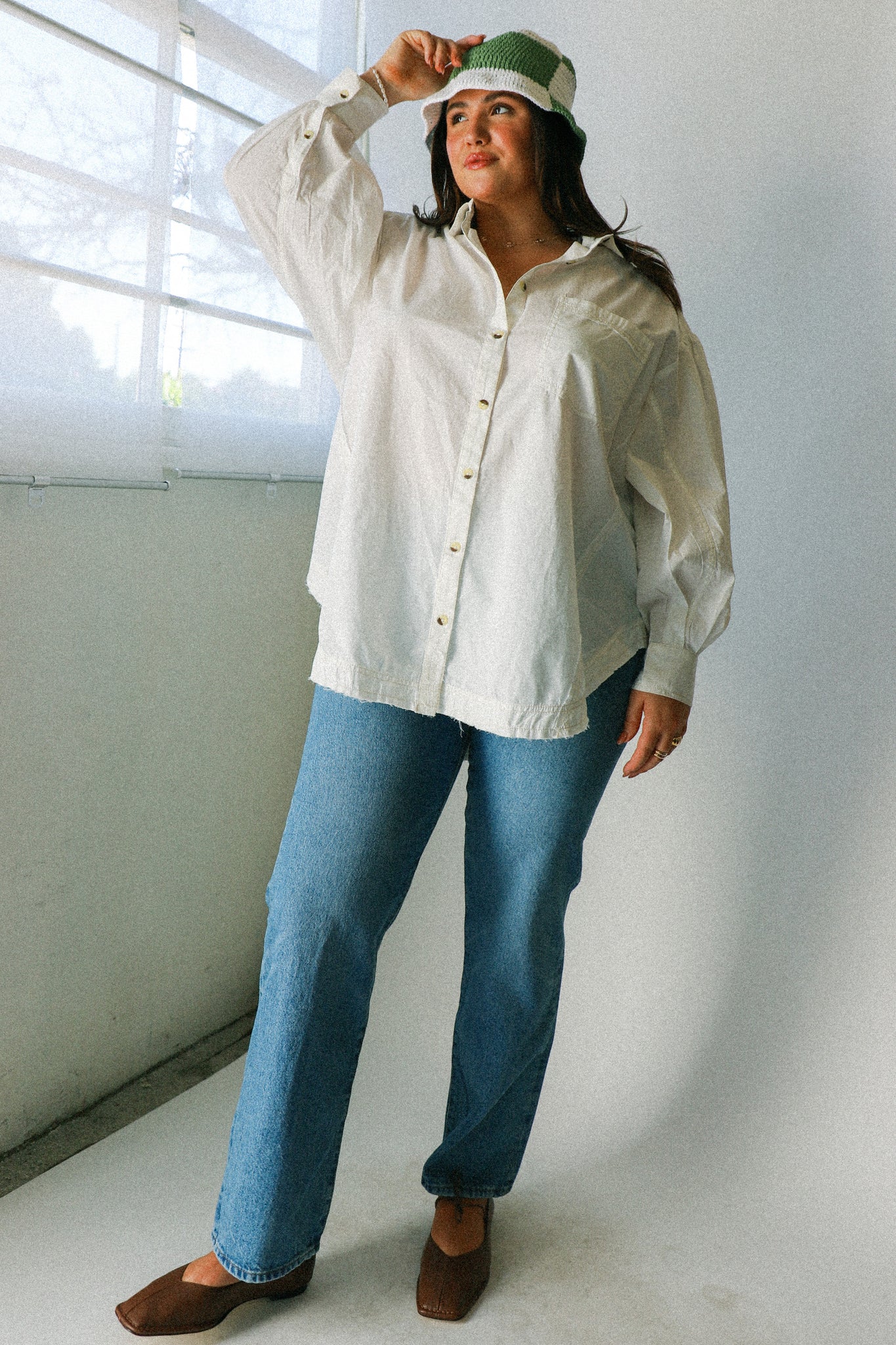 Classic and versatile button-down top featured in a boxy & oversized silhouette with dropped puff sleeves and curved bottom hem for added shape.