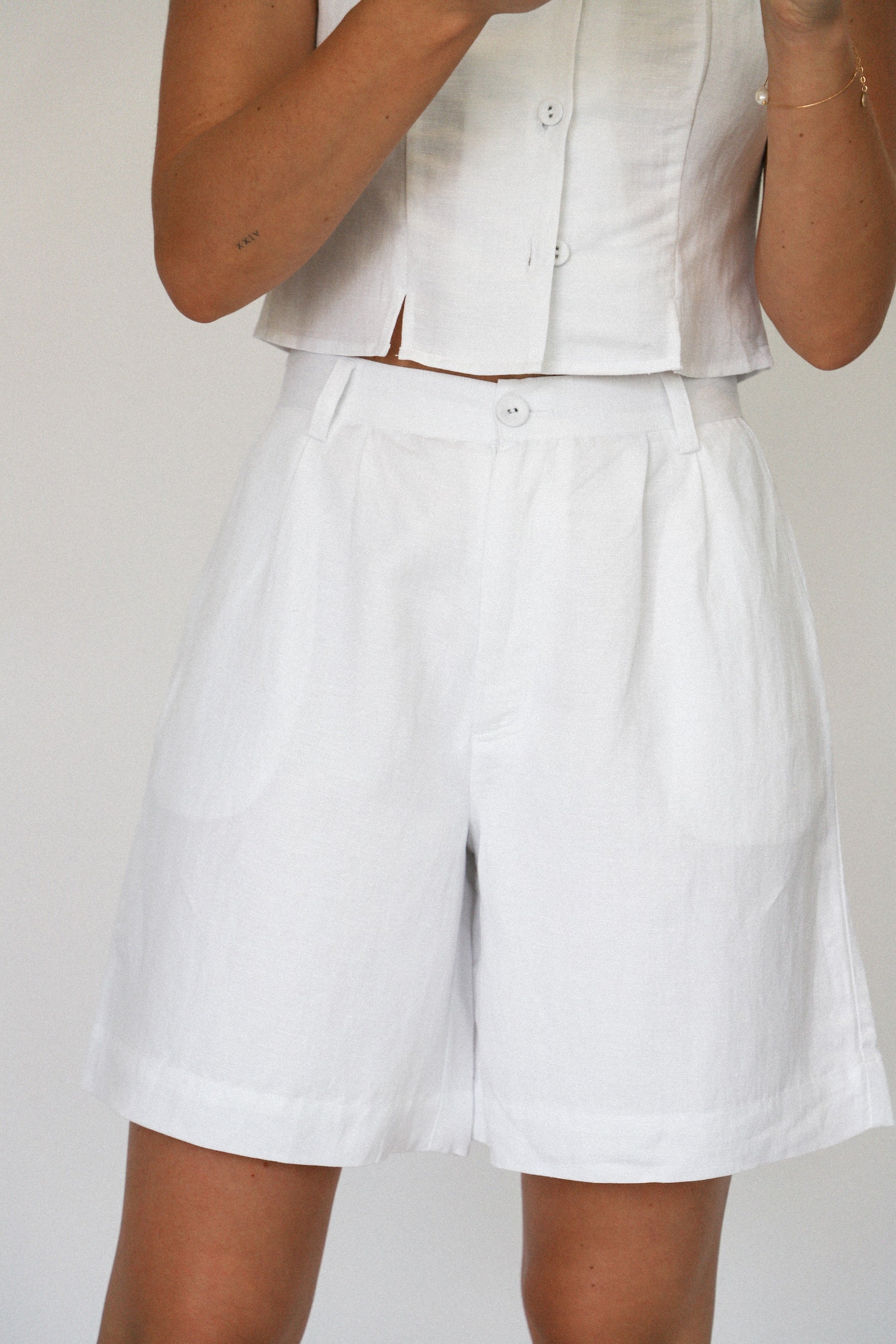 Elevate your summer style with our White Horizon Linen Shorts. These high-waisted shorts feature a flattering pleat front design and a fly front with a button closure for a secure fit. Be ready to turn heads and feel confident in these must-have shorts!