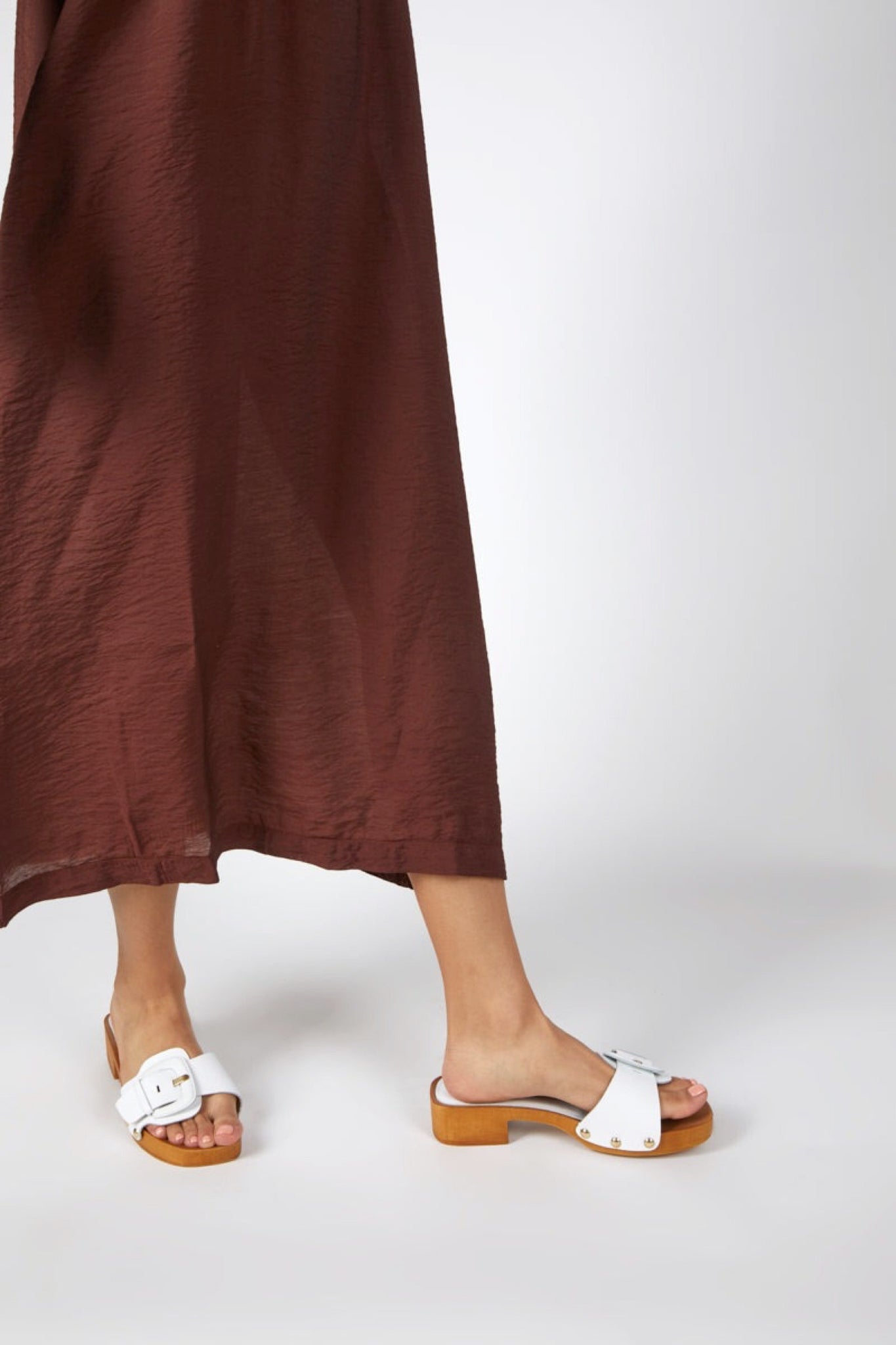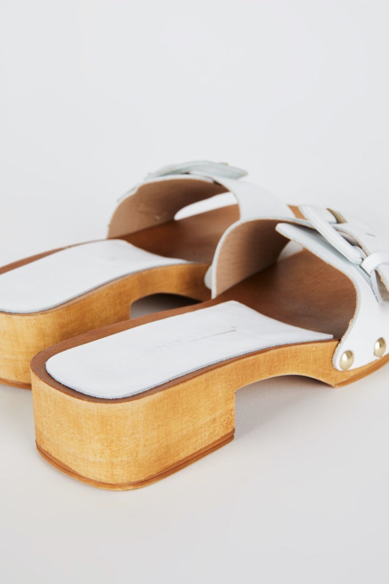 Lightweight and classic these clogs feature a belt inspired upper buckle with gold tone rivet details and a faux wood flex base for extra comfort.