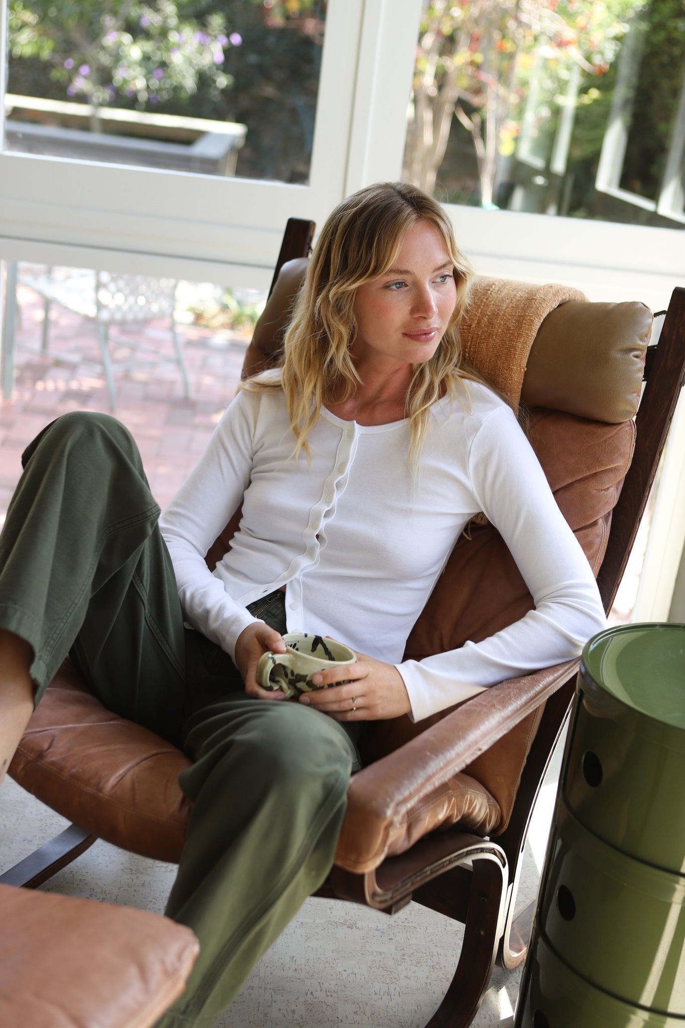 A long sleeve baby rib cardigan with button-closure and a scooped neckline. Made in Los Angeles from ultra-soft, locally-knit cotton baby rib.