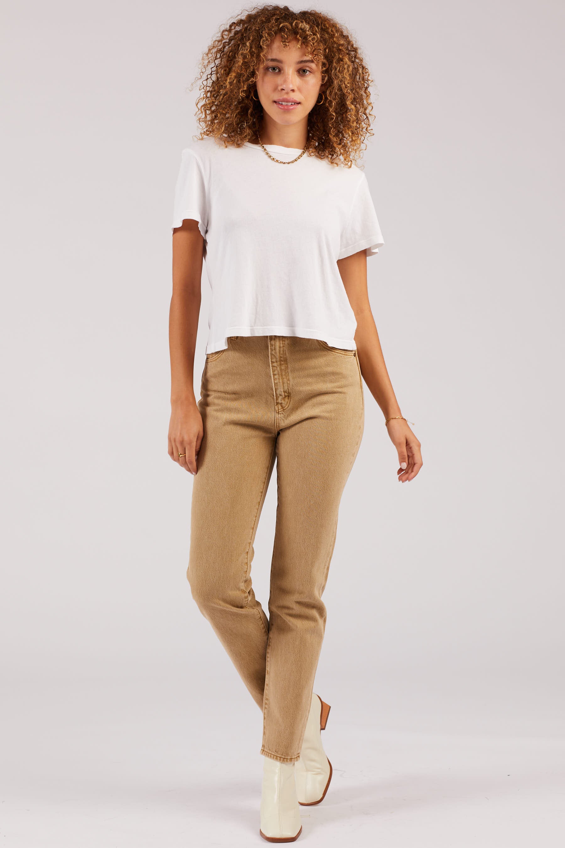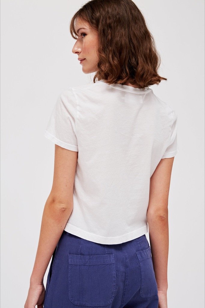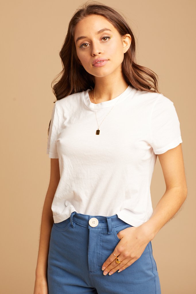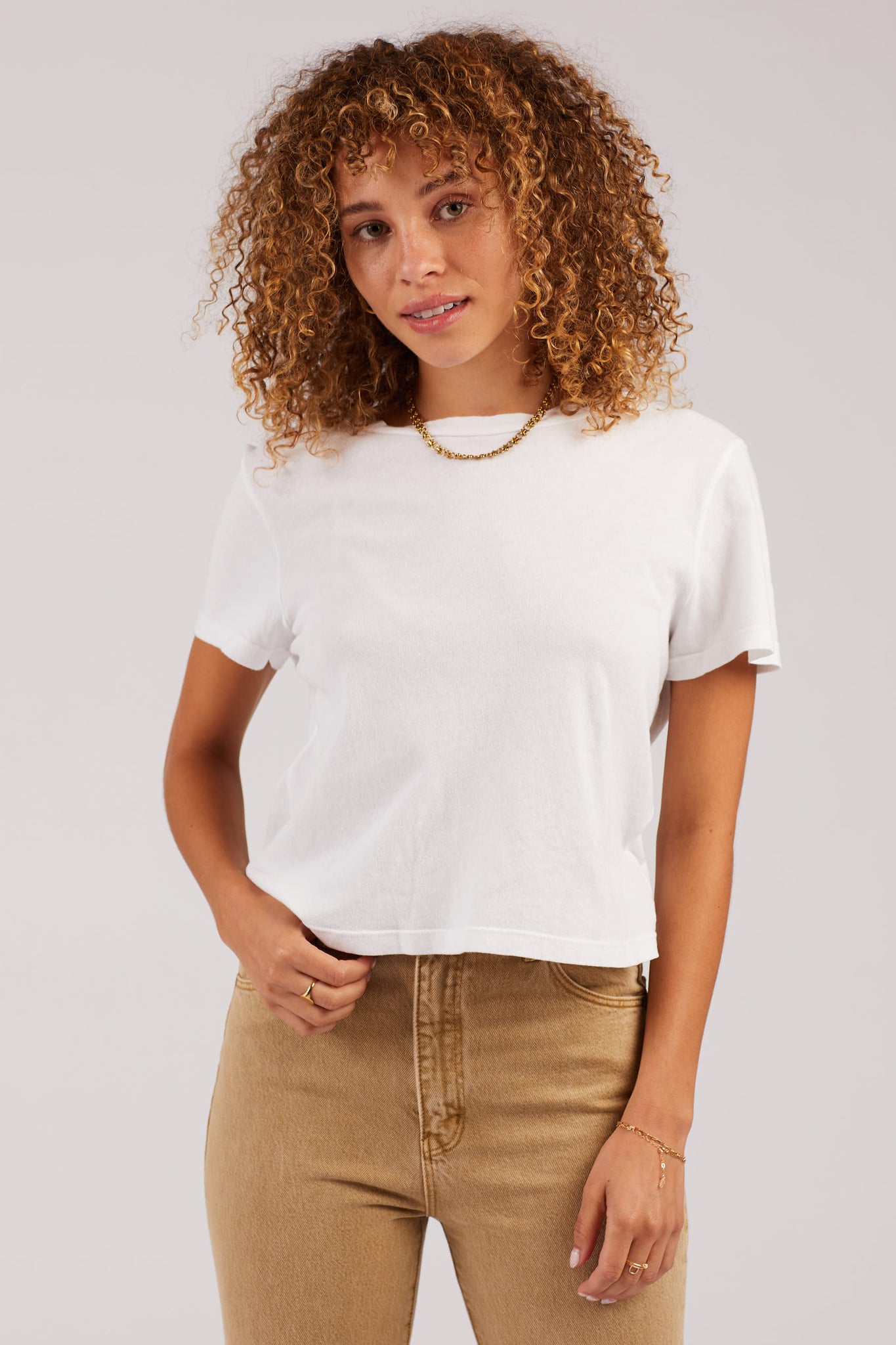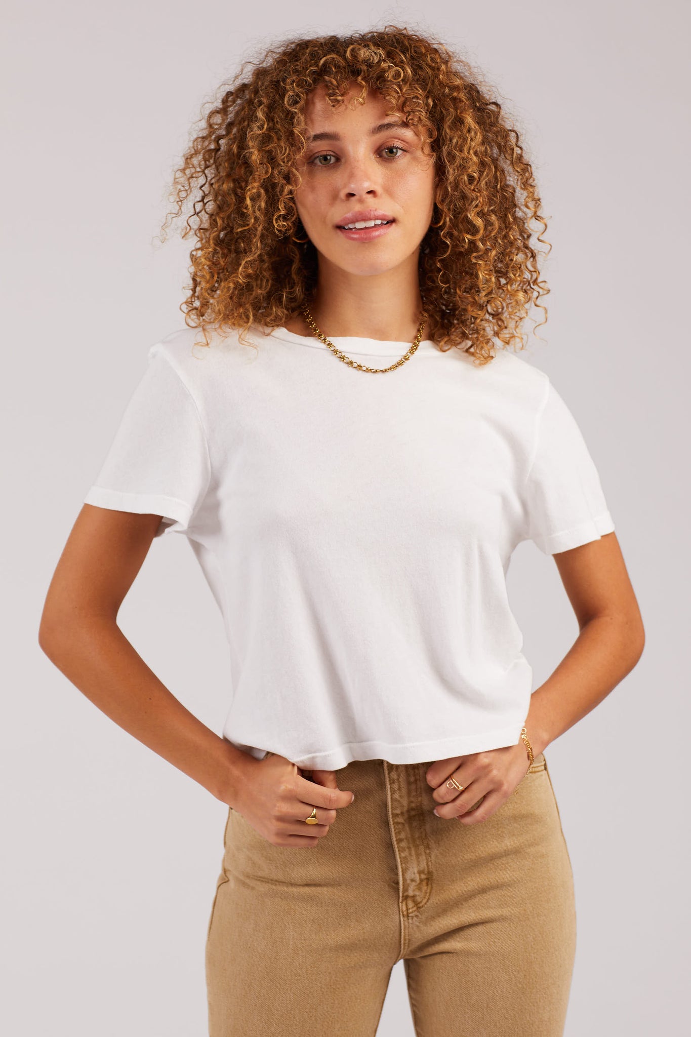 The Foster Tee is the perfect cropped tee- with short sleeves and a crewneck. Made from the softest knit. Wear with anything high waisted.